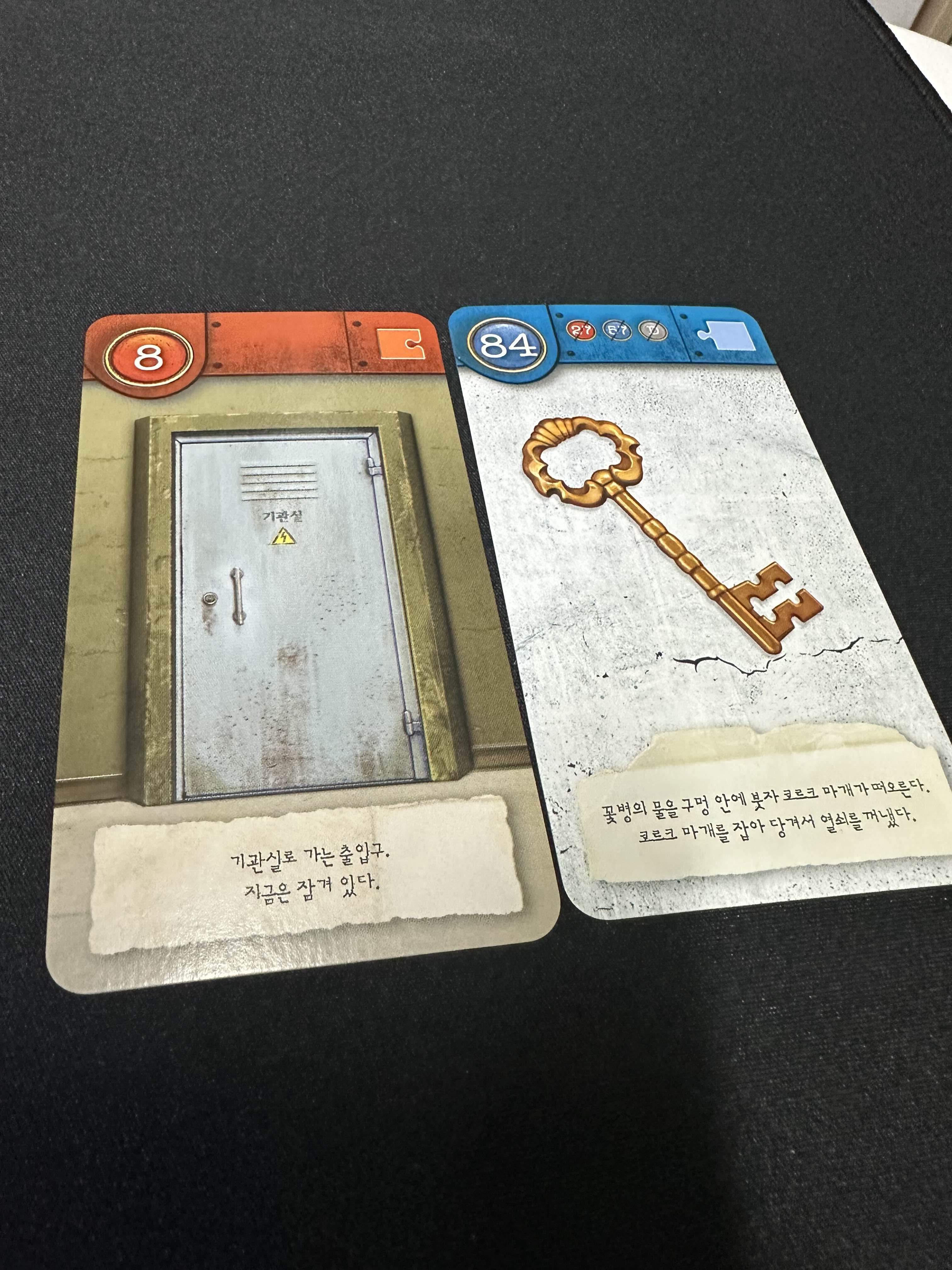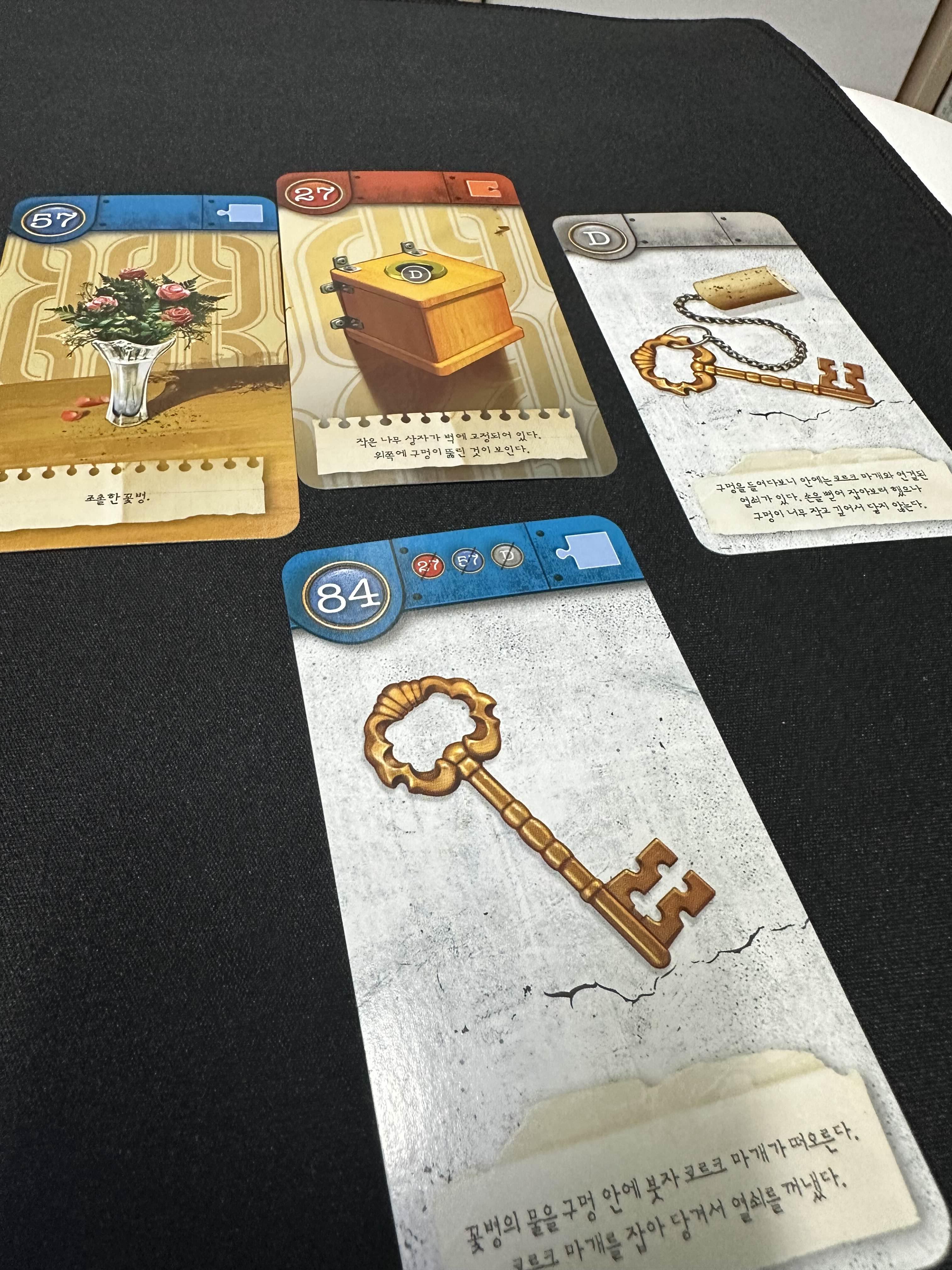 57번 카드의 꽃병과 합쳐 84번 카드를 뒤집으면 열쇠를 찾을 수 있다.