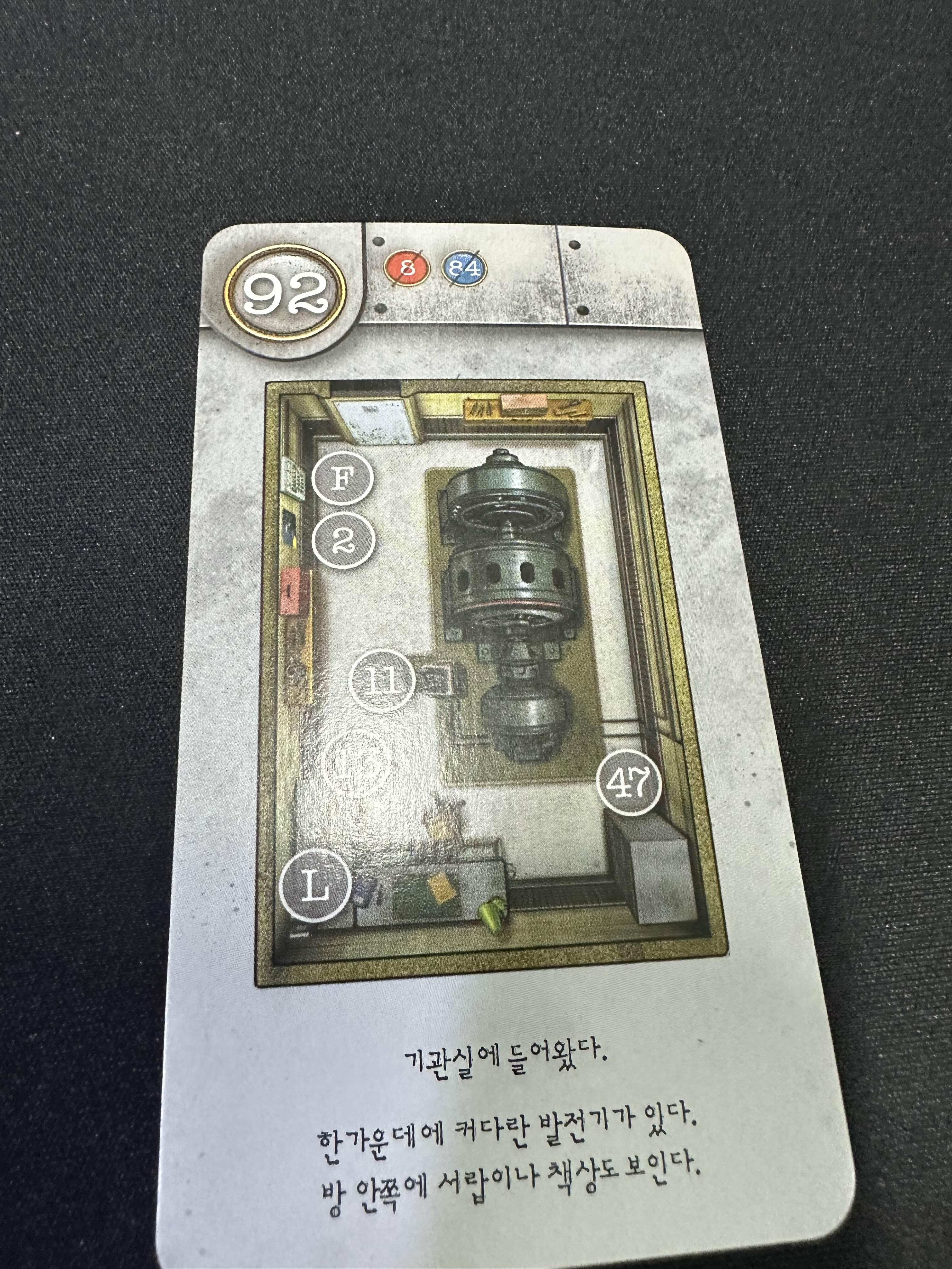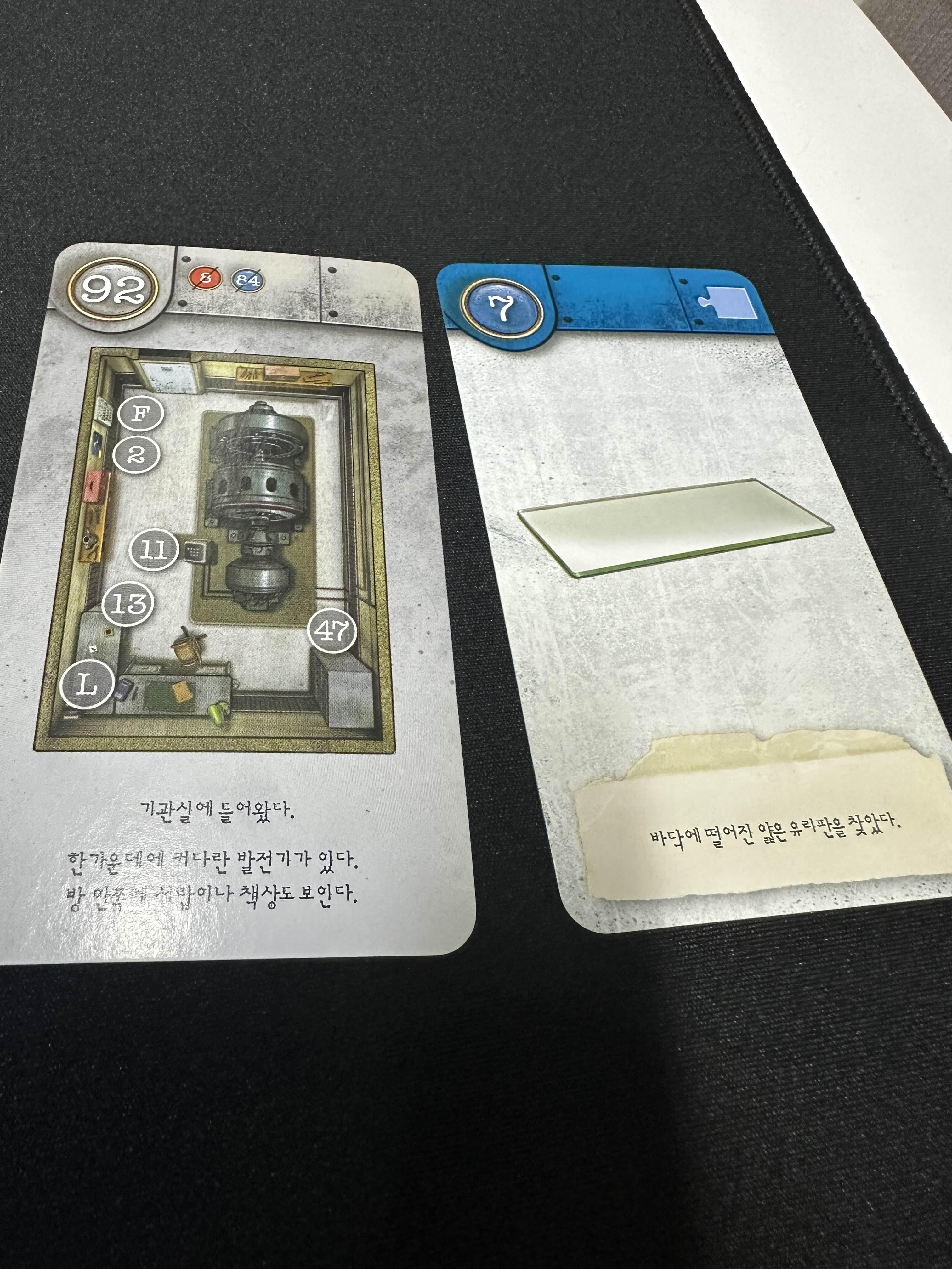 92번 카드를 잘 보면 기관실 오른쪽 위의 7이라고 적혀있다. 7번 카드를 뒤집으면 유리판이 있다.