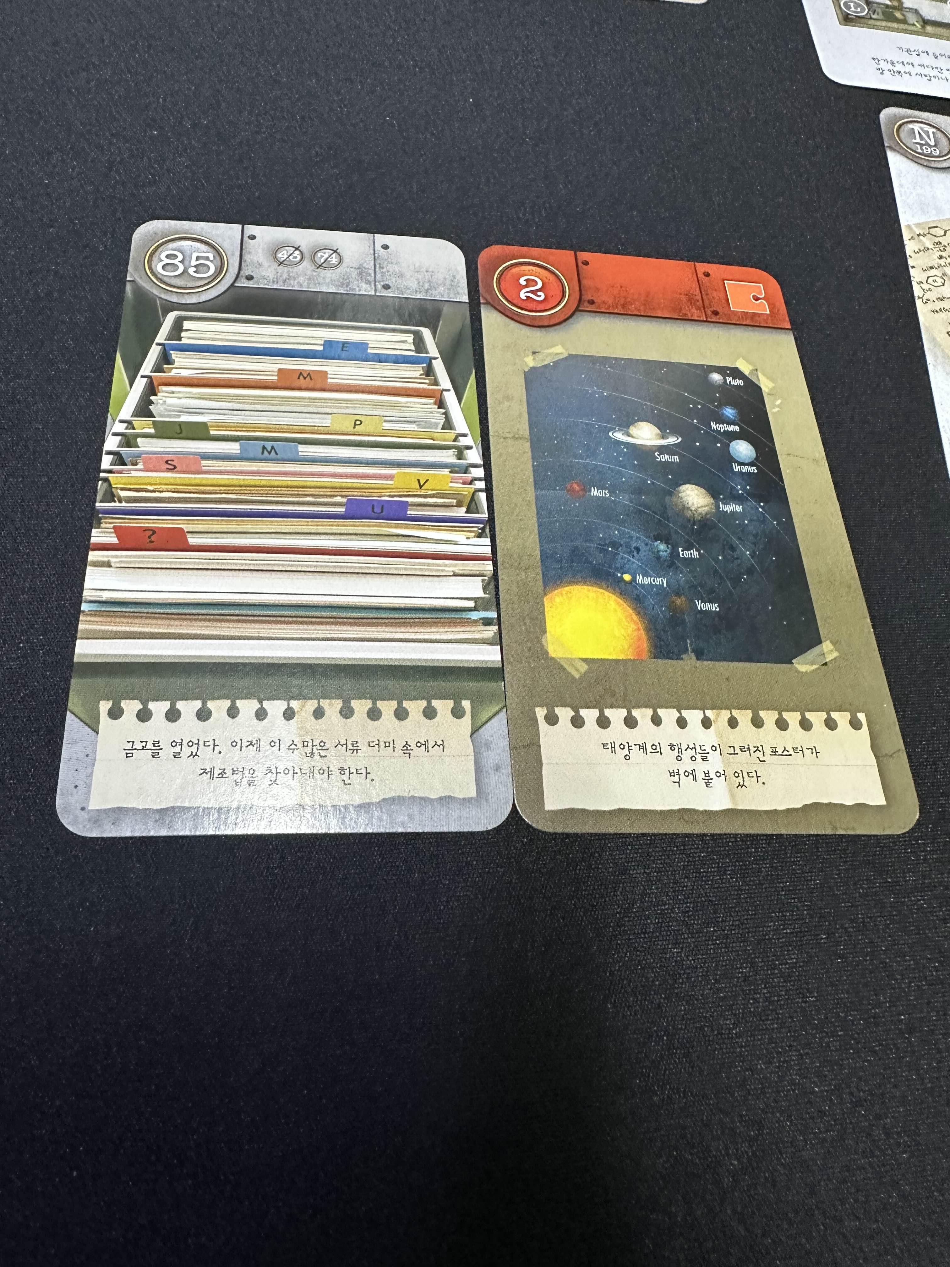 서류더미의 알파벳이 2번 카드의 행성 앞자와 일치하는데 그중 없는 알파벳 이 Neptune의 N이란 걸 알 수 있음