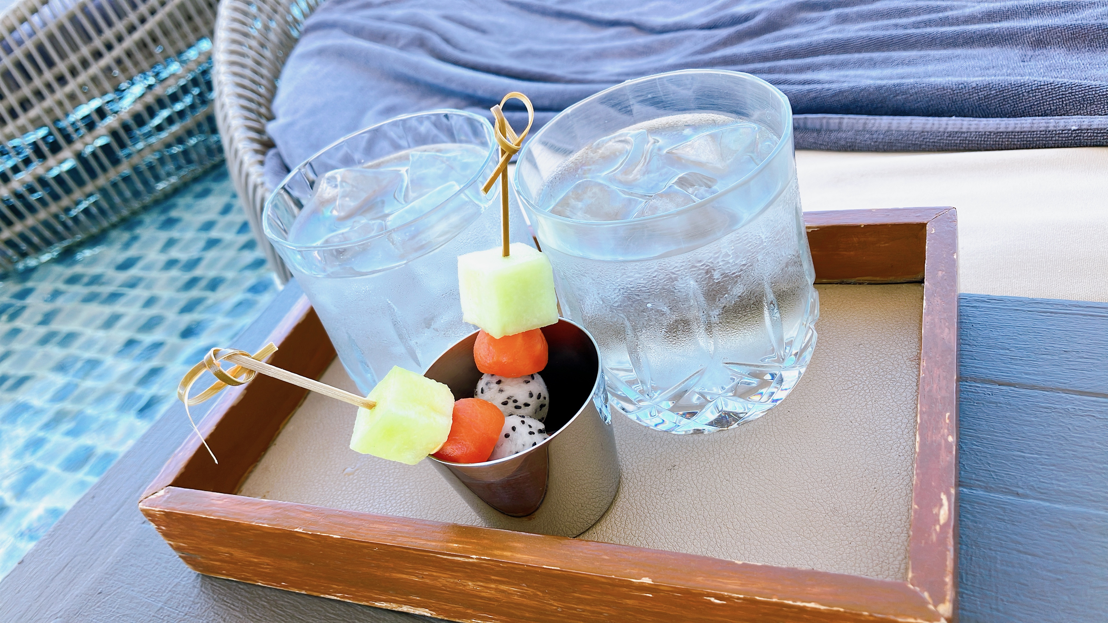 해가 들지 않는 썬베드에 자리를 잡으면 직원이 와서 자리에 수건을 깔아주고 물과 과일을 내준다. 다만... 차가운 얼음물이라 추워서 거의 마시지 못했다. ㅋㅋ 아침에는 사람들이 거의 없어서 좋았는데 다만 해가 안 들어서 너무 추웠다. 그래도 수영장에서 보이는 왕립 골프 코스를 내려다보면 아주 좋다.