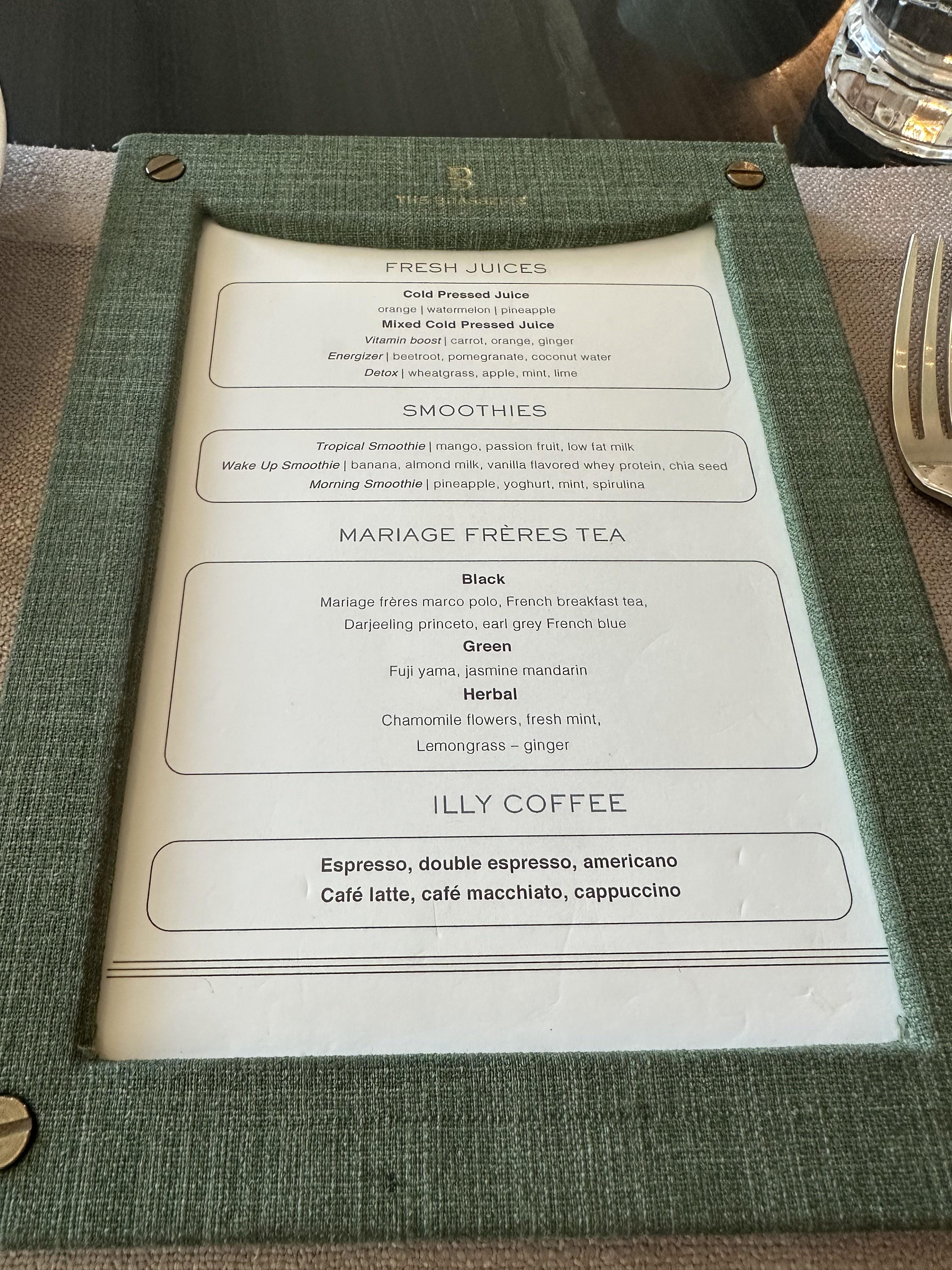 여기서 시킬 수 있는 건 다시 카운터로 가서 시킬 수 있기 때문에 아무거나 골라도 상관이 없다. 우리는 Truffle Egg와 Shakshouka를 하나씩 시키고 Wake up smoothie와 Tropical Smoothie를 시켰다. 커피도 하나씩 시켰는데 일리(Illy) 커피로.... 맛은 그저 그랬다. 뭐 사실 조식에서 커피가 맛있으면... 반칙이지 ㅋㅋ