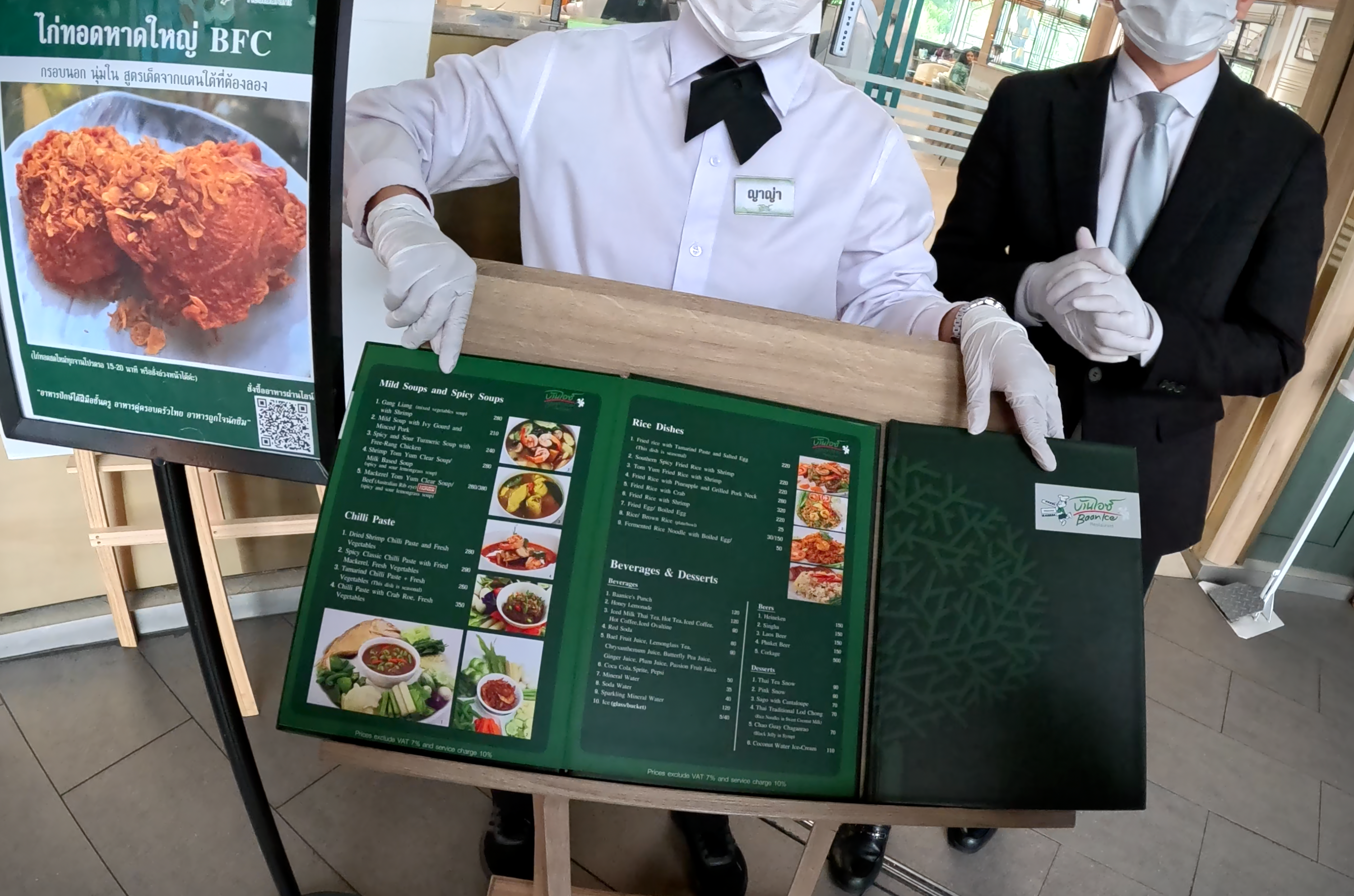 태국의 음식점을 가보면 메뉴판이 밖에 있는데 그 메뉴판 앞에 종업원들이 서서 어떤 음식이 있는지 소개를 해주고 들어가려고 하면 안내를 해준다. 너무 친절해서 약간 부담이 되기도 하지만 그래도 뭐... 문화려니 생각을 하는 게.. ㅋㅋ 물론 호객 행위의 일환일 수도 있지만 완전한 관광지처럼 여기 들어오라고 마구 호객 행위를 하는 정도는 아니니 괜찮은 편이다. 매장으로 들어가면 안내를 해주는데... 생각보다 에어컨을 빵빵하게 틀어두었고 너무 추워서 좀 놀랐다.