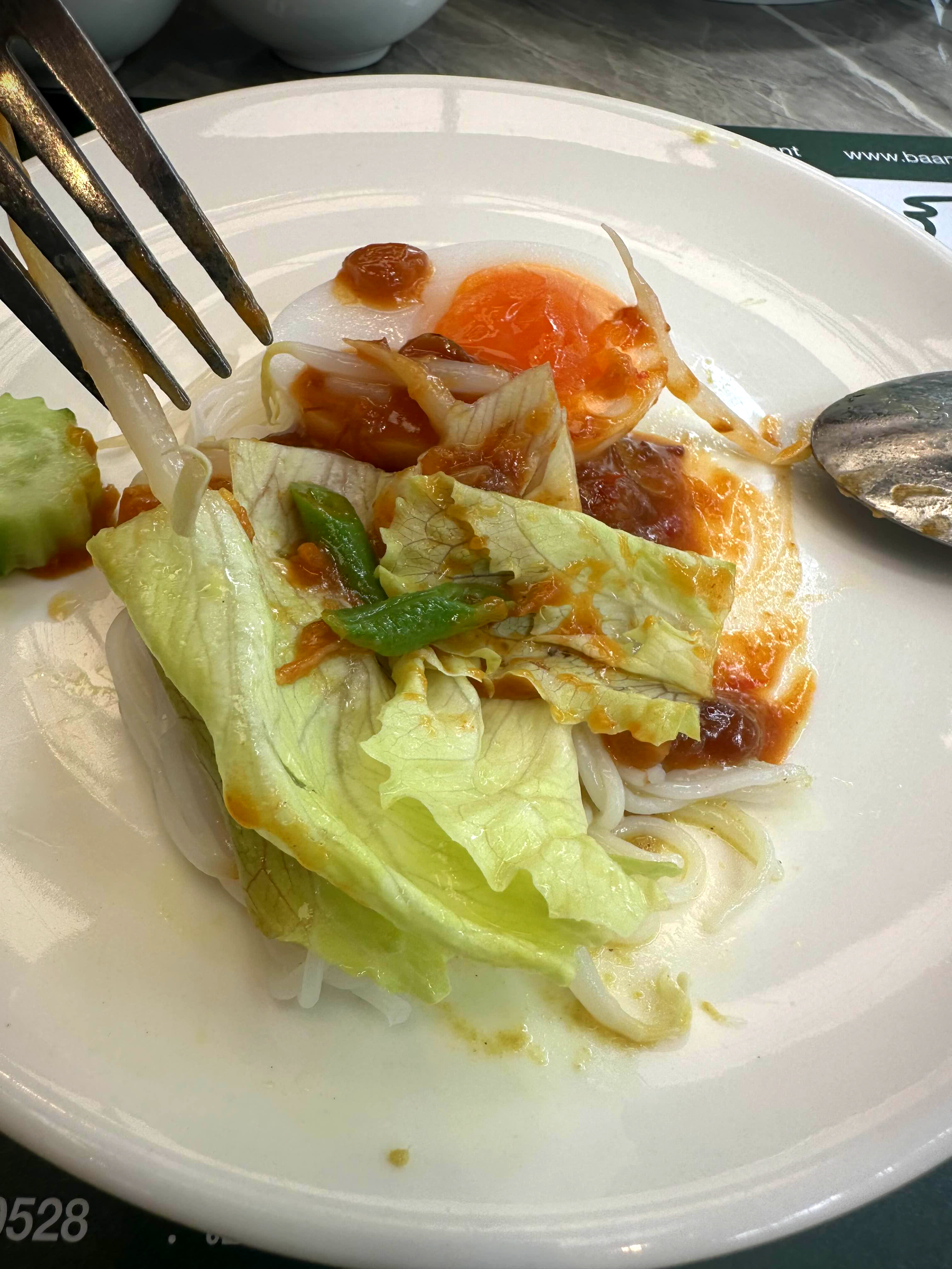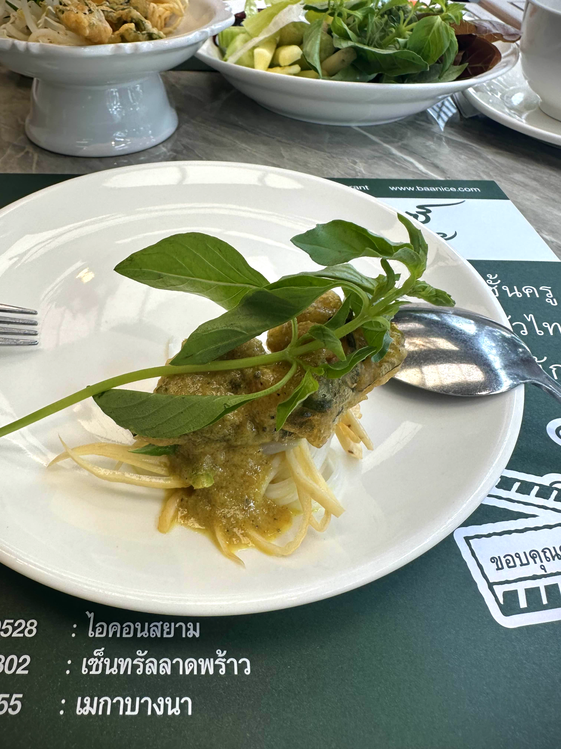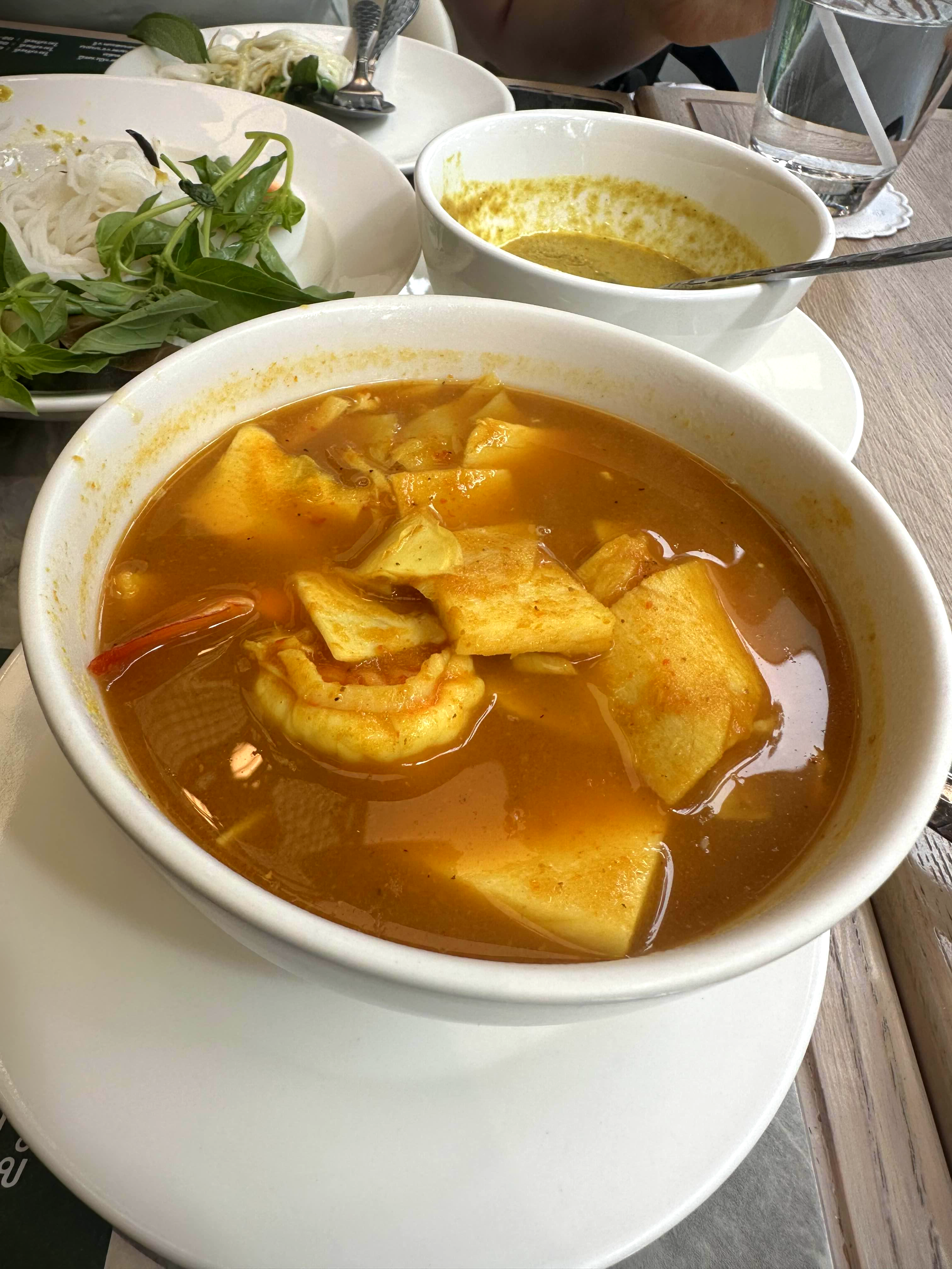 우리가 시킨 것은 3가지로 국수와 야채 그리고 튀김을 카레에 뿌려먹는 카레, 그리고 새우가 들어간 옐로 커리 스프, 마지막으로 칠리 페이스트를 얹은 소고기 볶음을 시켰다. 사실 처음 시킨 카놈찐(카레 국수)은 이 집의 시그니처 메뉴라고는 하는데 그렇게 맛이 그렇게 강하지 않았다. 두 가지 종류의 카레가 나오는데 하나는 칠리와 토마토 베이스의 카레이고 다른 하나는 생선 베이스의 그린 코코넛 카레였다.