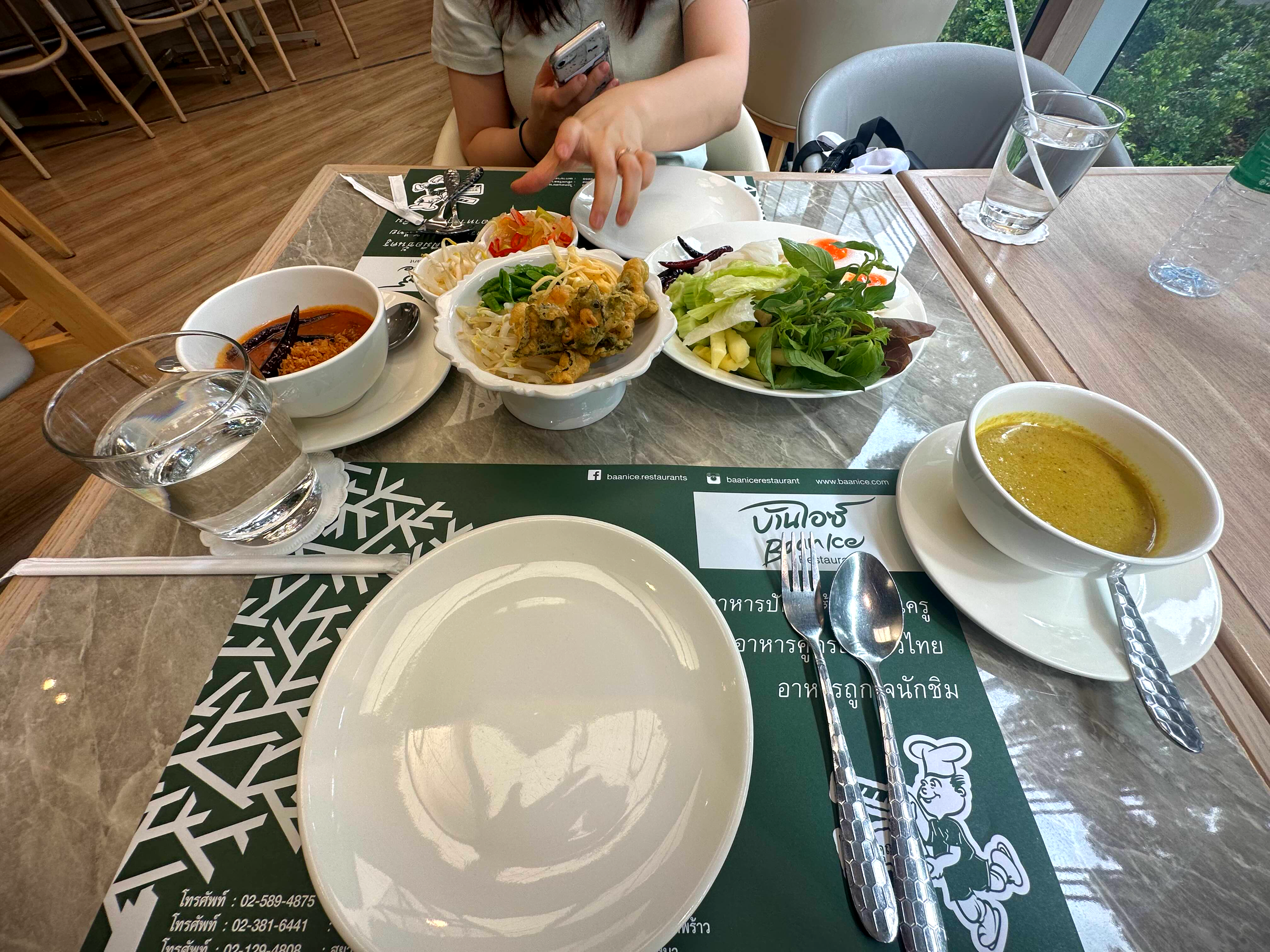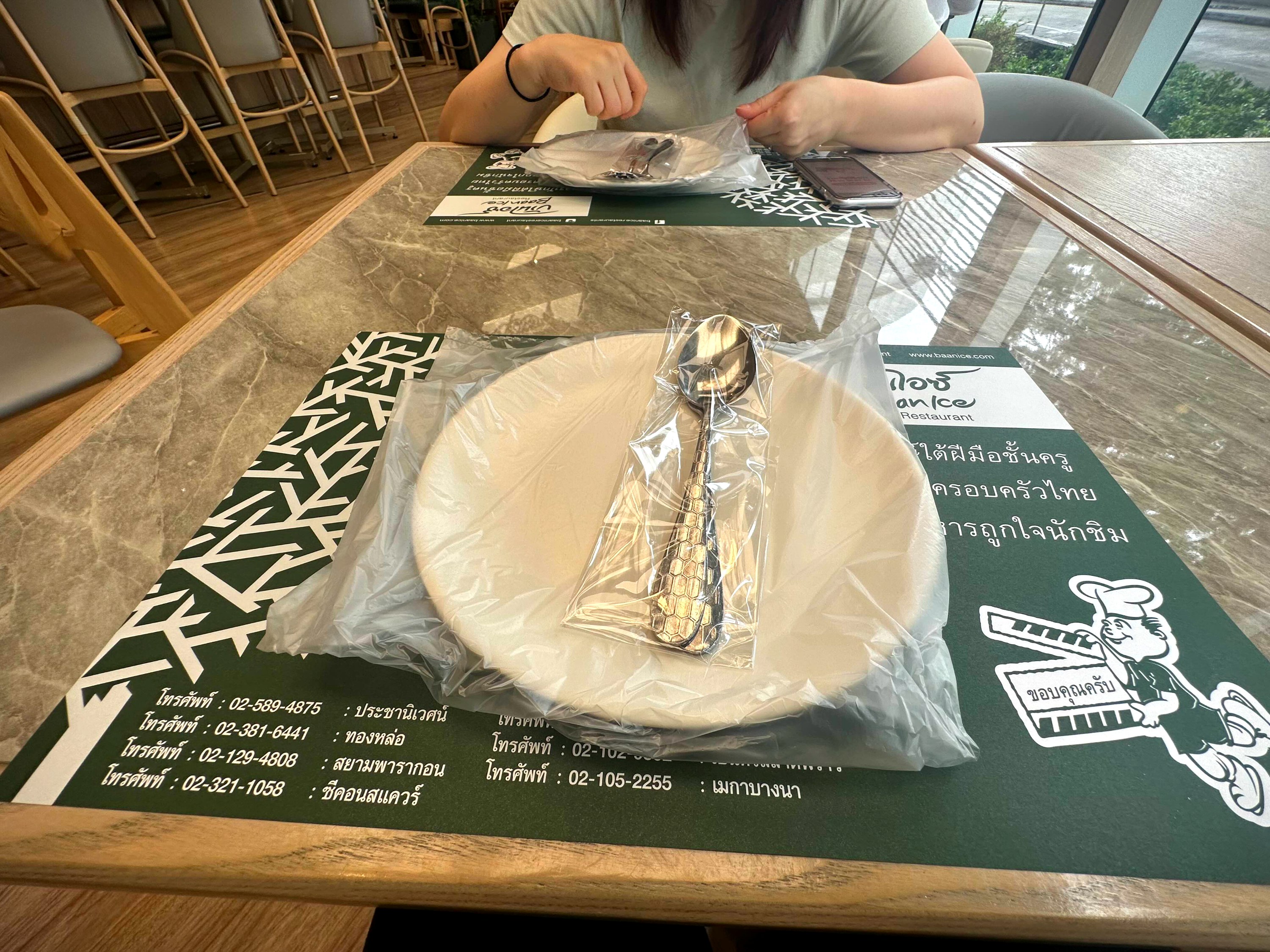메뉴를 시키면 그릇과 수저 포크를 가져다준다. 그런데 이 모든 게 비닐에 들어가 있다. 혹시 잘못 생각해서 그릇을 비닐을 씌워서 사용하려는 건가 할 수 있겠지만 모두 벗기고 먹으면 된다. 그리고 태국 어떤 레스토랑을 가도 물은 공짜가 아니다. 심지어 카페에서도 물은 공짜가 아니니 고급 레스토랑을 갈수록 물값은 올라간다고 생각하면 된다.