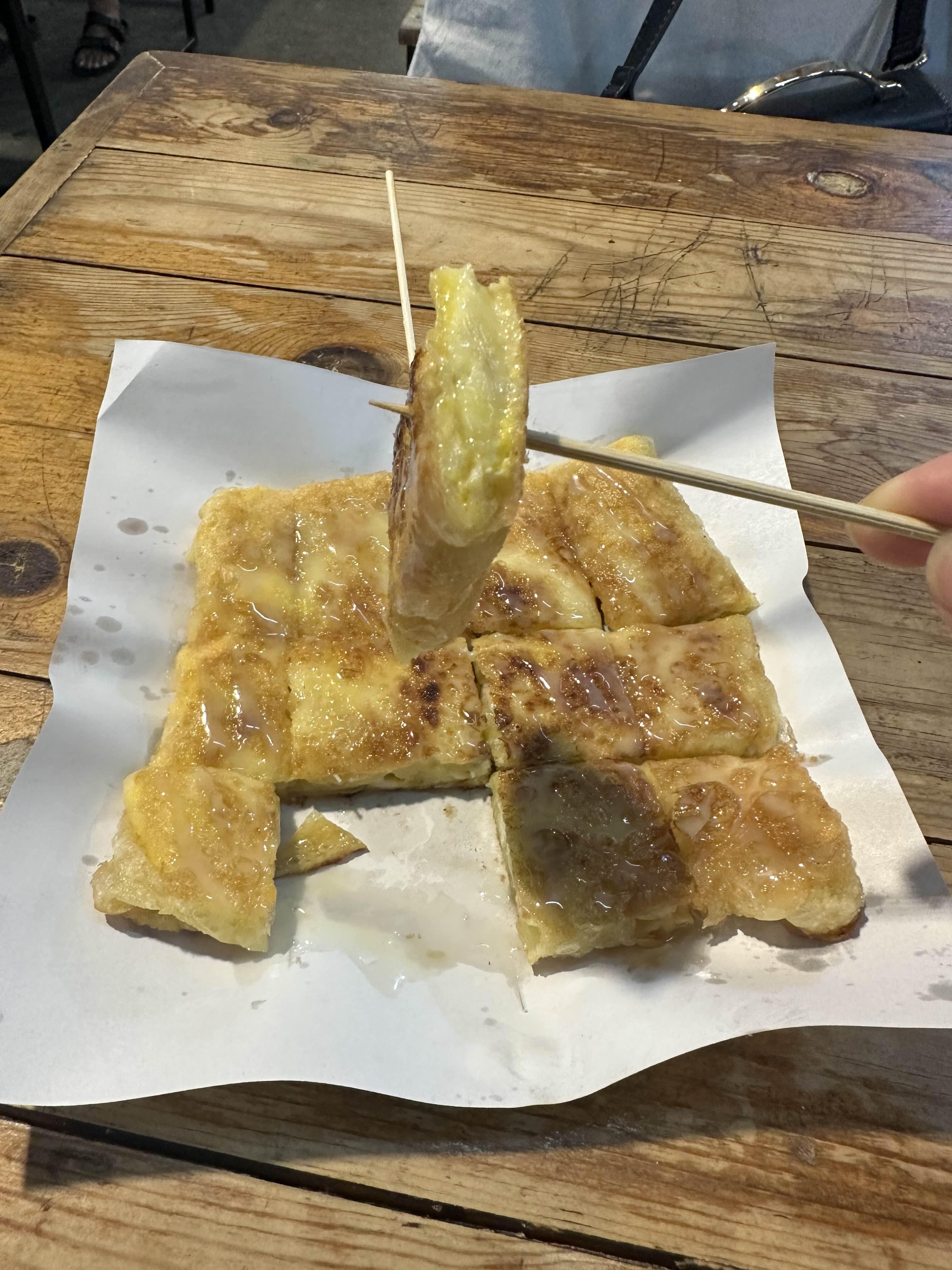 여기서도 역시 계란과 바나나, 연유를 넣은 로띠를 시켰는데... 흠... 우선 가장 큰 문제는 로띠가 너무 익었다는 것이다. 심지어 군데군데 타기도 했는데 재미있는 건 바삭하지 않았다는 점이다. 기름에 절은 로띠의 맛이랄까? 솔직히 맛은 그렇게 있지는 않았다. 왜... 미슐랭에서 빕구르망을 받았는지는 이해가 되지 않았다. 물론 가격적인 면에서 25바트여서 야시장에 있는 것보다 절반이나 저렴했다.