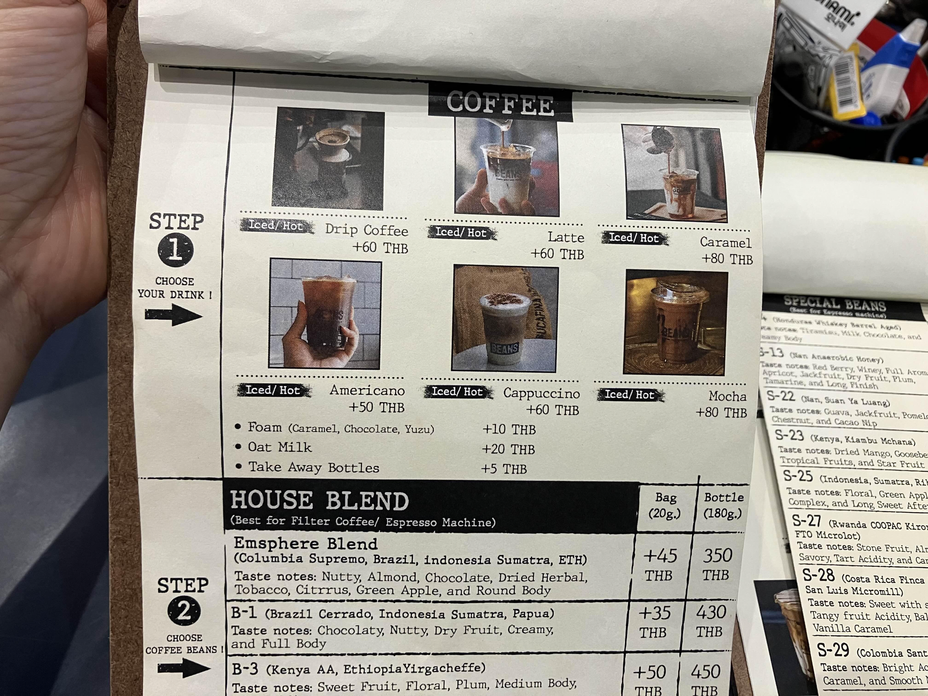 여기 메뉴에 보면 커피를 주문하는 방식이 있는데 커피의 종류를 결정하고 원두를 고르면 된다. 커피는 드립, 라떼, 캐러멜 라떼, 아메리카노, 카푸치노, 모카가 있고 각각의 방식에 따라 추가 금액이 발생한다. 그리고 원두의 종류마다 다 가격이 다르기 때문에 계산해서 주문을 하면 된다. (태국인 점원들이 계산을 틀리는 경우가 종종 있기 때문에 계산서와 영수증을 잘 살펴야 한다.)