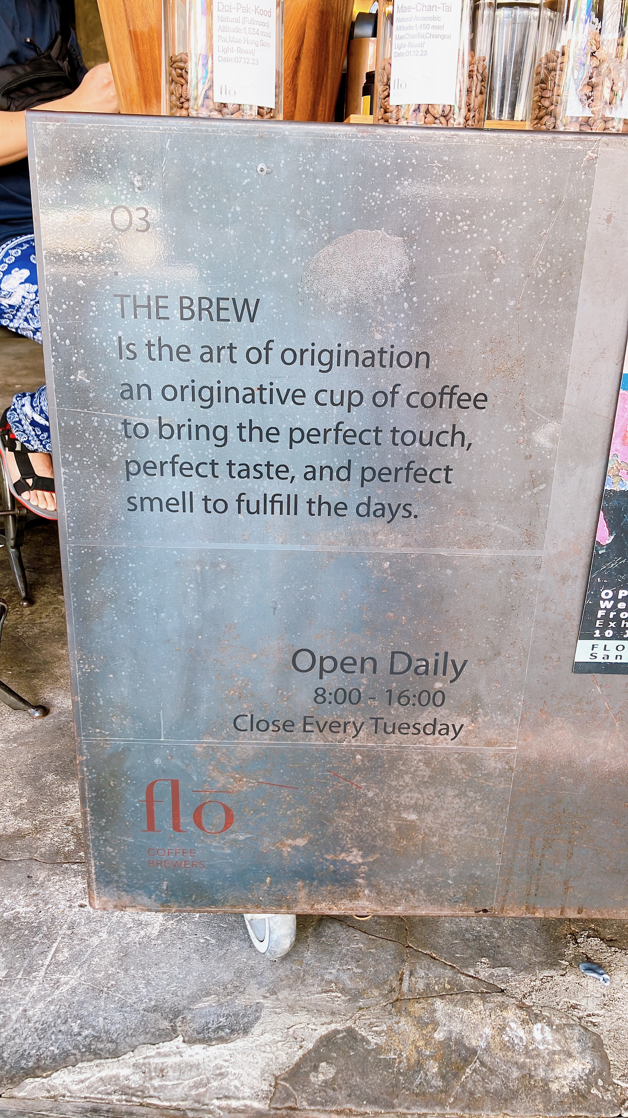 특히 방콕과 치앙마이에는 세련된 카페들이 많이 들어섰고 더 많이 늘어나고 있는 추세라고 한다. 또한 스페셜티 커피를 취급하는 곳도 많이 늘었고 커피 산지이니 만큼 자국 커피를 싱글 오리진으로 취급하는 곳들이 많아졌다고 했다. 그렇게 이번 태국 방문에서 방콕과 치앙마이를 가면서 몇몇 개의 커피집을 방문해 보았는데 태국 커피도 정말 많이 발전하고 있고 프로세싱도 엄청나게 발전하고 있다는 생각이 들었다. 치앙마이에서는 시간이 많이 없어서 2개의 특색 있는 커피집을 가 보았는데 그중 하나가 Flo Coffee Brewers이다.