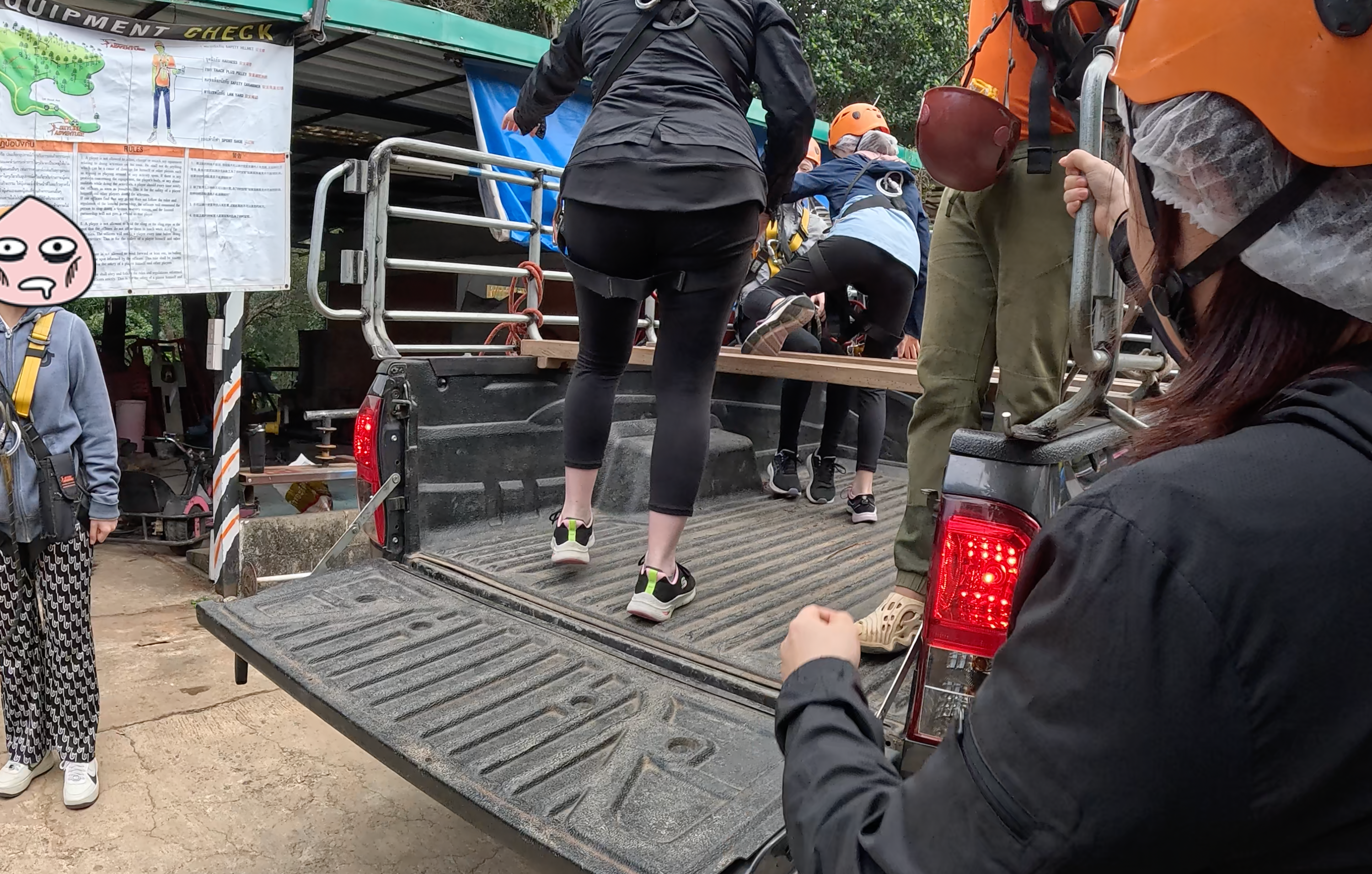 헬멧과 하네스를 차고 안전 교육까지 들으면 본격적으로 집라인(짚라인)을 타기 위해서 다시 트럭 뒤에 타고 산을 오른다. 거의 10분 정도를 올라가는데 완전 비포장 산악 지대이기 때문에 차량 옆 봉을 잡지 않으면 튕겨져 나갈 정도로 흔들린다. 트럭을 타라고 하면 망설이지 말고 가장 앞 오른쪽으로 가서 트럭에 설치된 봉을 잡아야 더 안전하고 안정적으로 트럭을 타고 올라갈 수 있다.
