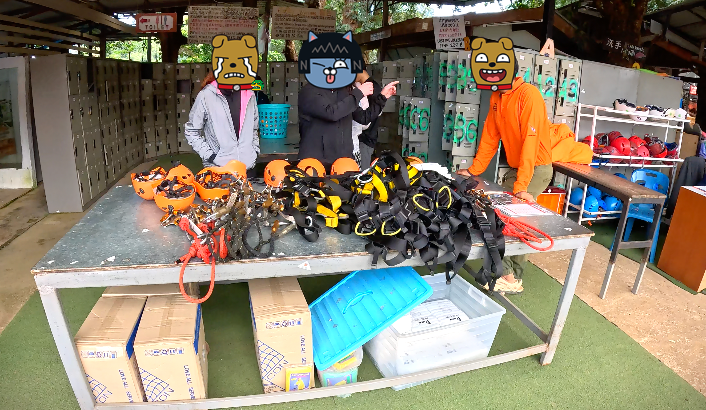 그리고 만일 쪼리나, 샌들을 신고 있으면 매장에 구비되어 있는 신발/크록스를 신으라고 하기 때문에 운동화를 신고 가는 것을 추천한다. 생각보다 위생이 좋지 않고, 집라인(짚라인) 코스 내내 철제 계단, 나무다리 등을 건너고 걸어야 하기 때문에 확실히 운동화가 편하다. 그리고 가장 문제는 헬멧인데... 헬멧이 군대 때 썼던 방탄 헬멧을 빼고 이렇게 쓰기 싫은 헬멧은 오랜만이었다.