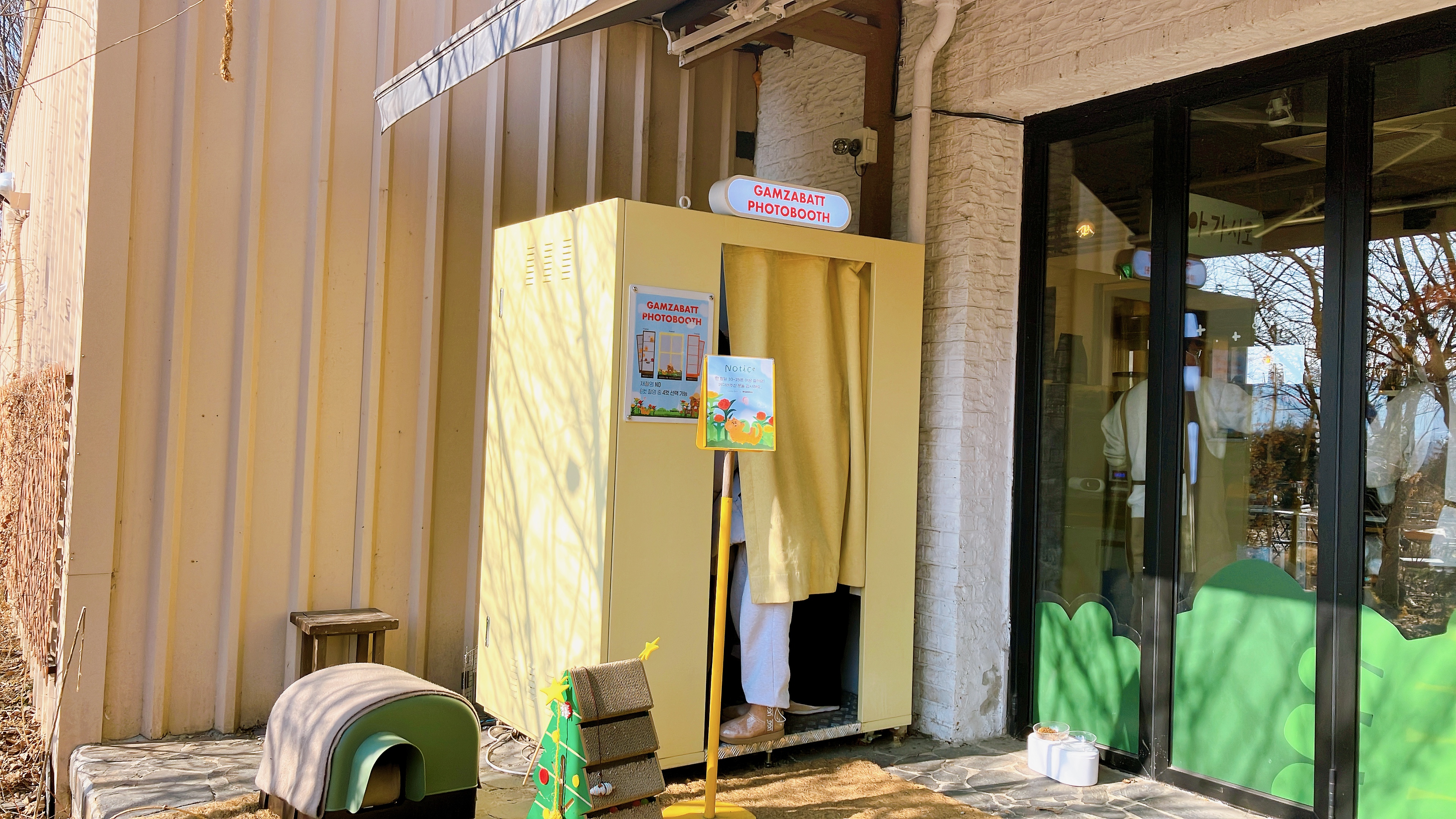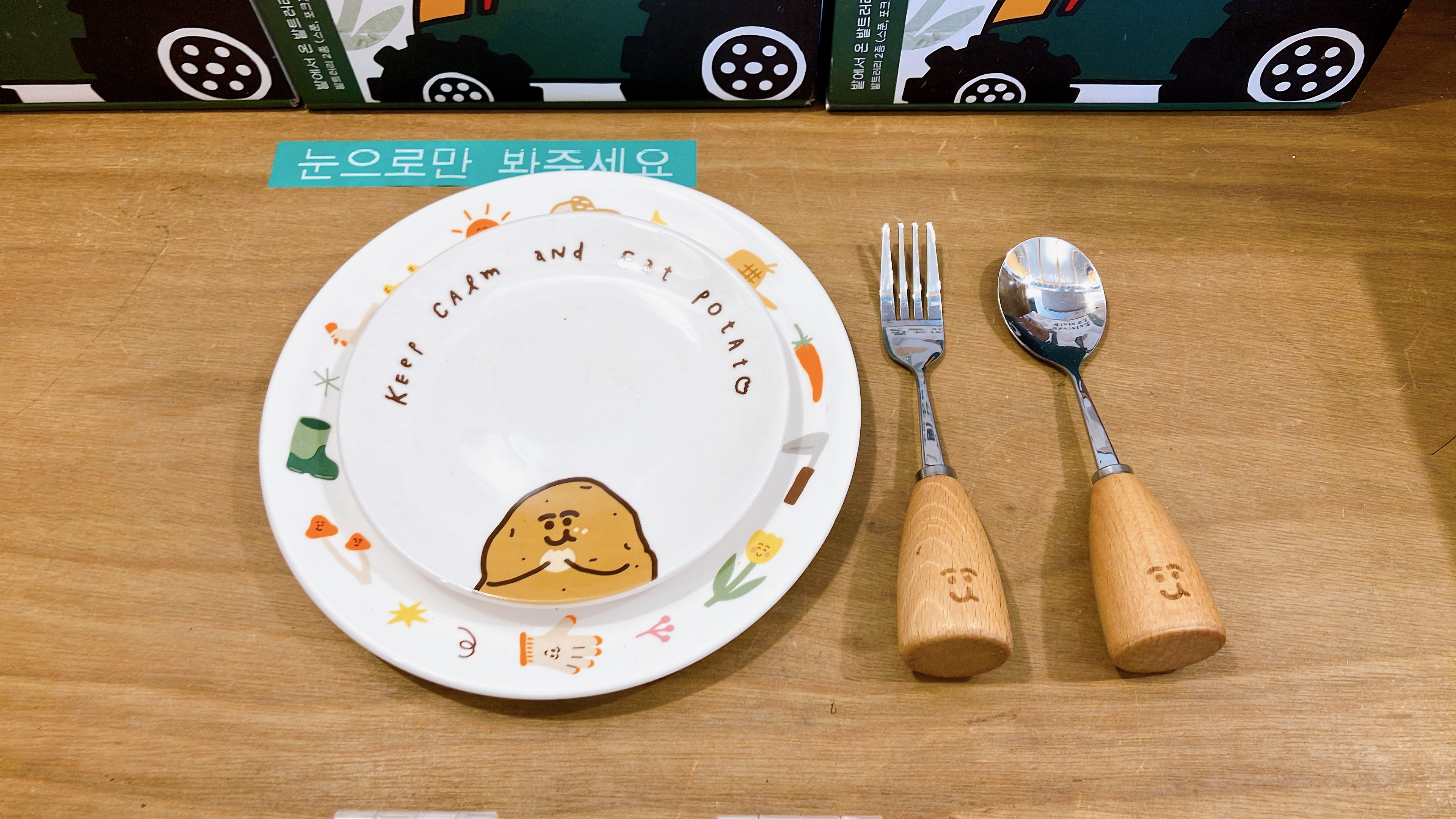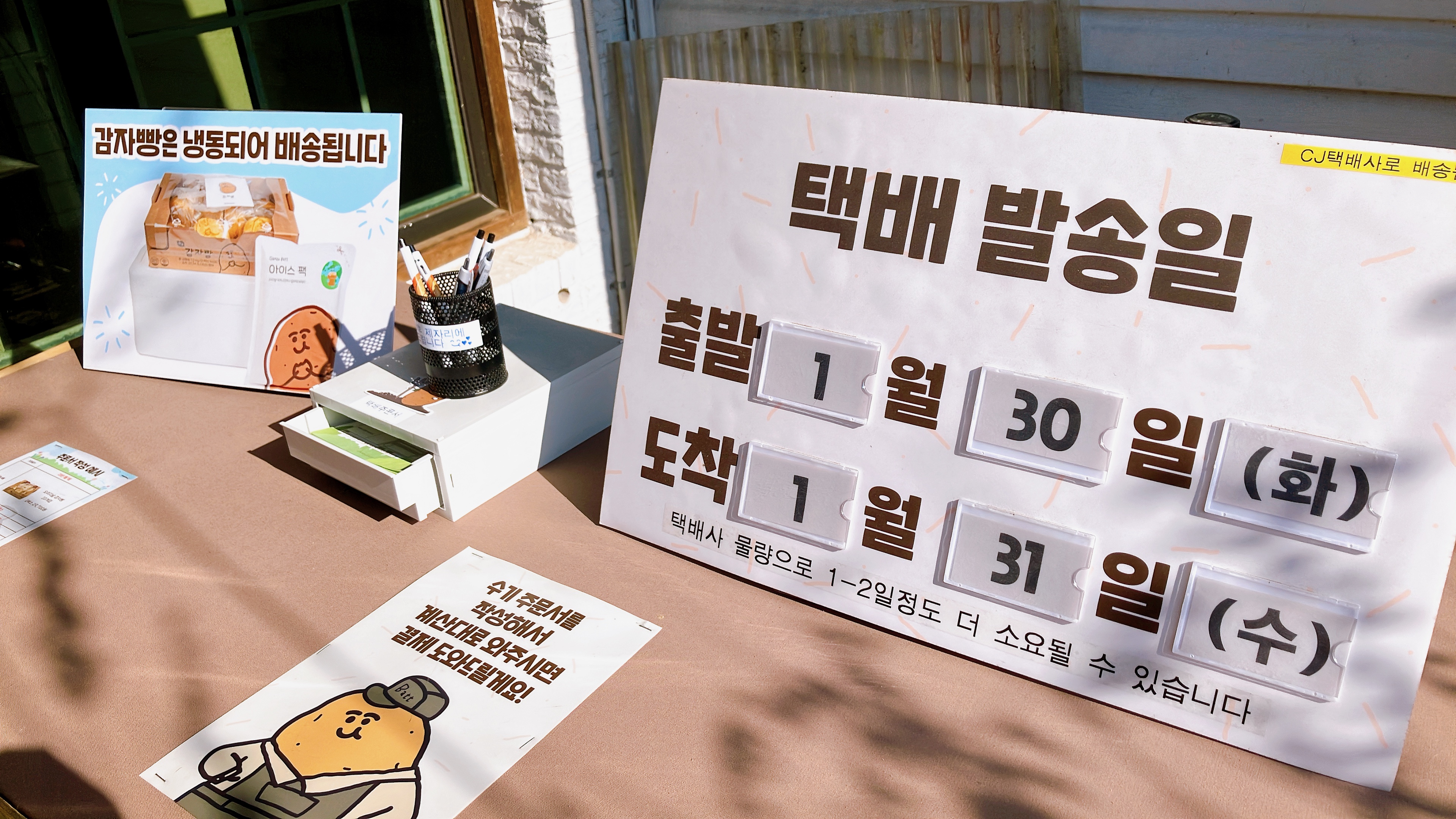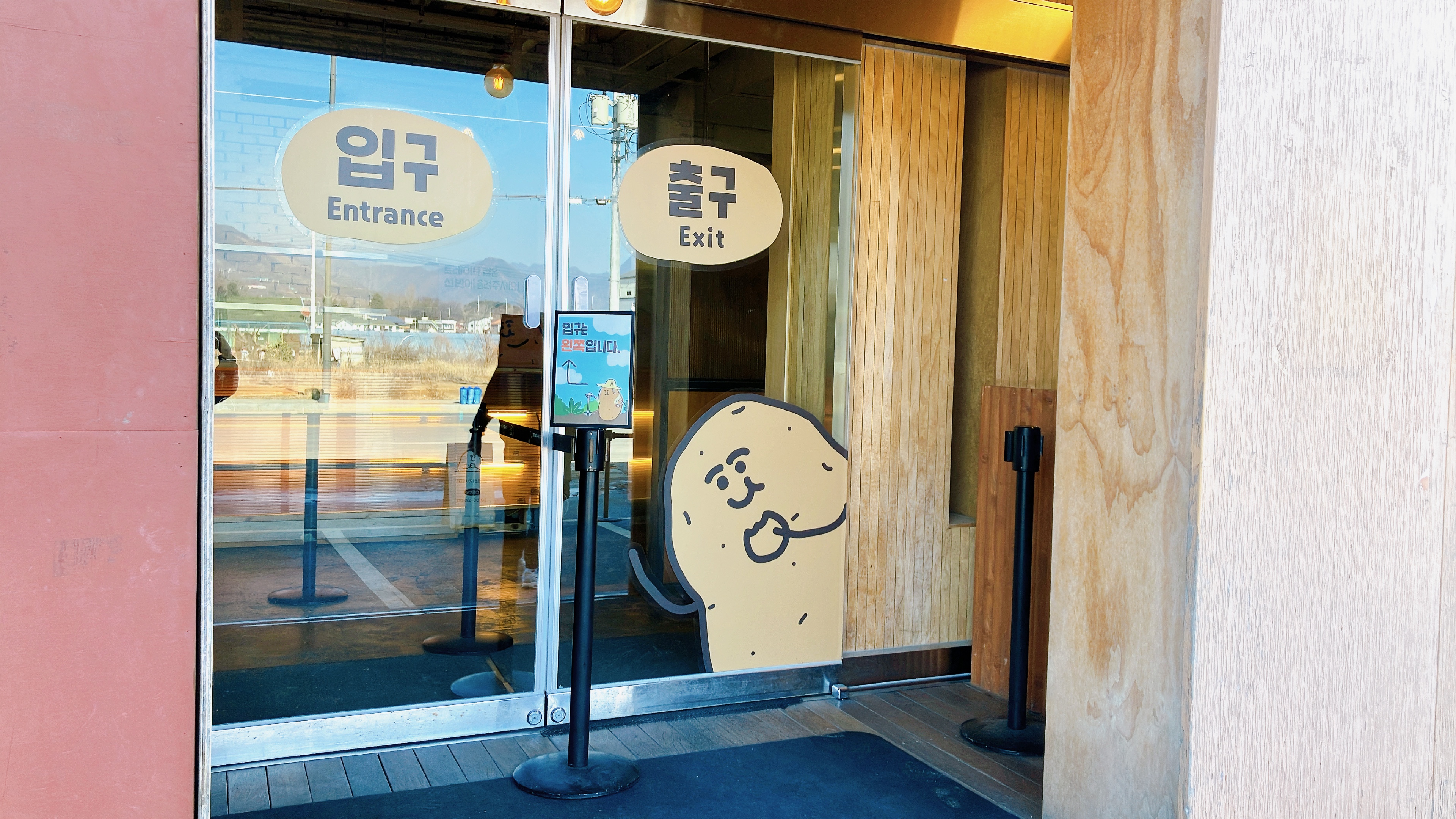 매장 안은 전혀 그렇진 않지만, 입구가 무슨 공장/창고처럼 생겨서 마치 창고를 개조한 것 같은 느낌이 들었다. 귀여운 감자 캐릭터가 맞이하는 출구로 들어가면 바로 아가자기한 굿즈를 파는 곳이 맞이한다. 이 카페/빵집은 구조가 특이한데 좁은 통로를 지나서 감자빵이 있는 곳으로 가면 종업원이 한 명 기다리고 있다. 이때 여기서 먹을 건지 혹은 테이크 아웃을 할지 결정하고 빵을 담게 되는데, 여기서 먹을 거면 빵을 직접 담을 수 있고, 만일 포장을 해갈 거면 이미 포장이 되어있는 박스를 주거나 몇 개를 소분해서 준다.