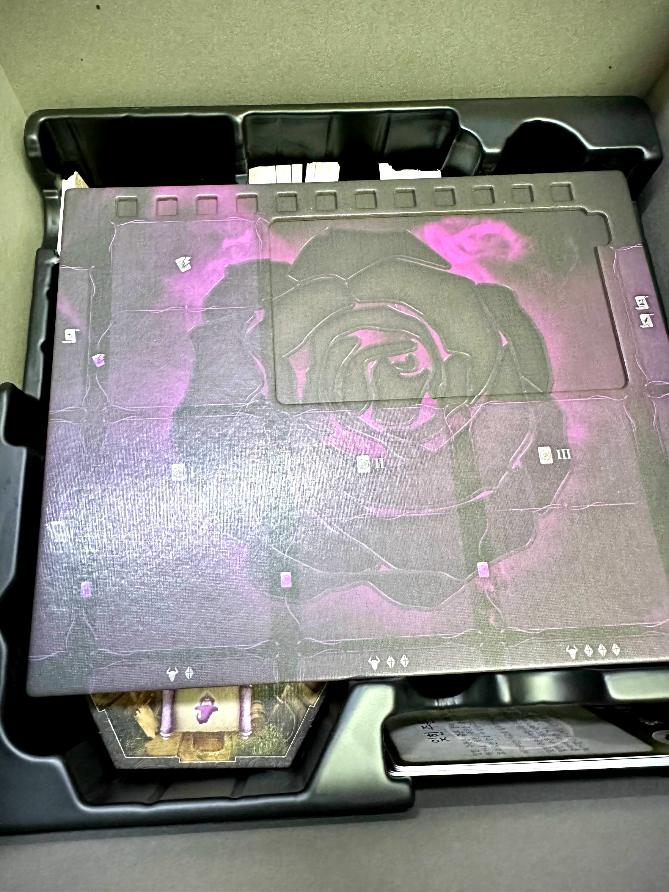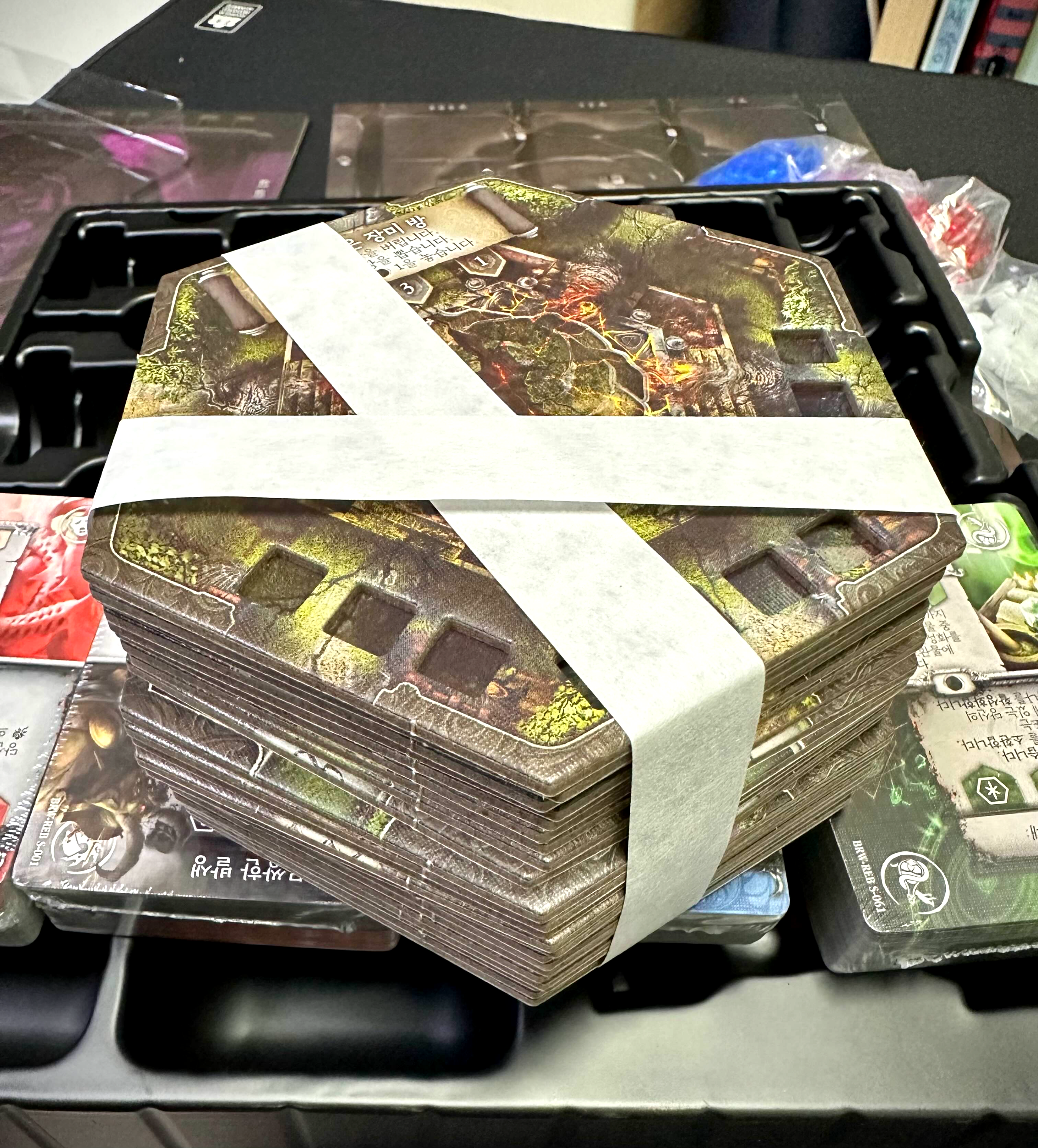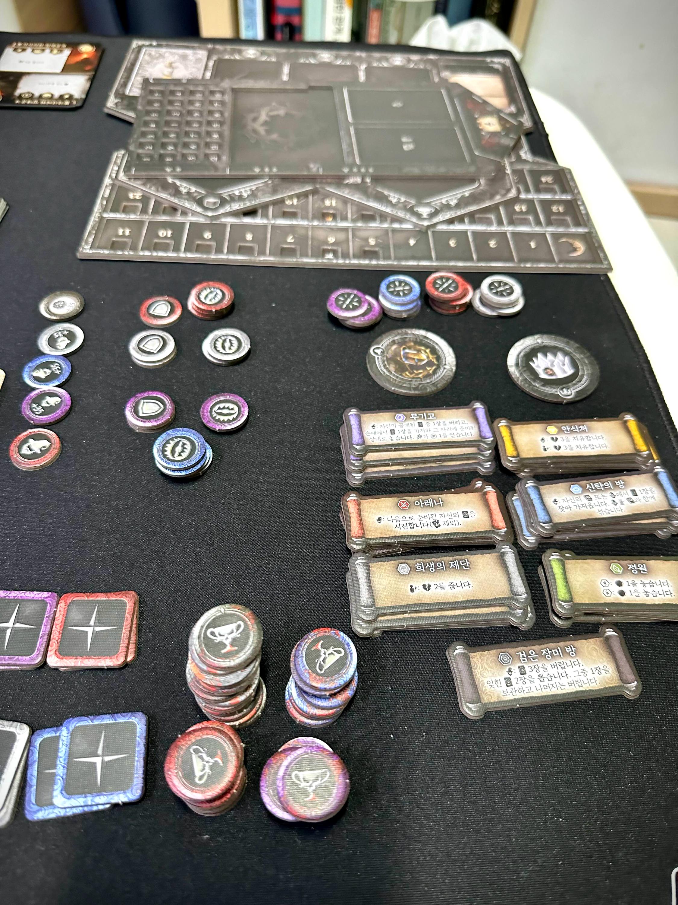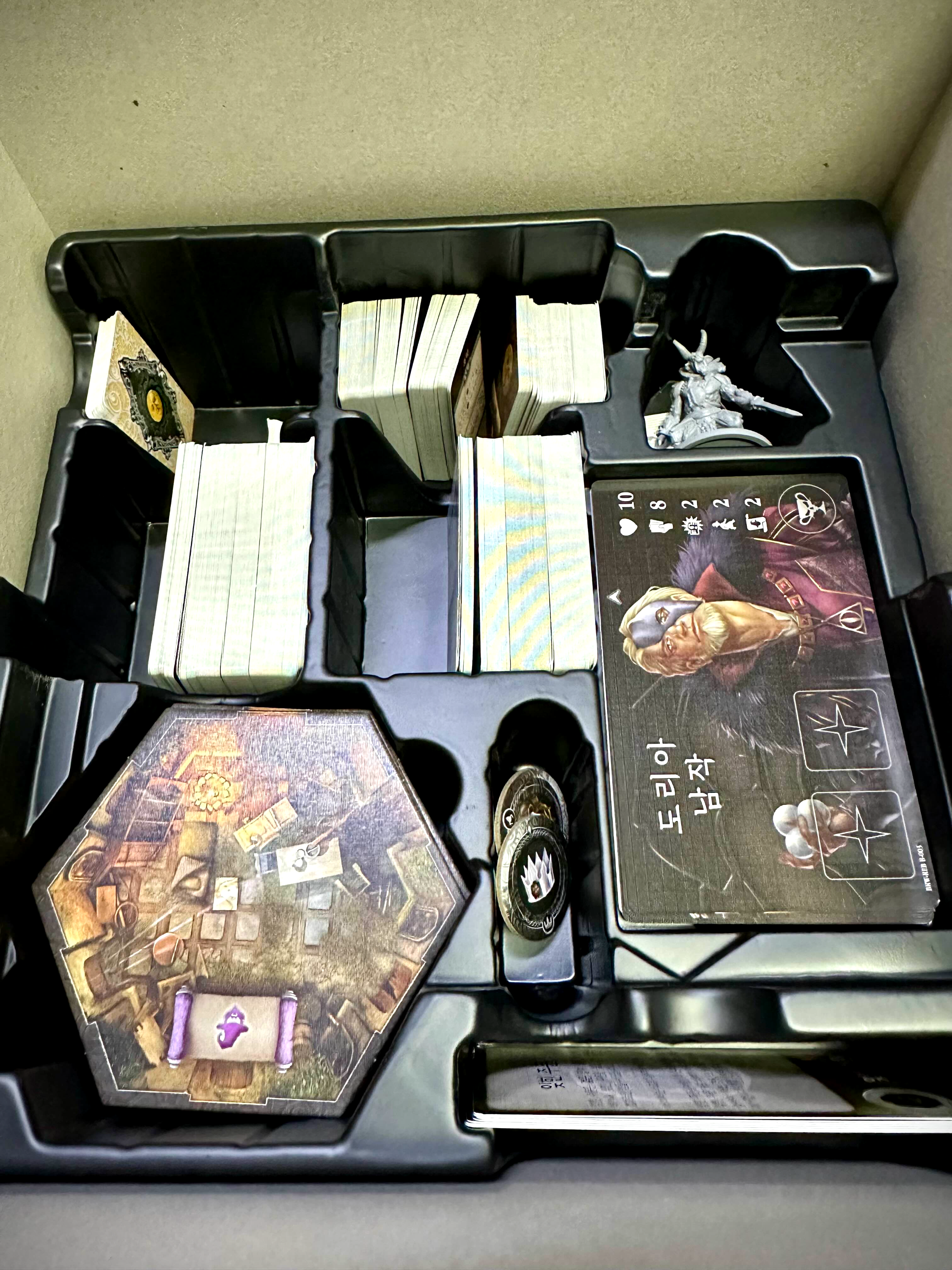예를 들어 본다면 컴포넌트도 압도적으로 많고, 피규어는 작은 녀석들이 Gloomhaven, Forsthaven이다. 반대로 피규어가 압도적으로 많은 녀석들을 Massive Darkness 같은 게임이랄까? 물론 두 게임은 덱빌딩의 요소를 게임의 메인 메커니즘으로 가져가진 않기 때문에 완전히 이 블랙로즈워와 비교할 순 없겠지만 컴포넌트와 피규어의 개수만 놓고 보면 10만 원의 가격이 조금 아깝다는 생각을 하게 된다.