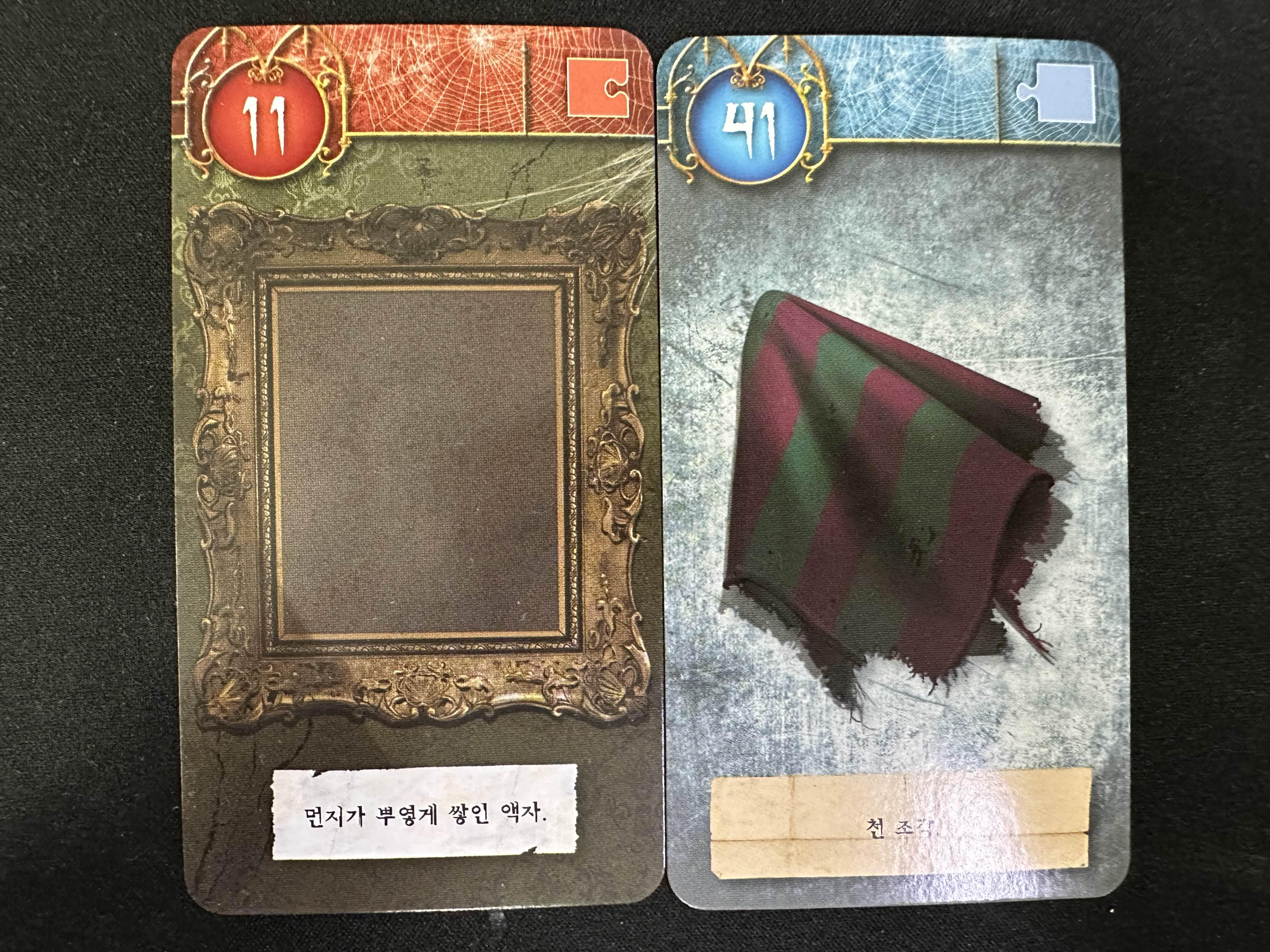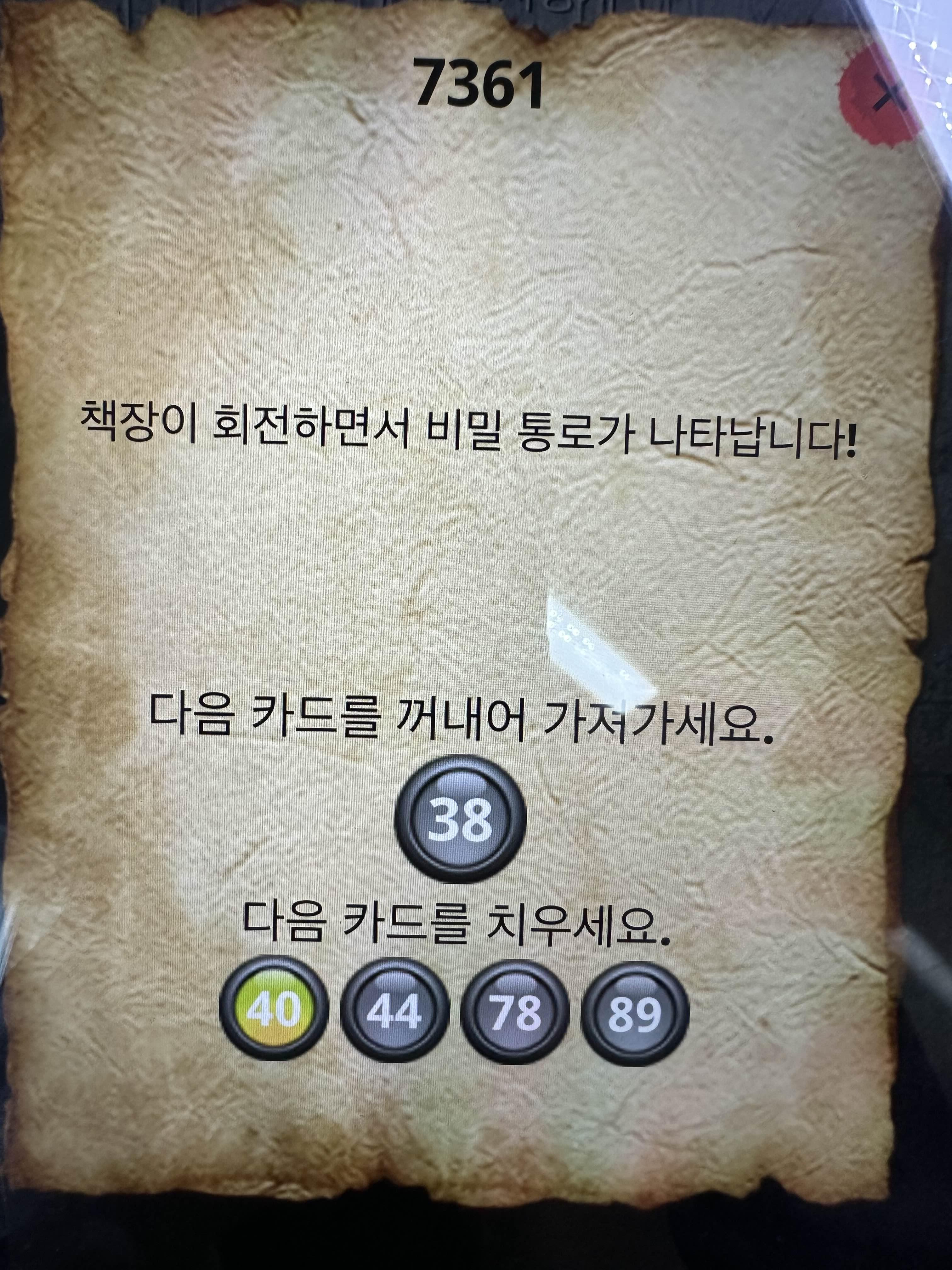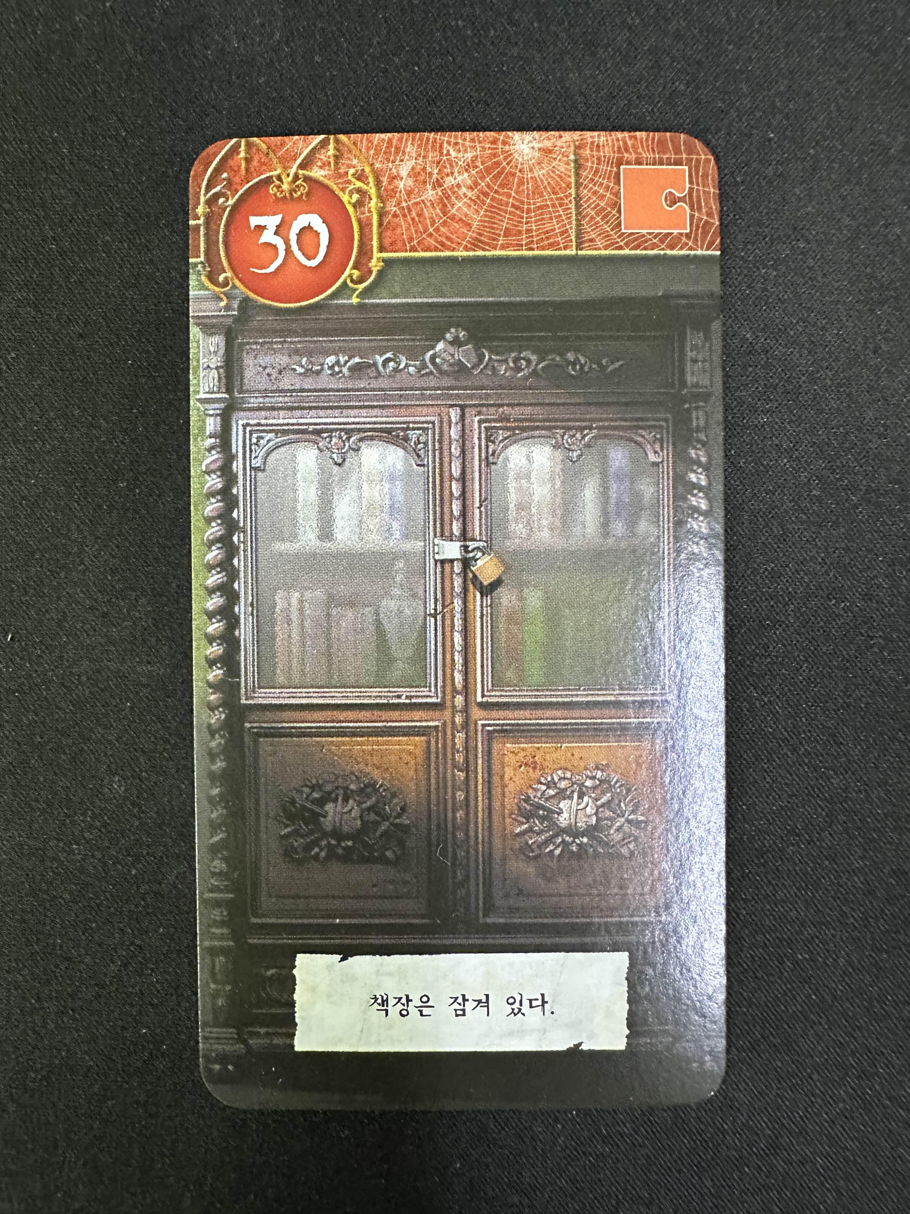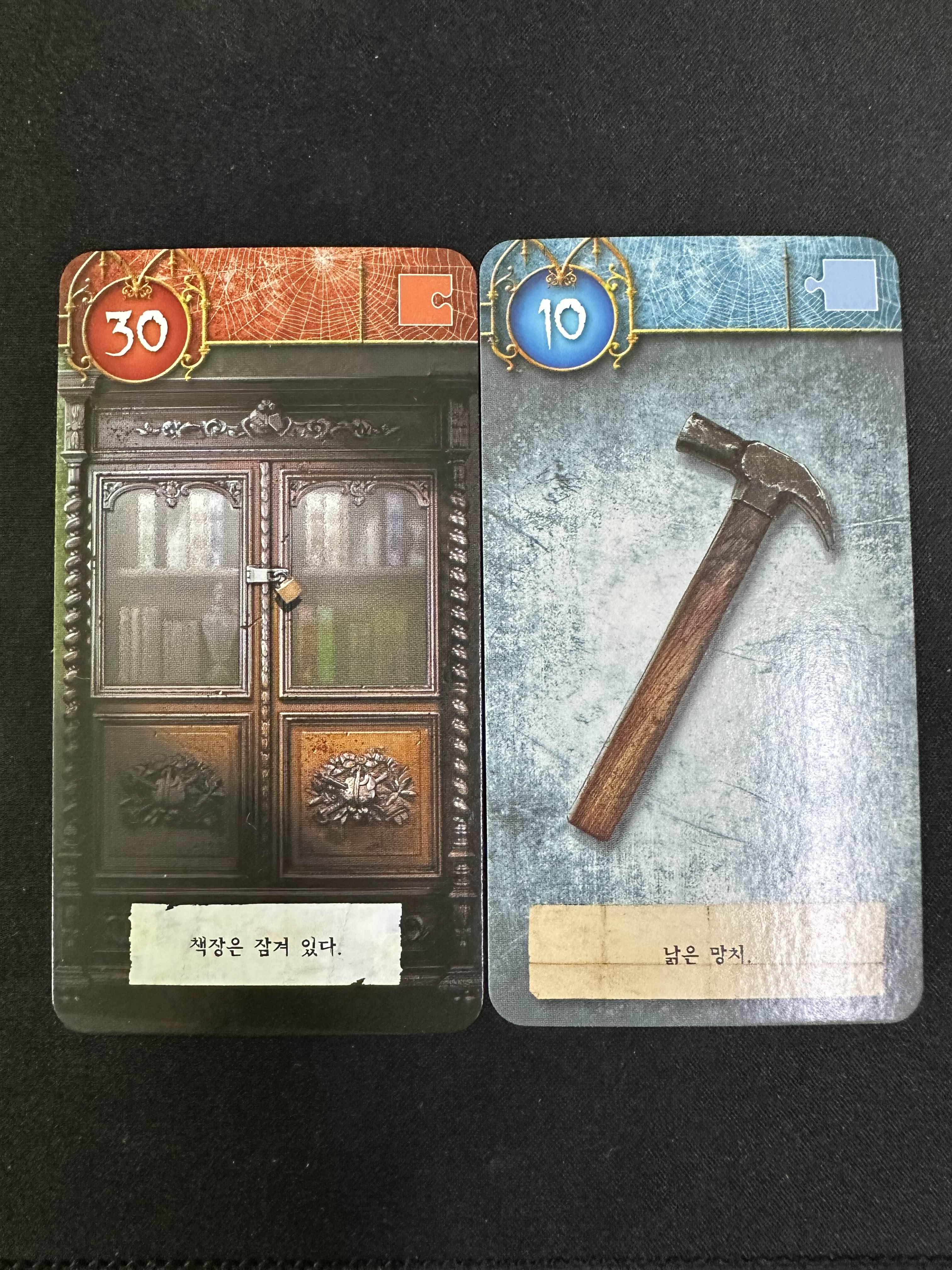 30번 카드와 망치 10번 카드를 합쳐 40번의 유리가 깨진 책장을 얻을 수 있다.
