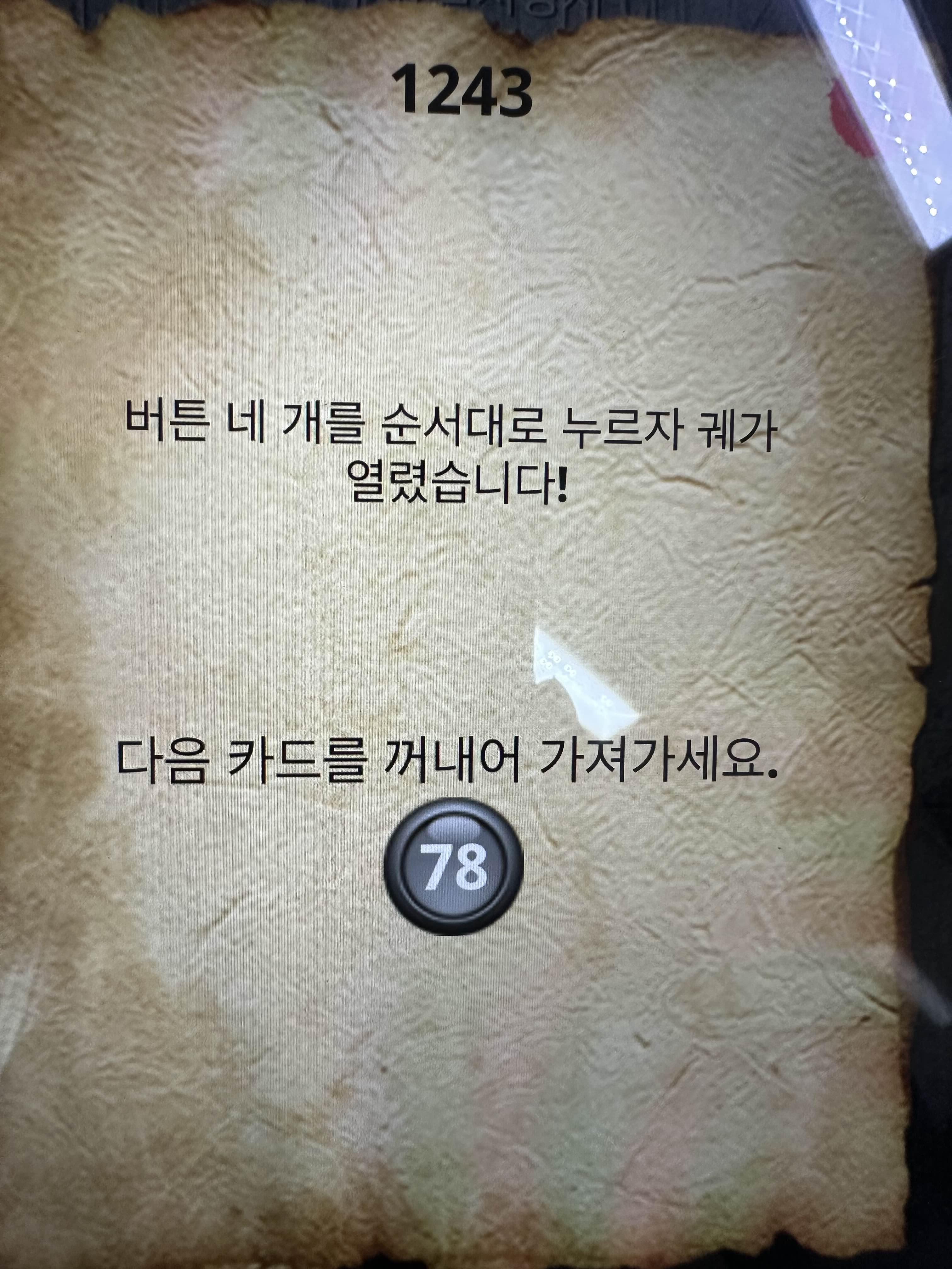 또 다른 힌트는 6번의 별모양 천인데 그 천에 안쪽에 돌멩이가 있다. 그 돌멩이를 시작으로 아까 얻은 코드인 남, 서, 서(아래, 왼쪽, 왼쪽), 를 따라가면 6,8,13이란 번호를 얻을 수 있다. 6813을 입력하면 69번 카드를 얻을 수 있다.
