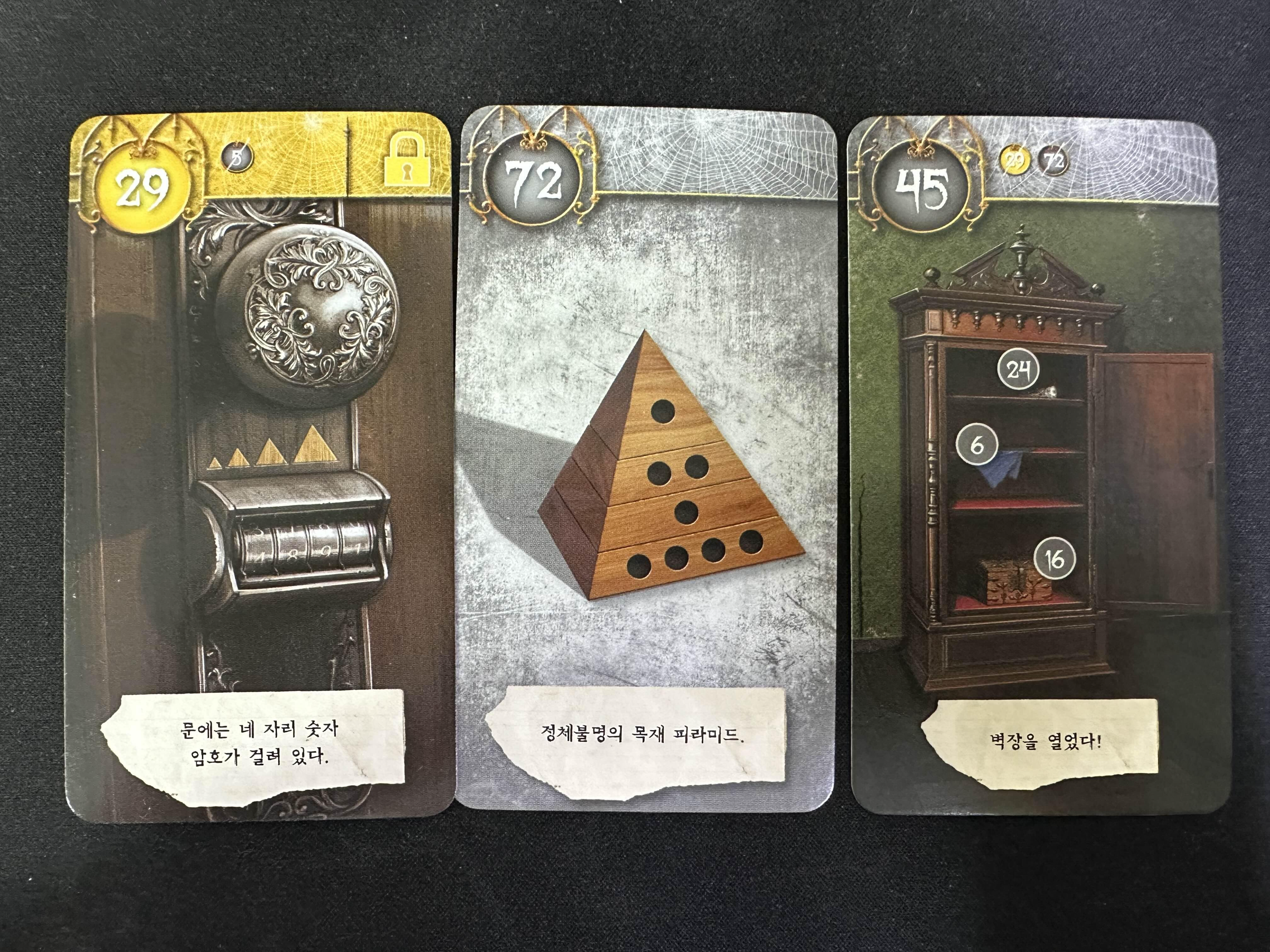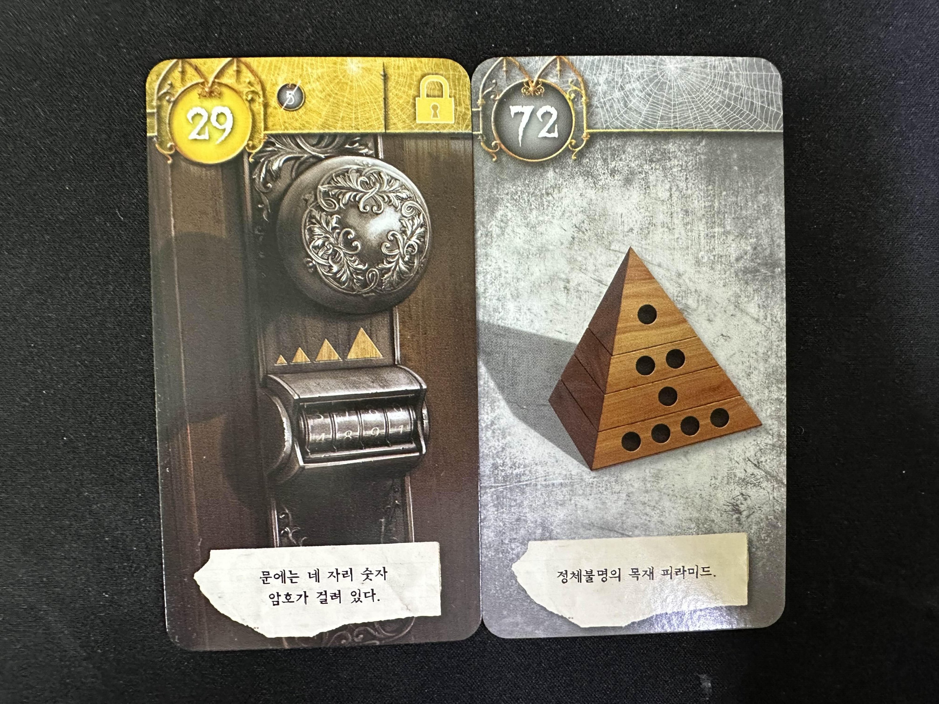 우선 29번 카드의 문고리 밑을 보면 피라미드가 그려져 있는 것을 볼 수 있다. 72번의 피라미드를 통해서 풀 수 있다는 걸 알 수 있다. 다만 여기서 조심해야 하는 부분은 피라미드가 커진다는 점이다. 즉, 1번은 가장 상단의 피라미드이고, 2번은 가장 상단의 피라미드 + 두 번째 줄, 3번은 3번째 줄까지의 합, 그리고 4번은 4번째 줄까지의 합이다. (그냥 그대로 1214를 치면 시간이 차감되니 조심하길)