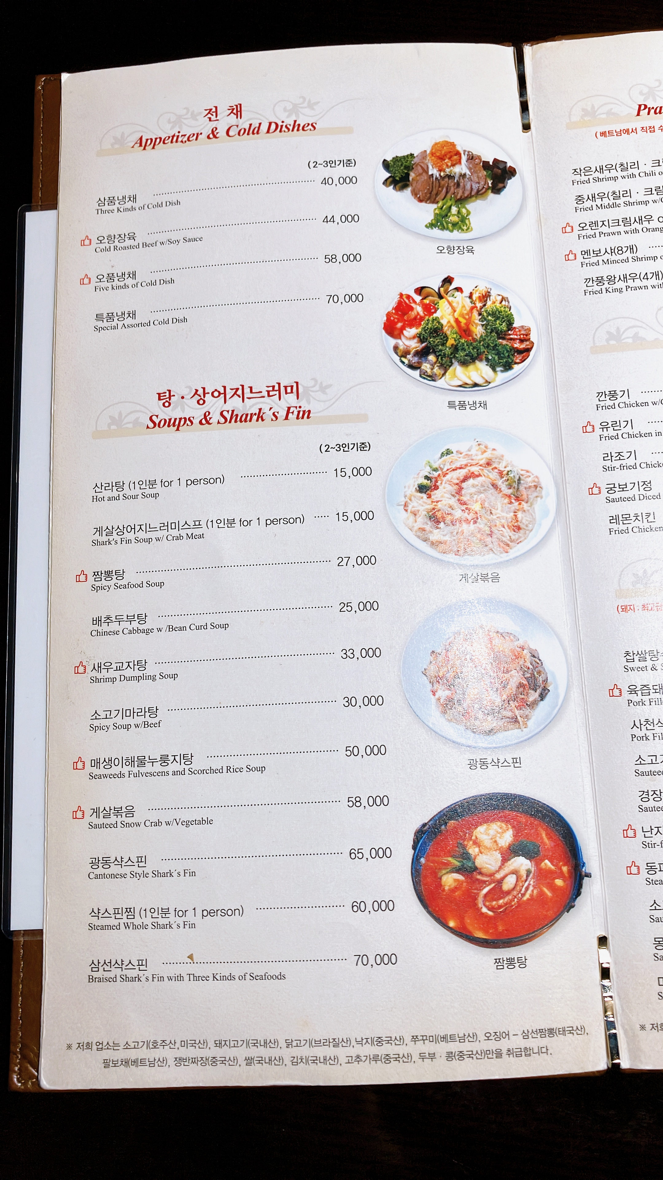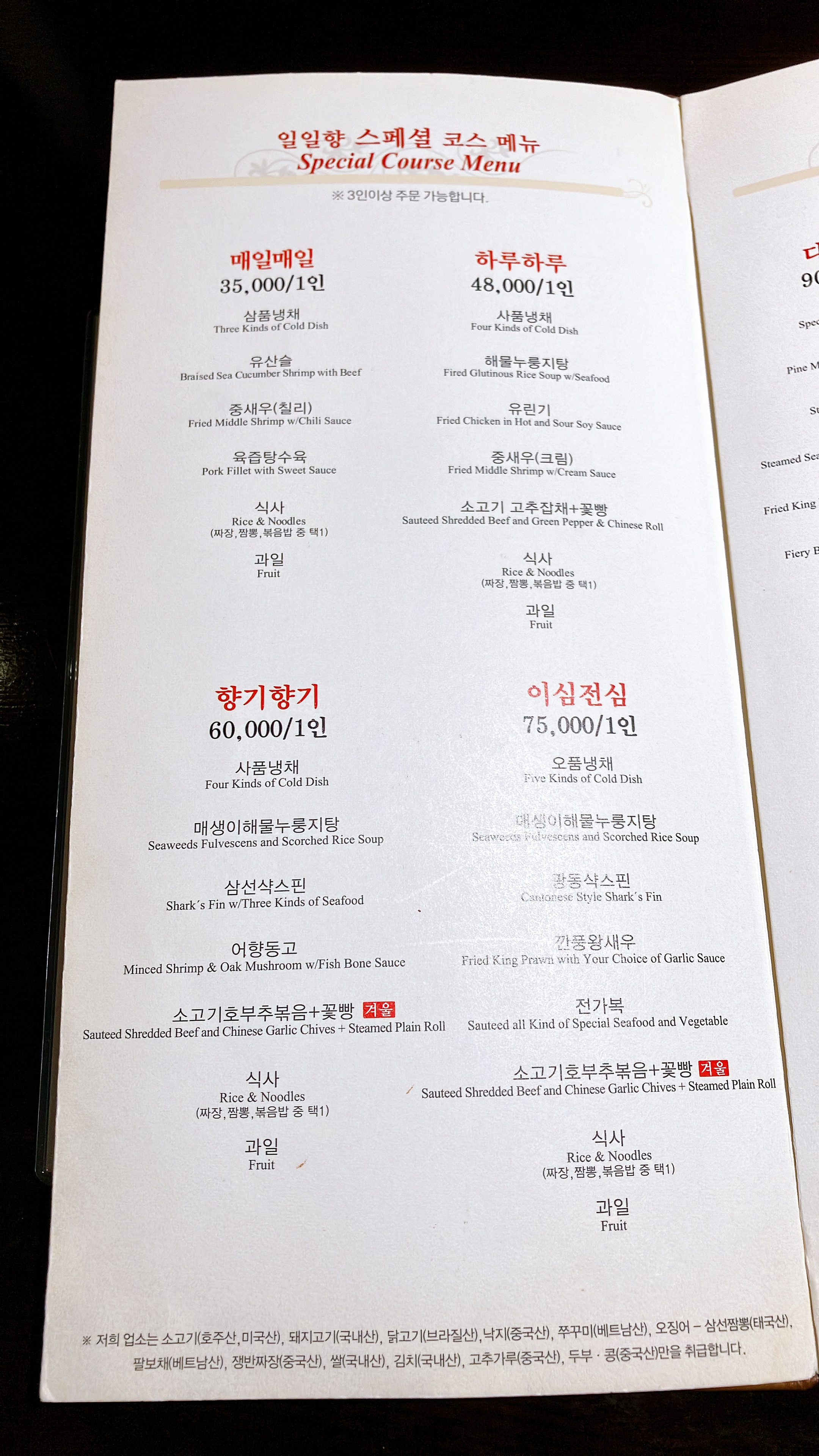 4인 기준일 경우에 원하는 요리 2개와 각각 밥, 면류를 시킨다면 15만 원 정도의 가격이 나올 정도로 큰 지출을 감내해야 한다. 그럼 차라리 점심 코스를 먹는 게 좋지 않은가라고 할 수 있겠지만 사실 35,000원의 가장 싼 코스의 경우에는 이 중식당의 시그니쳐 메뉴인 어향동고가 들어있지 않기 때문에 사실 메리트가 크게 없다고 할 수 있다.