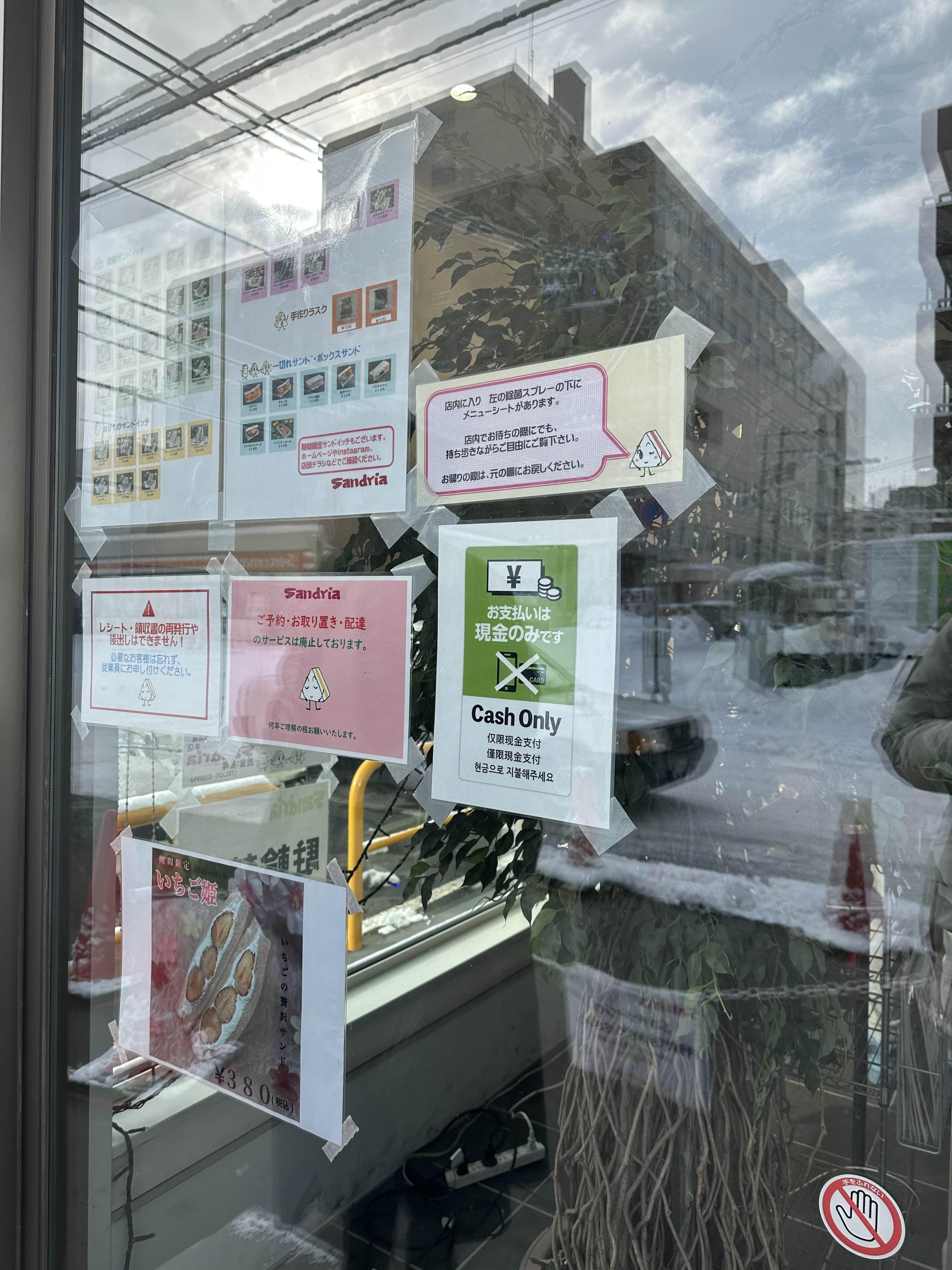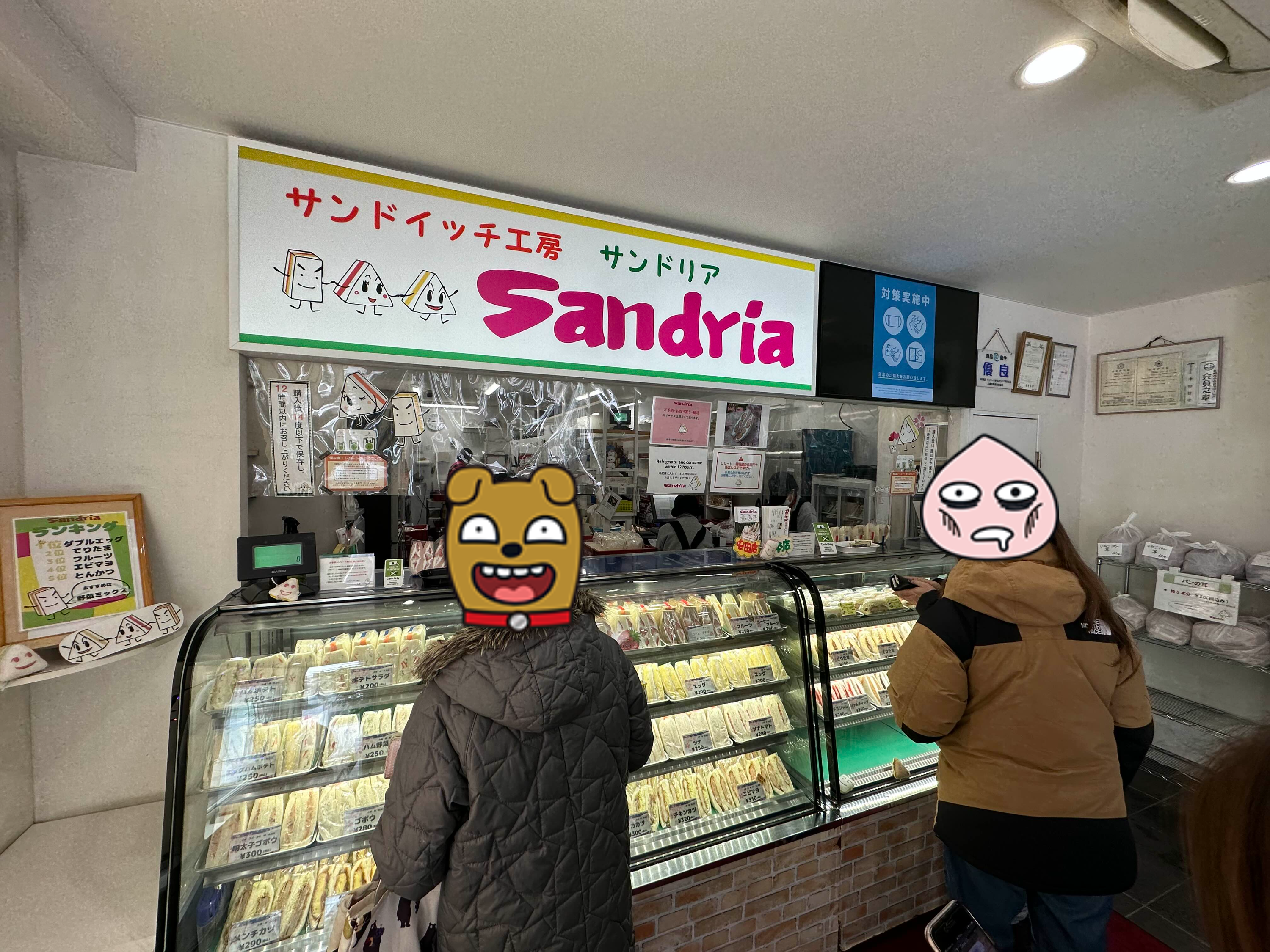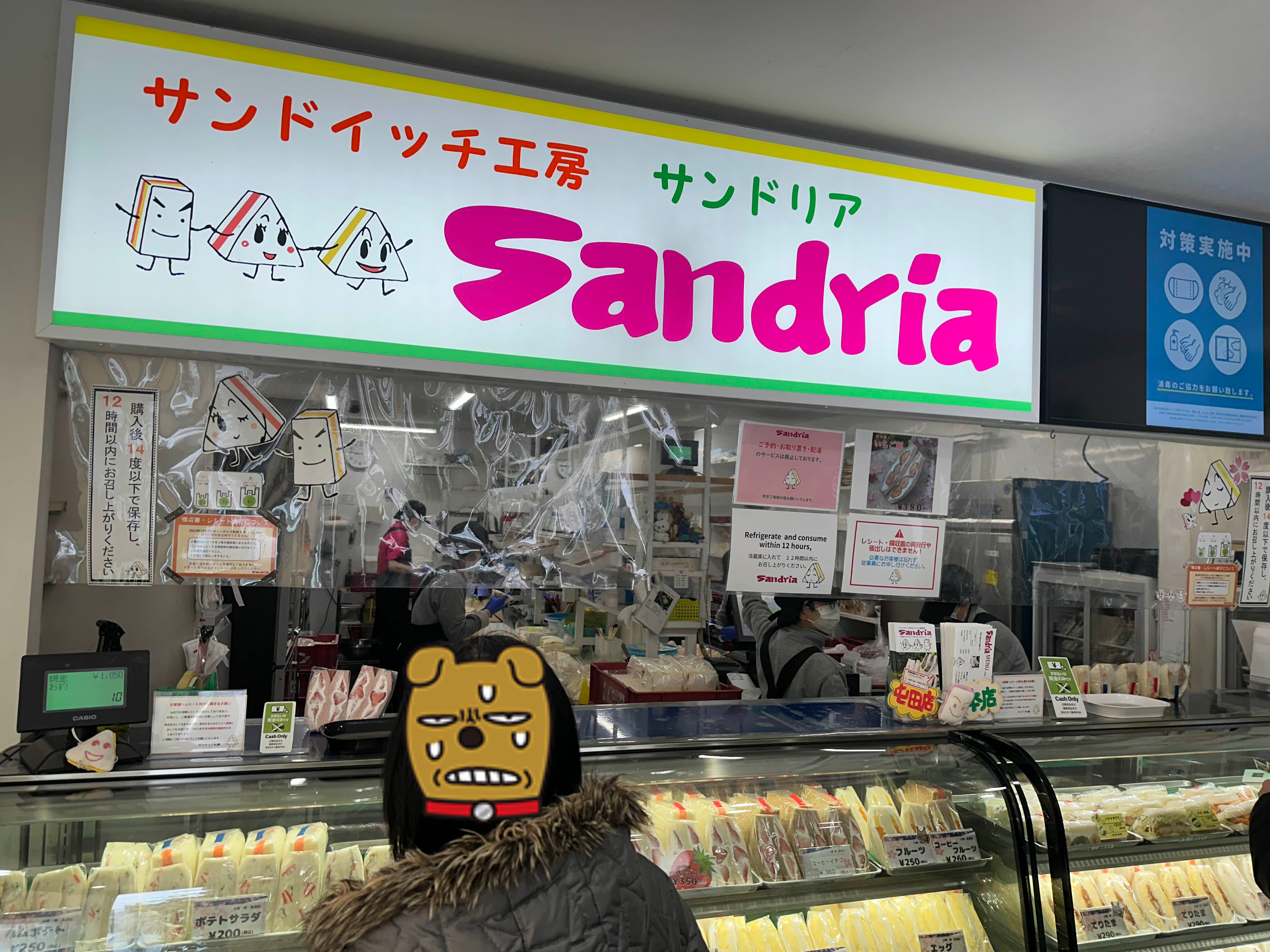 안으로 들어가면 꽤나 심플한 매장으로 진열대에 있는 샌드위치를 보고 이야기하면 점원이 바로바로 집어준다. 이게 진열장의 가운데를 중심으로 투트랙으로 운영이 되기 때문에 왼쪽, 오른쪽 눈치를 봐가면서 먼저 오라고 하면 오면 된다. 샌드를 고르고 나면 점원이 전체 주문한 품목을 다시 보여주고 지불해야 하는 가격을 알려준다. 가격을 보고 사실 한번 더 놀랐는데 샌드위치 하나하나의 가격이 돈까스 샌드위치를 제외하고는 300엔대를 유지하고 있었다. 다만 이 매장은 현금만 받기 때문에 유의하고 방문해야 한다.