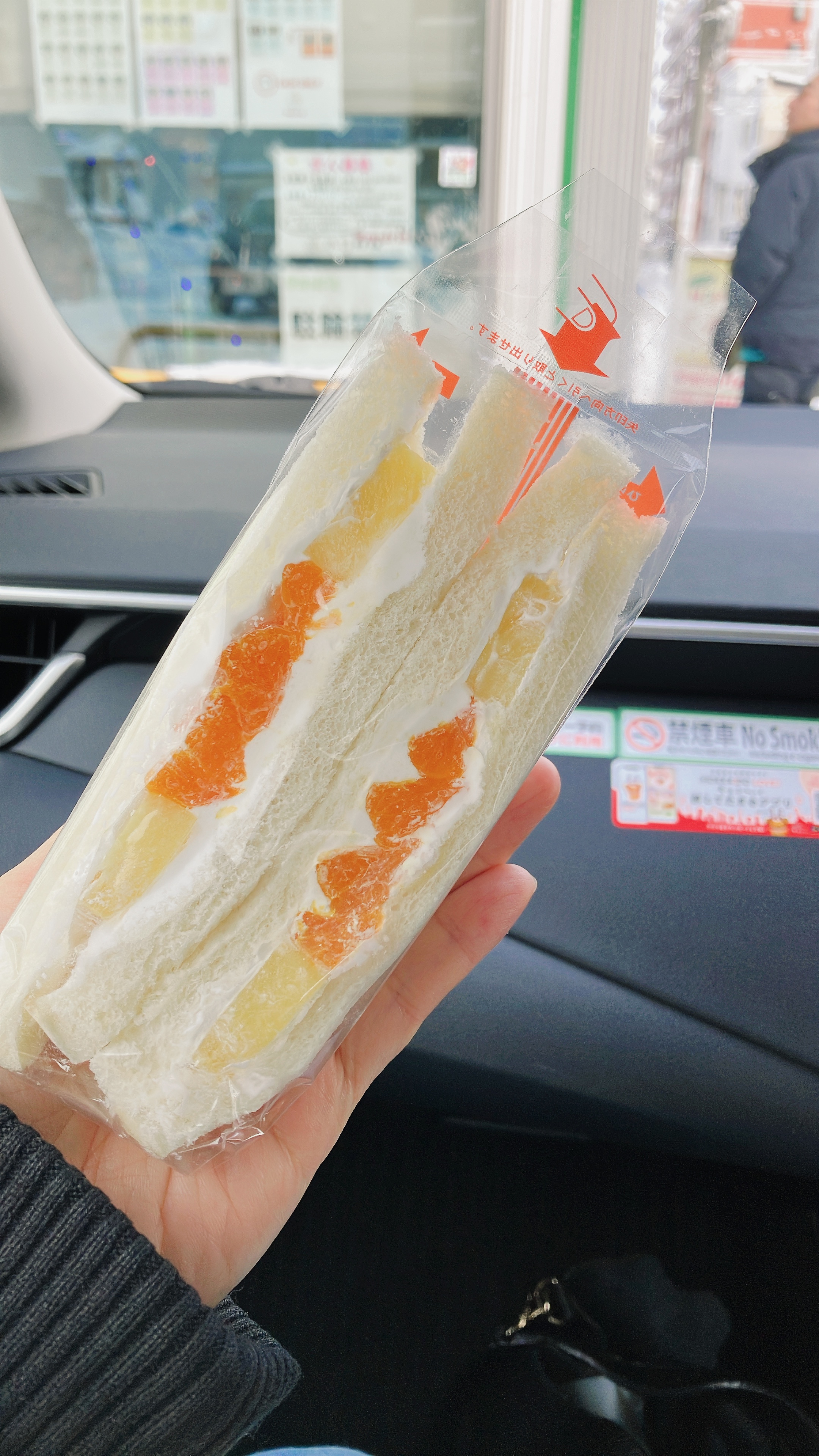 구매를 하면 산도들을 봉투에 담아서 주는데 봉투에 산도들이 손을 잡고 놀고 있다. ㅋㅋ 후르츠 산도의 경우에는 파인애플과 귤이 들어가고 생크림을 바른 간단한 샌드위치인데 과일 자체의 당도가 그렇게 높지 않아서 조금 신맛이 튀는 산도였다. 맛이 없지는 않았는데 그래도 그렇게 특별할 것 없는 느낌이었다.