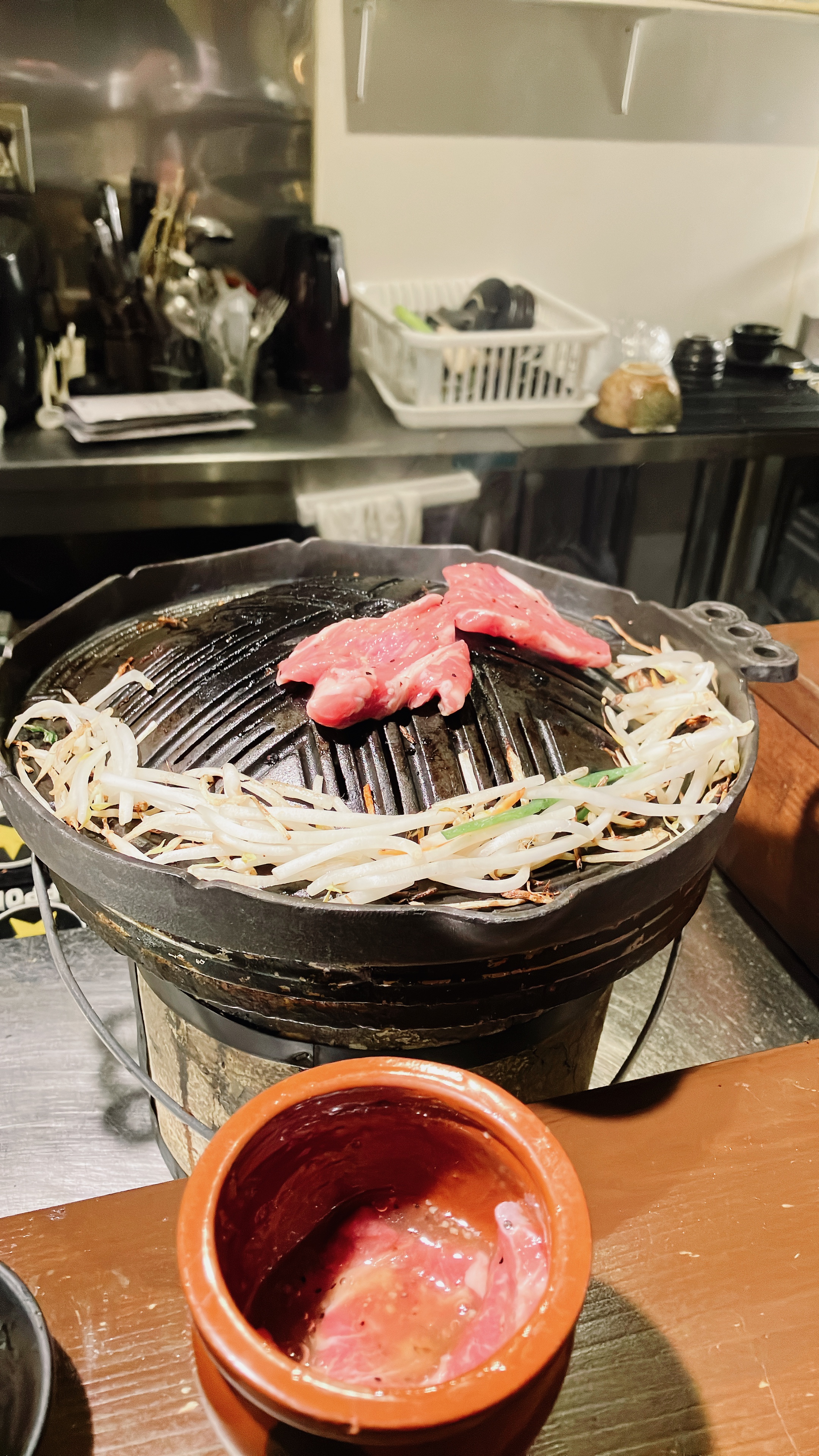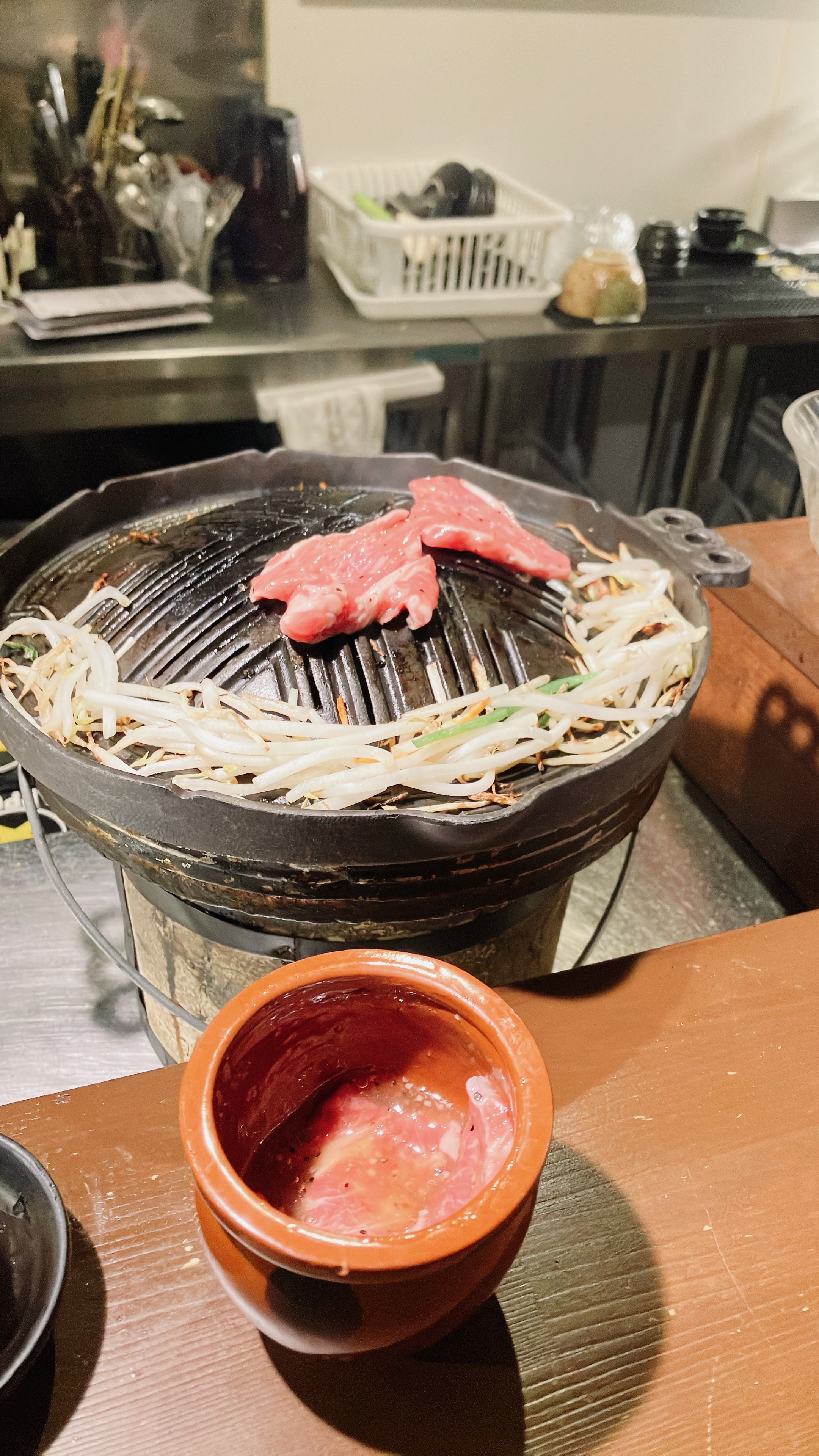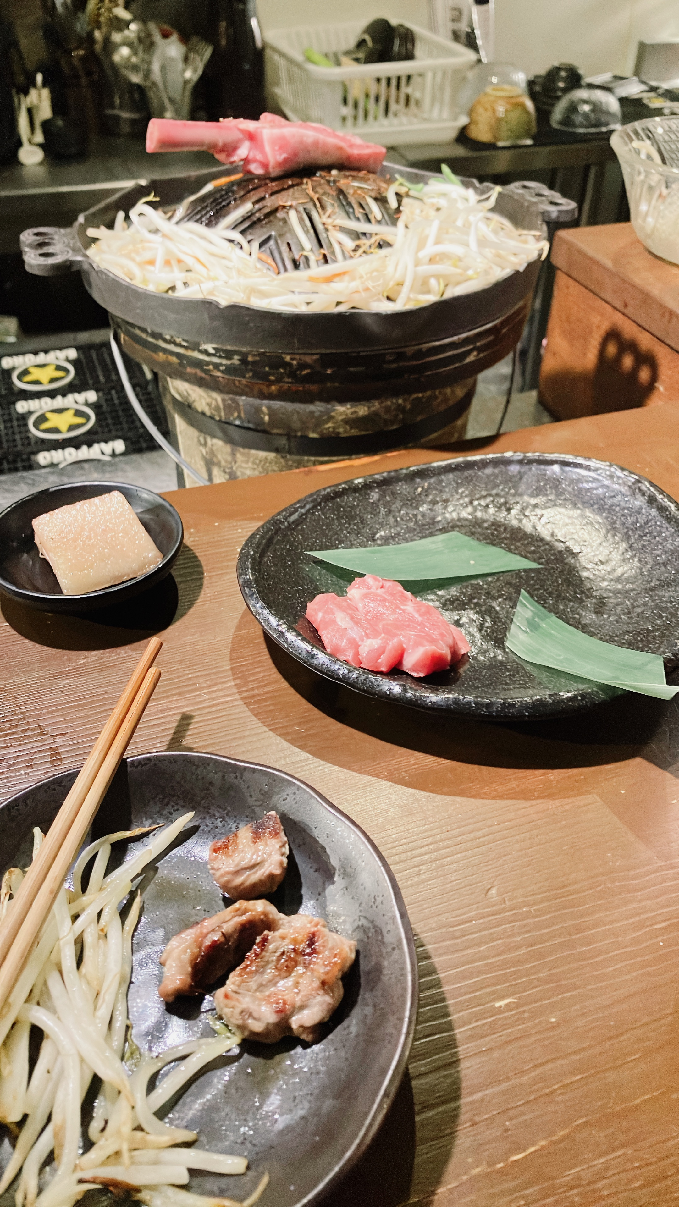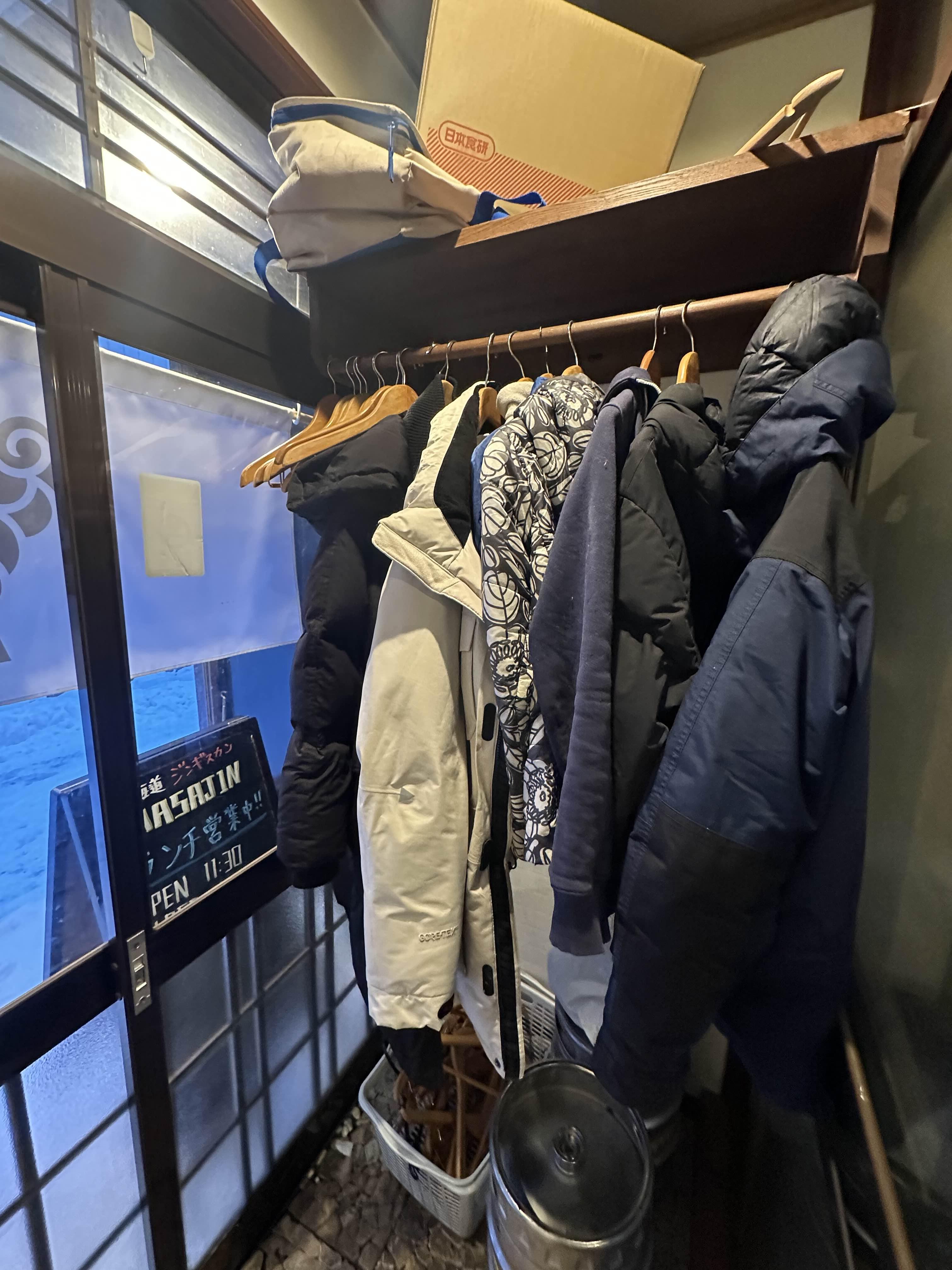 문을 들어서면 바로 예약을 확인하고 중간에 있는 옷걸이에 외투를 걸어 놓으면 된다. 고기 냄새가 안 밸 거라고 생각하면 오산이다. ㅋㅋ 무조건 냄새난다. 원래도 양고기를 정말 좋아하는 나로서는 징기스칸에 대한 기대가 컸다. 물론 한국에서 먹는 양고기와는 다른 점이 많기 때문에 다르다는 점은 인지하고 있었고 또한 너무 기대를 안 하려고 노력을 했다.