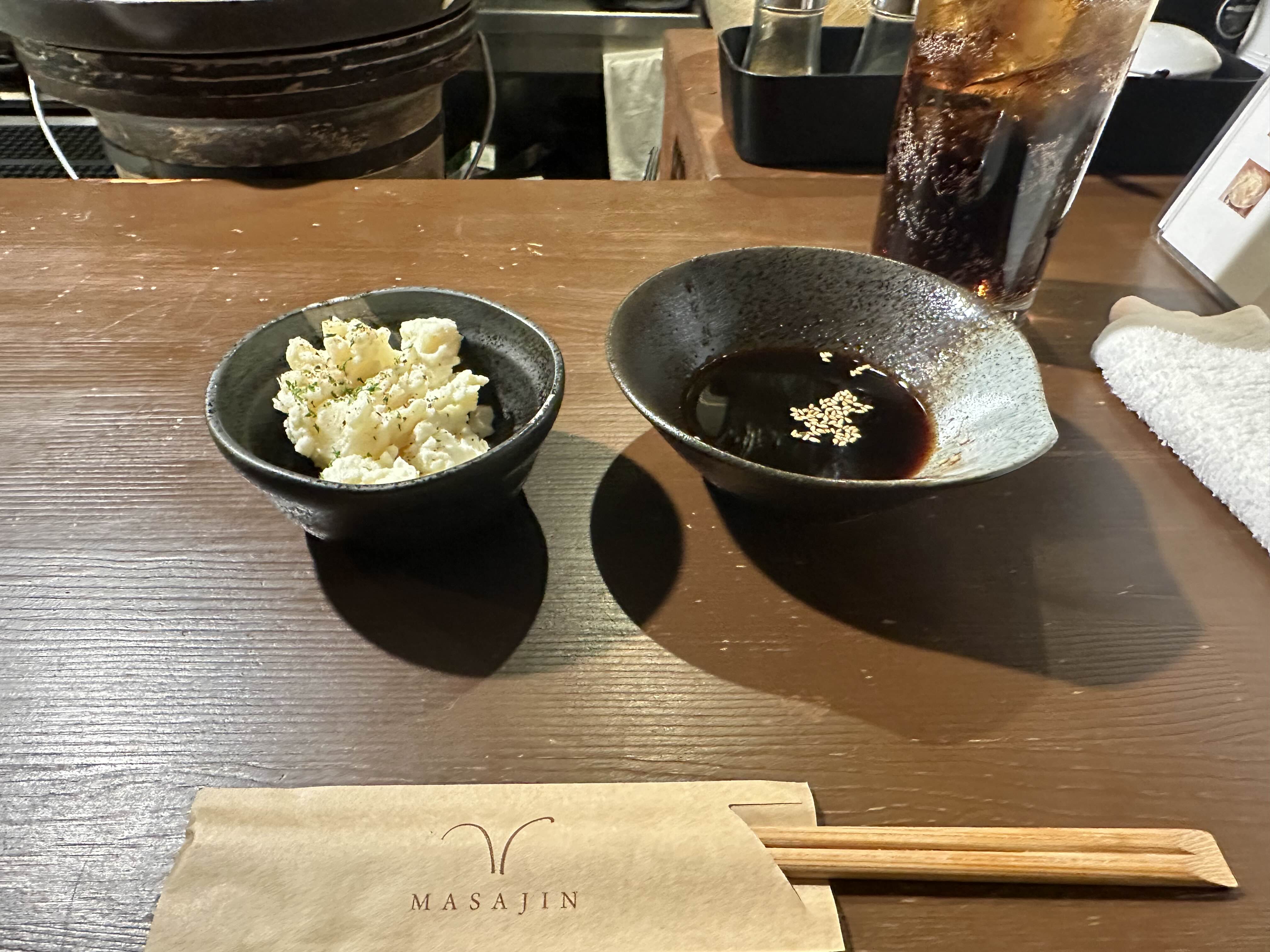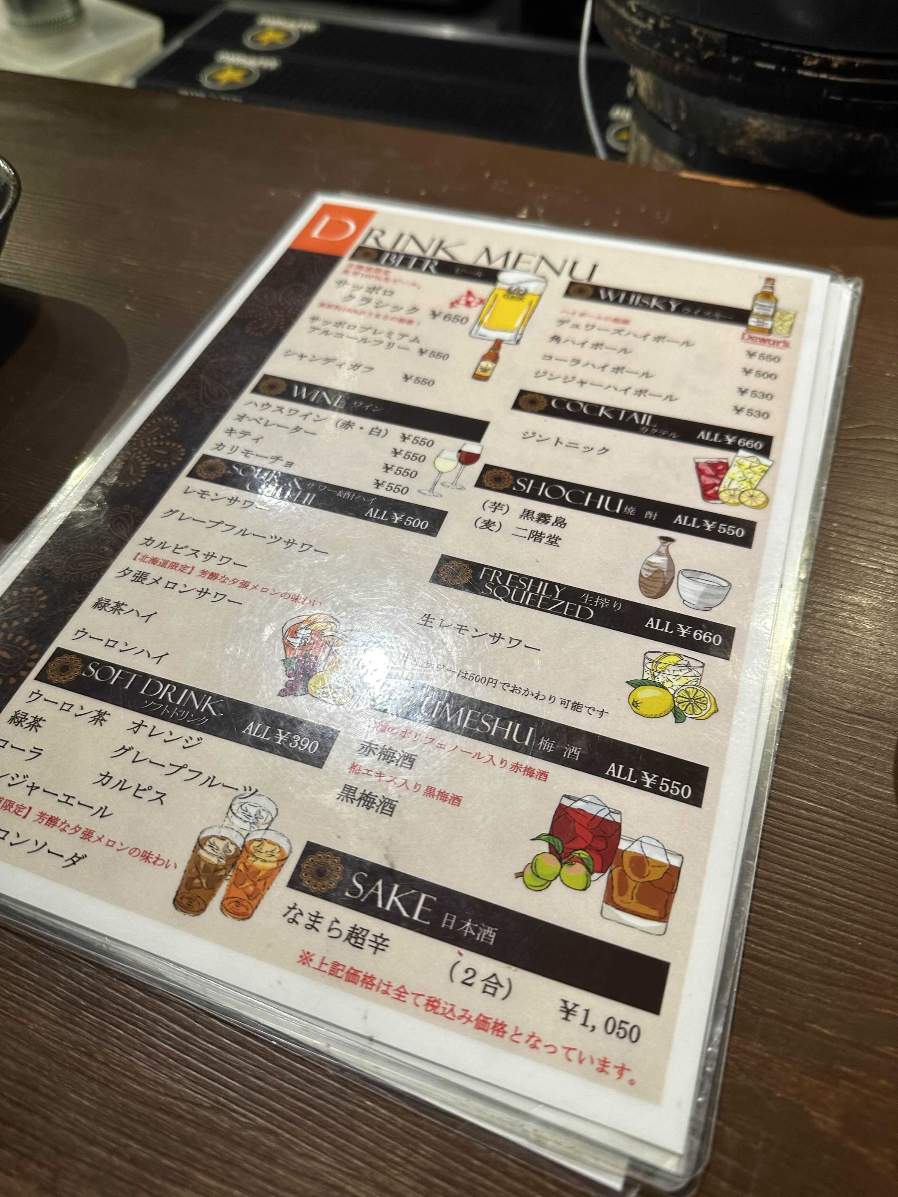 우리는 2인 예약을 해서 닷지석 끝에 앉았는데 이미 오토시가 나와 있었고 감자 샐러드였는데... 감자가... 진짜... 너무 맛있었다. 솔직히 추가하고 싶은 생각이 컸지만 그럴 바에는 양고기를 더 먹자라고 해서 나중에 따로 시키지는 않았다. 음료를 무조건 시켜야 하기에 아내는 맥주를, 나는 운전을 해야 하기에 콜라를 시켰다.
