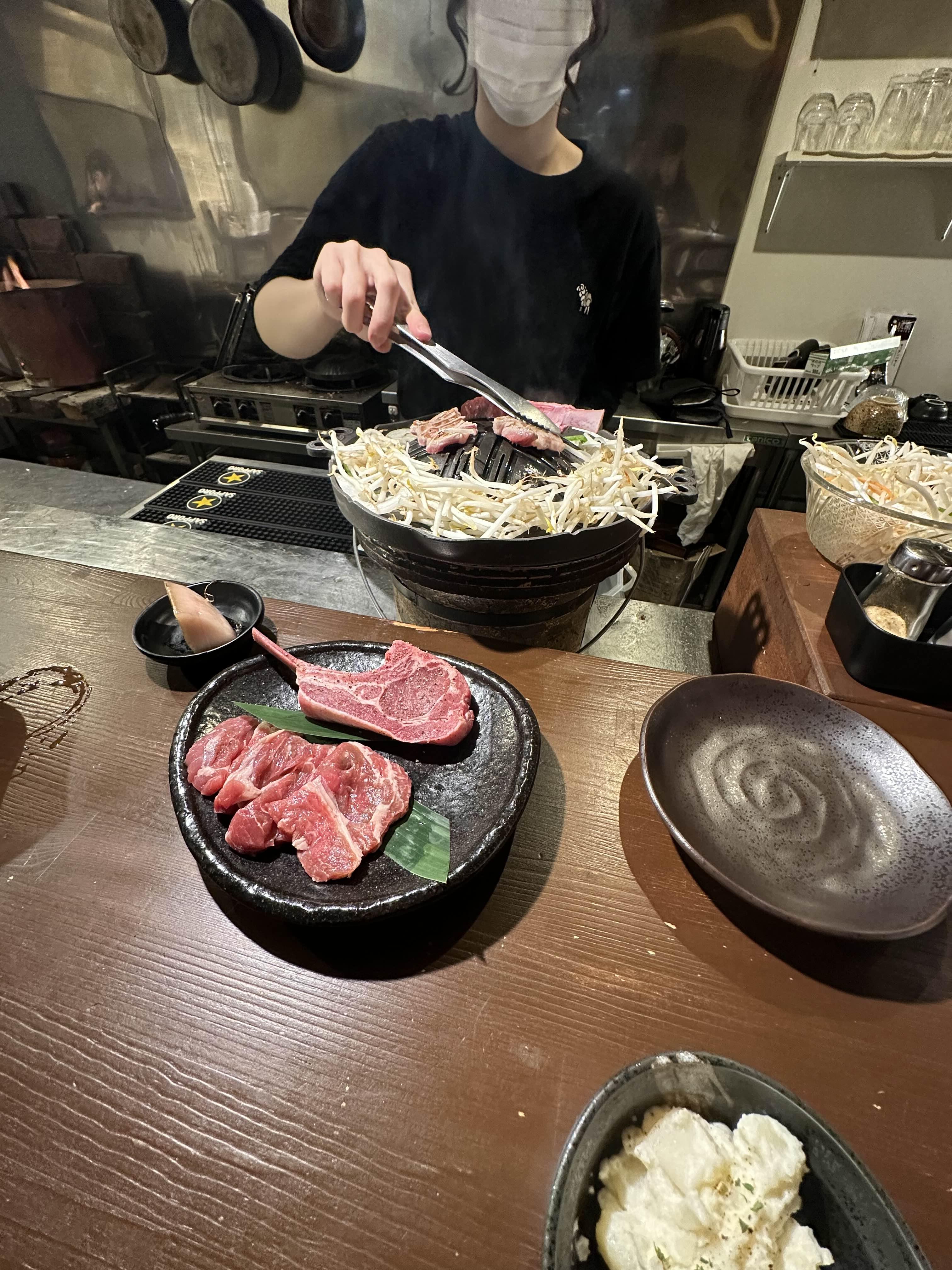 소스는 간장 베이스의 진득한 소스인데 일본 양고기집에서 쉽게 볼 수 있는 소스였다. 여기에 간 마늘이 있었는데, 간 마늘을 조금 넣고 먹으면 아주 괜찮다. 가장 처음 고기와 야채는 종업원이 구워주는데 우리가 외국인이라서 영어가 쓰인 종이를 가지고 와서 보여주며 굽는 방법을 알려준다.