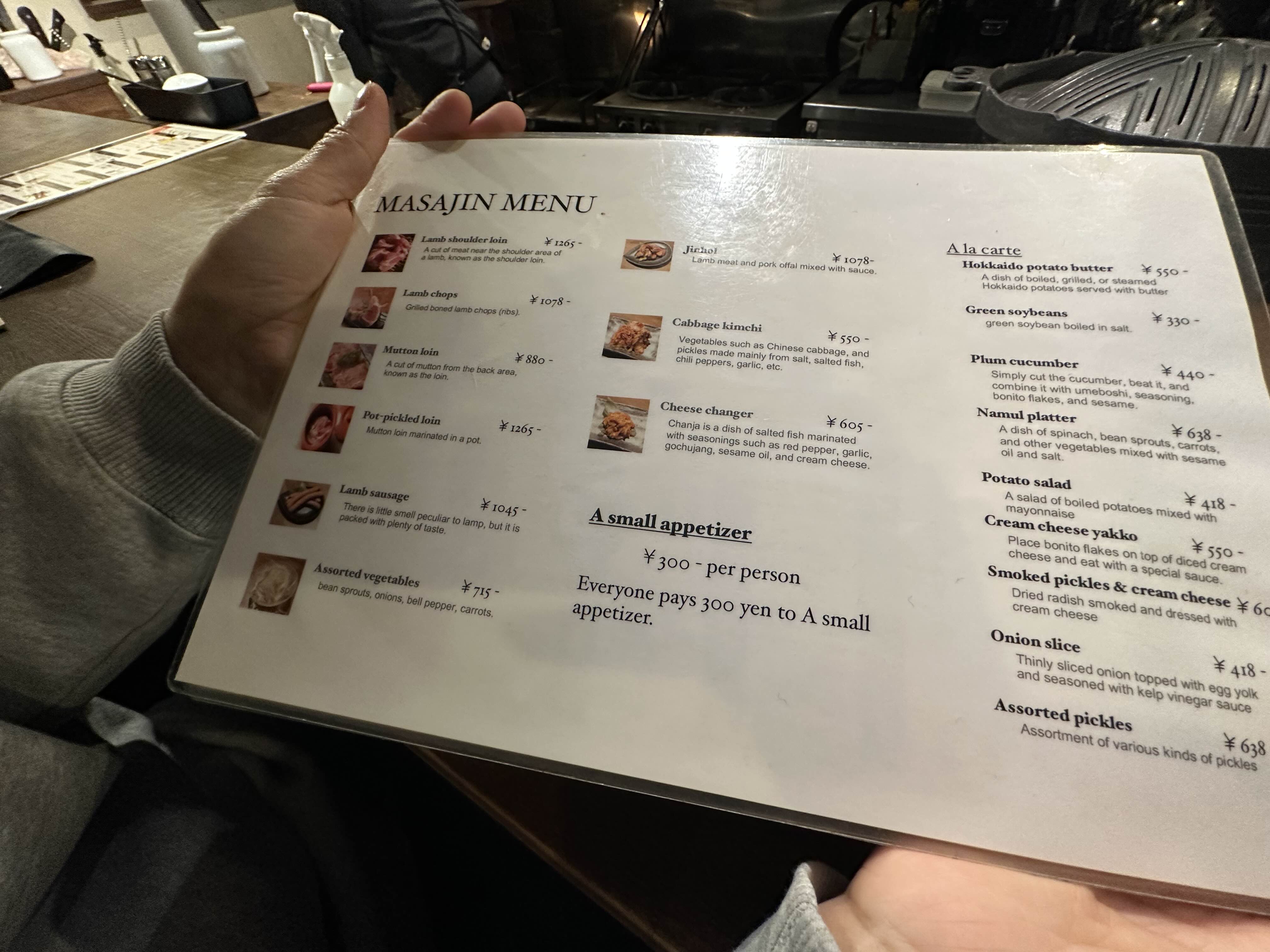 사실 맥주를 정말 마시고 싶었지만 다시 삿포로로 돌아가야 하기에 어쩔 수 없이 콜라를 마셨다. 그리고 메뉴를 보고는 양고기를 시키기 시작했는데 가격이 조금 비싸긴 했다. 우선 프랜치렉의 경우에는 갈비 한 개에 1,265엔이었고 램찹의 경우에는 1,078엔이었다. 우리는 우선은 갈비 2개와 램찹, 그리고 715엔짜리 야채 모둠을 주문했다.