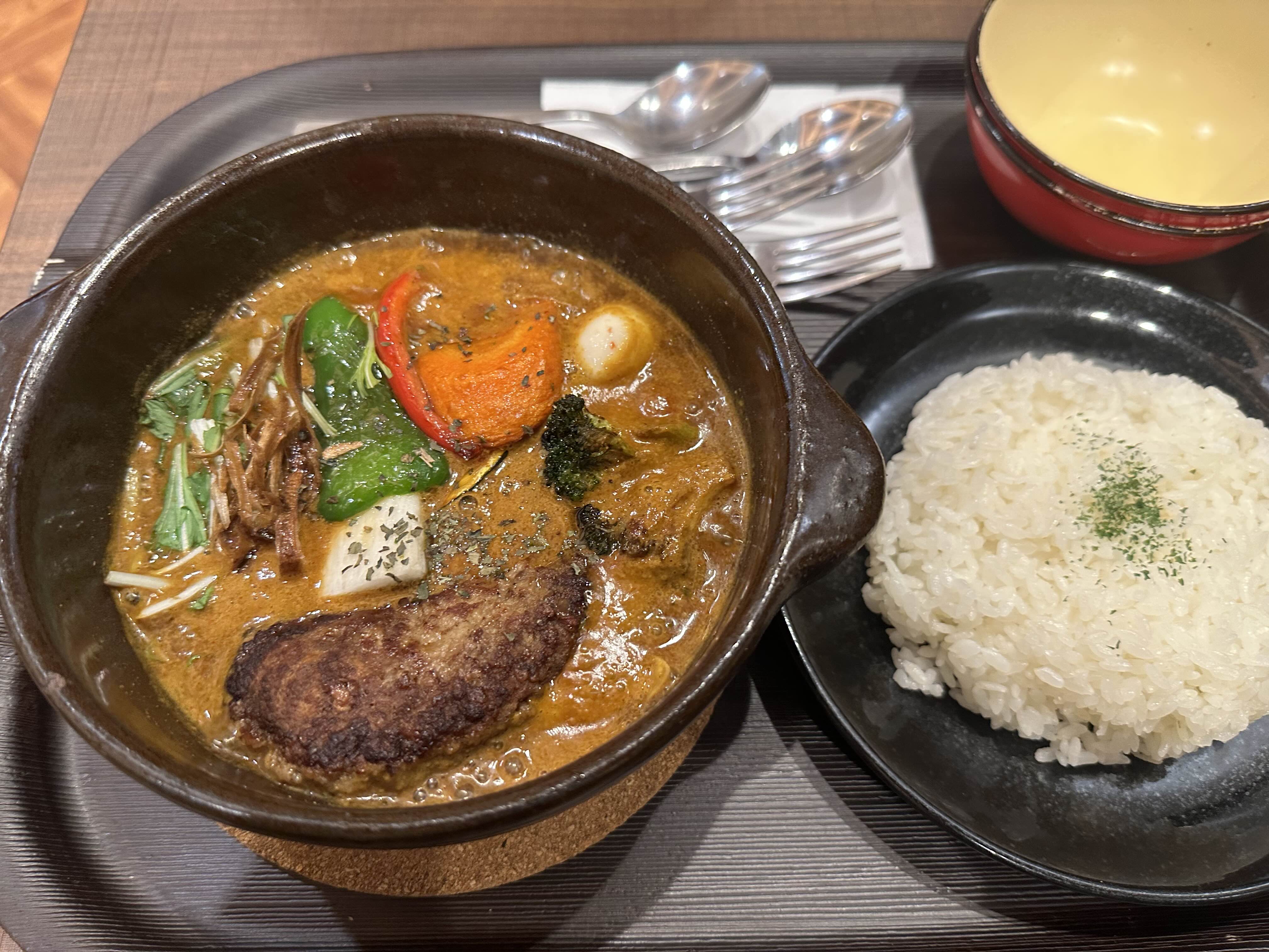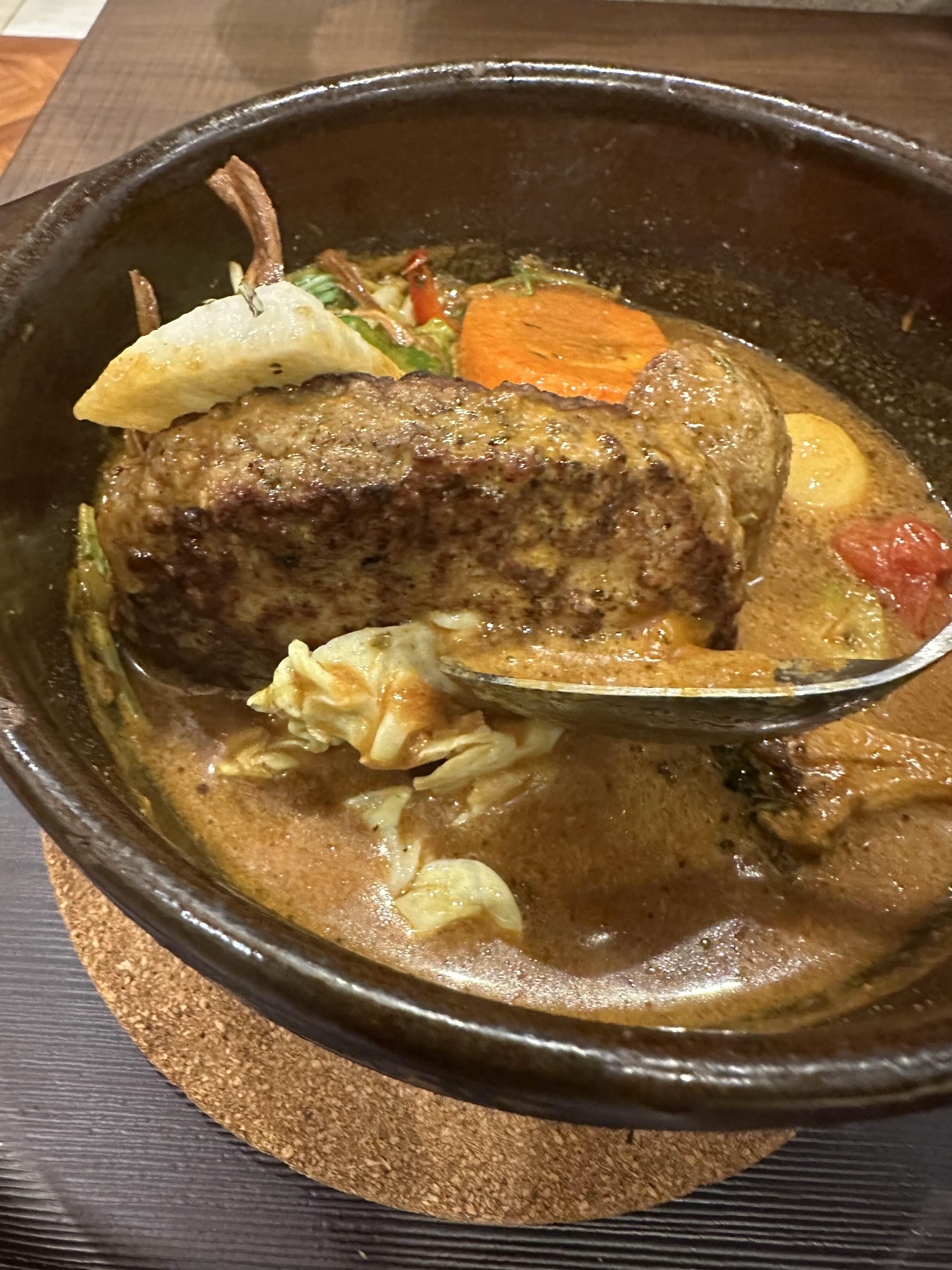 그렇게 나온 함바그 스프카레의 맛은 평범했다. 물론 한국에서 먹는 카레를 생각하면 절대 안 되긴 하지만 일반적인 카레보다는 묽은 느낌의 강황보다는 가람 마살라에 가까운 카레라고 생각하면 된다. 다만 육수의 향이 카레와 더불어 꽤나 강하게 나는데 우리는 일반 육수를 골랐기 때문에 육수라기보다는 채수에 가까웠다. 독특한 향 하나가 나긴 하는데 어떤 야채나 혹은 재료에서 나온 맛인지 특정할 수는 없었지만 이 타이거 스프카레의 특징인지는 모르겠으나 호텔 조식에서 먹었던 스프카레와 조금 결이 달랐다.