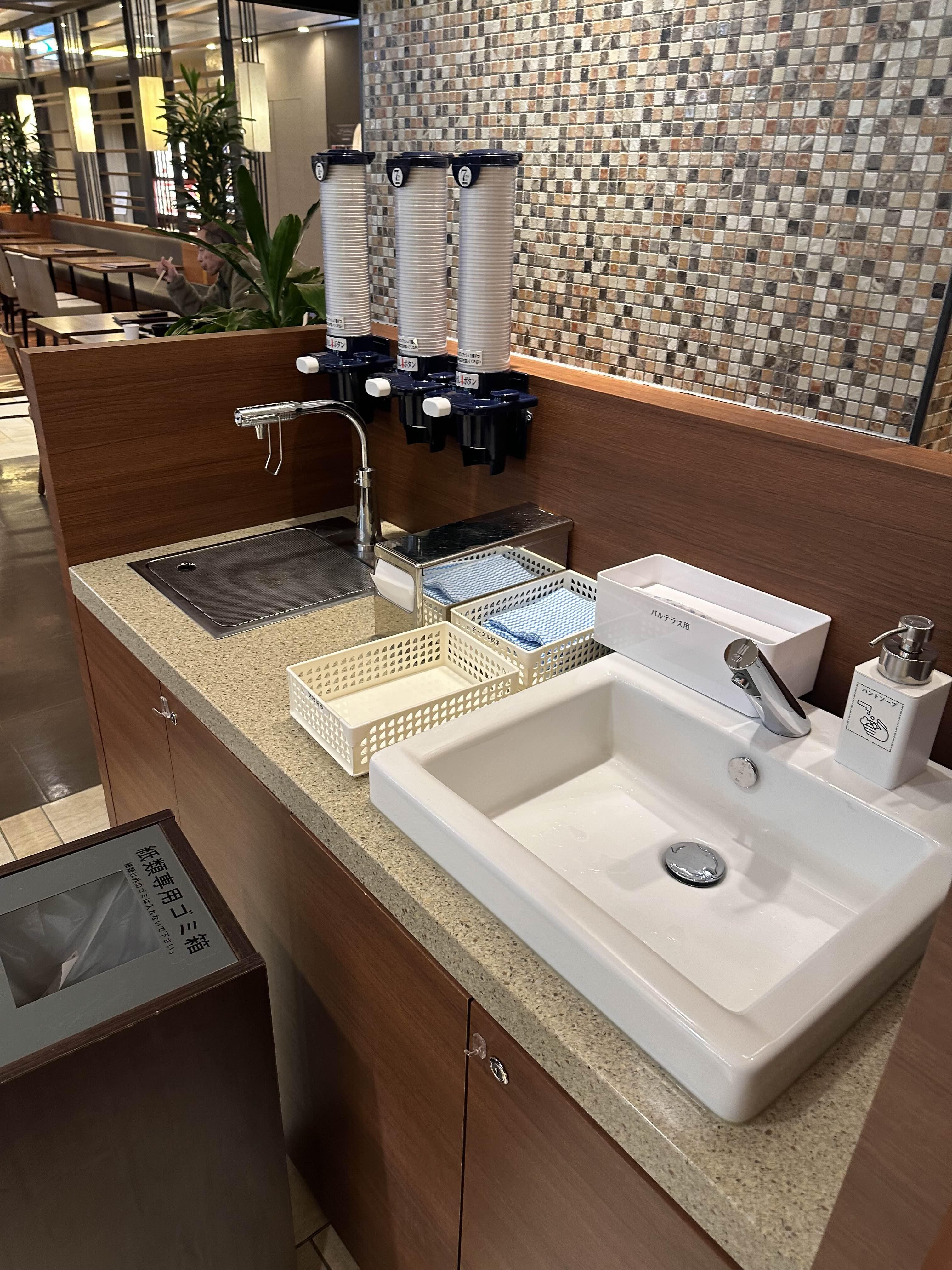 마감이 가까워서 사람이 없었던 것 같은데 점심 때나 저녁 시간에 오면 줄을 서야 할 정도로 사람이 많을 것 같긴 하다. 푸드코트의 매장에 한 5~6개 정도 되는데 앉을 수 있는 좌석 자체가 그렇게 많지 않아서 쉽지 않은 식사가 될 수 있으니 웬만하면 시간을 잘 골라서 가는 게 좋아 보인다. 그래도 푸드코트이기 때문에 물을 마실 수 있는 음수대와 그 옆에 바로 개수대가 있고 손을 씻을 수 있어서 편하게 이용할 수 있다.