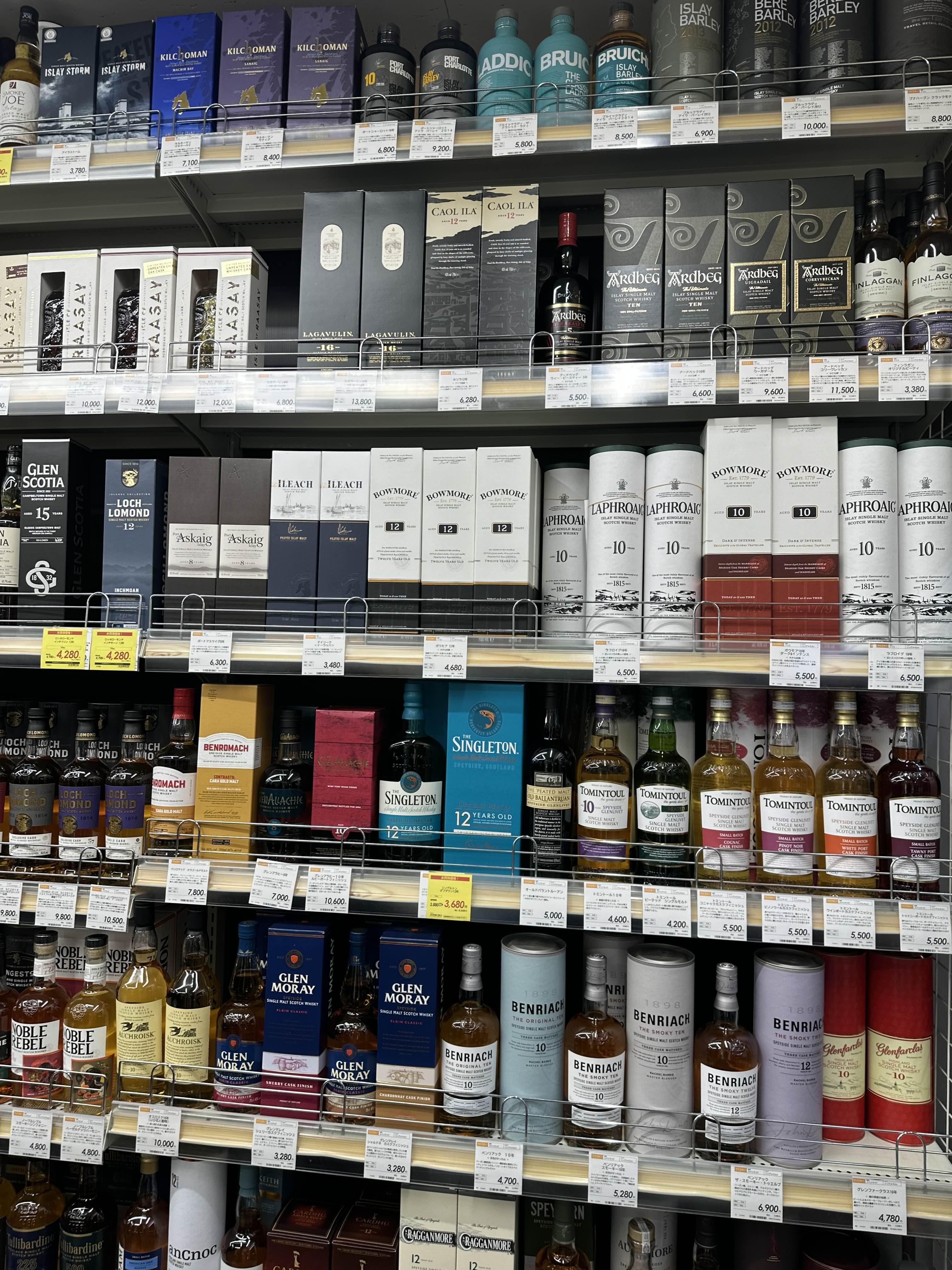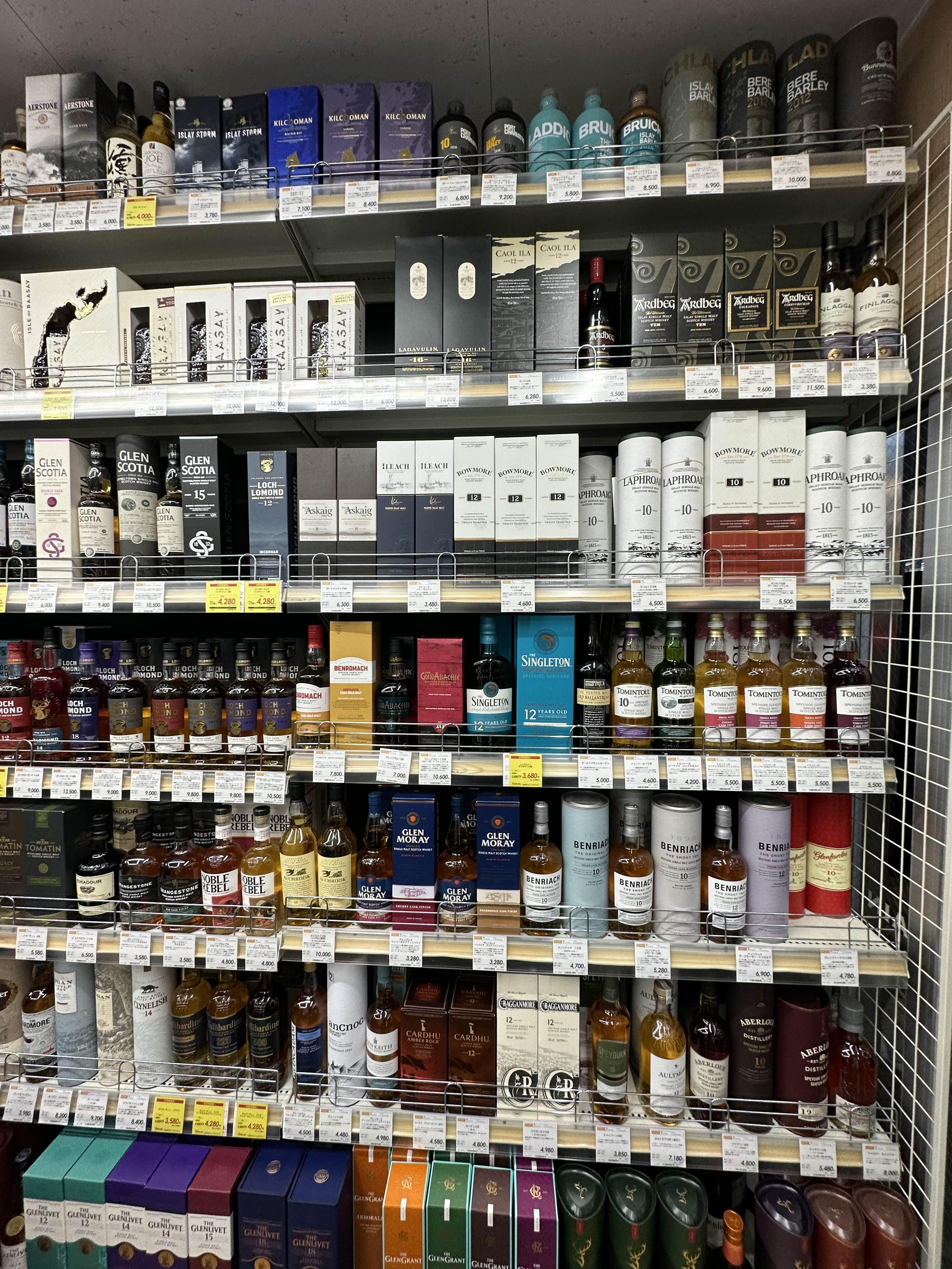 확실히 위스키 쪽 종류들은 이곳이 가장 많기도 하고 체인답게 정리 또한 엄청 잘 되어 있었다. 원래 오사카에서는 리쿼마운틴이 면세가 됐던 기억이 있는데 이곳은 면세가 안 되어서 매장마다 좀 다른 것 같았다. 맥켈란을 비롯해, 아드백, 보모어, 라프로익, 킬호만, 브룩라디, 싱글톤, 벤로막, 글렌 모레이, 글렌 글파스, 카퍼도히니, 하이랜드 파크, 올드풀터리, 부쉬밀, 포로지스 등이 있었다. 그리고 재미있던 점은 한국 위스키인 기원 생각보다 많이 있어서 좀 놀랐고, 더 웃긴 건 가격이 비쌌다.