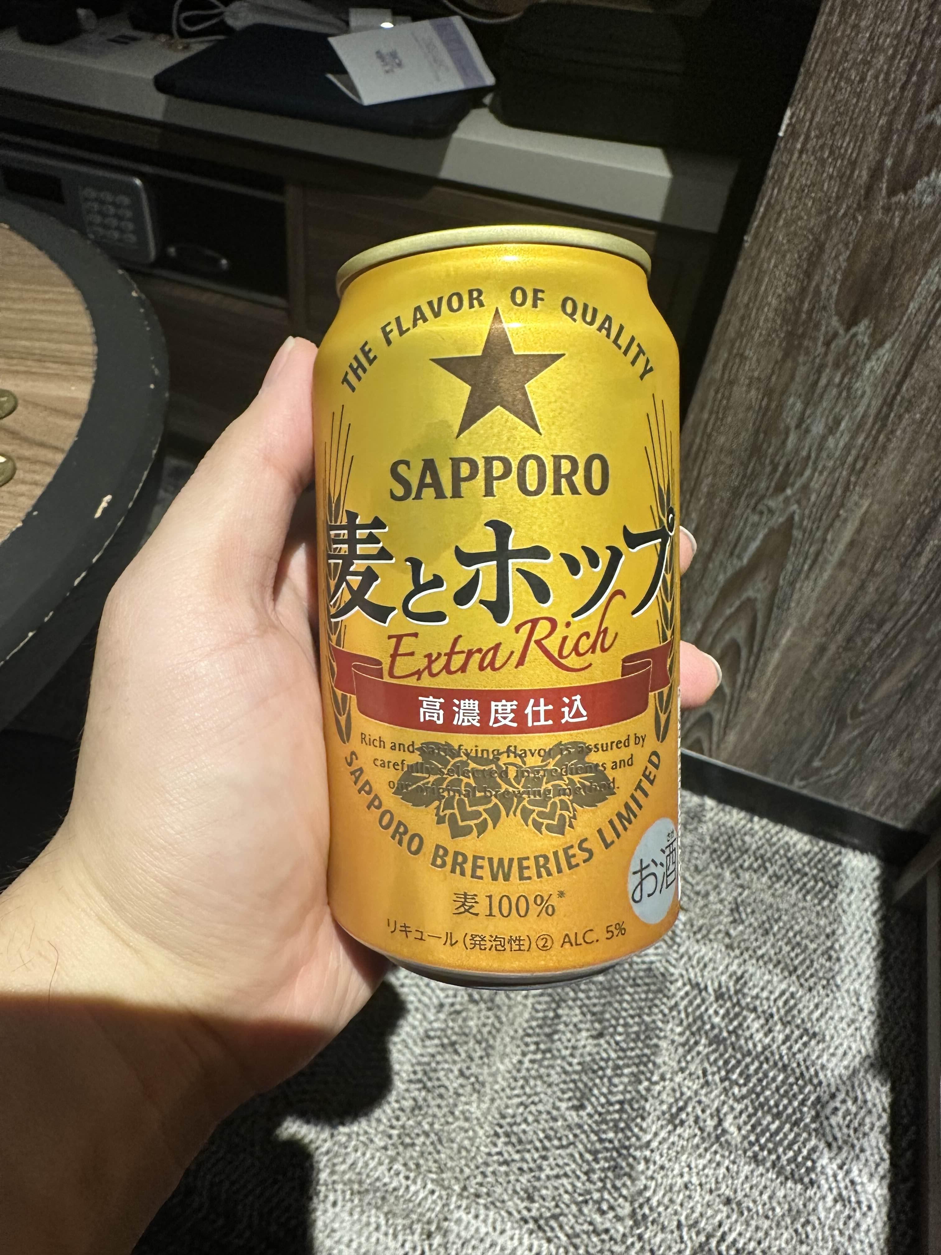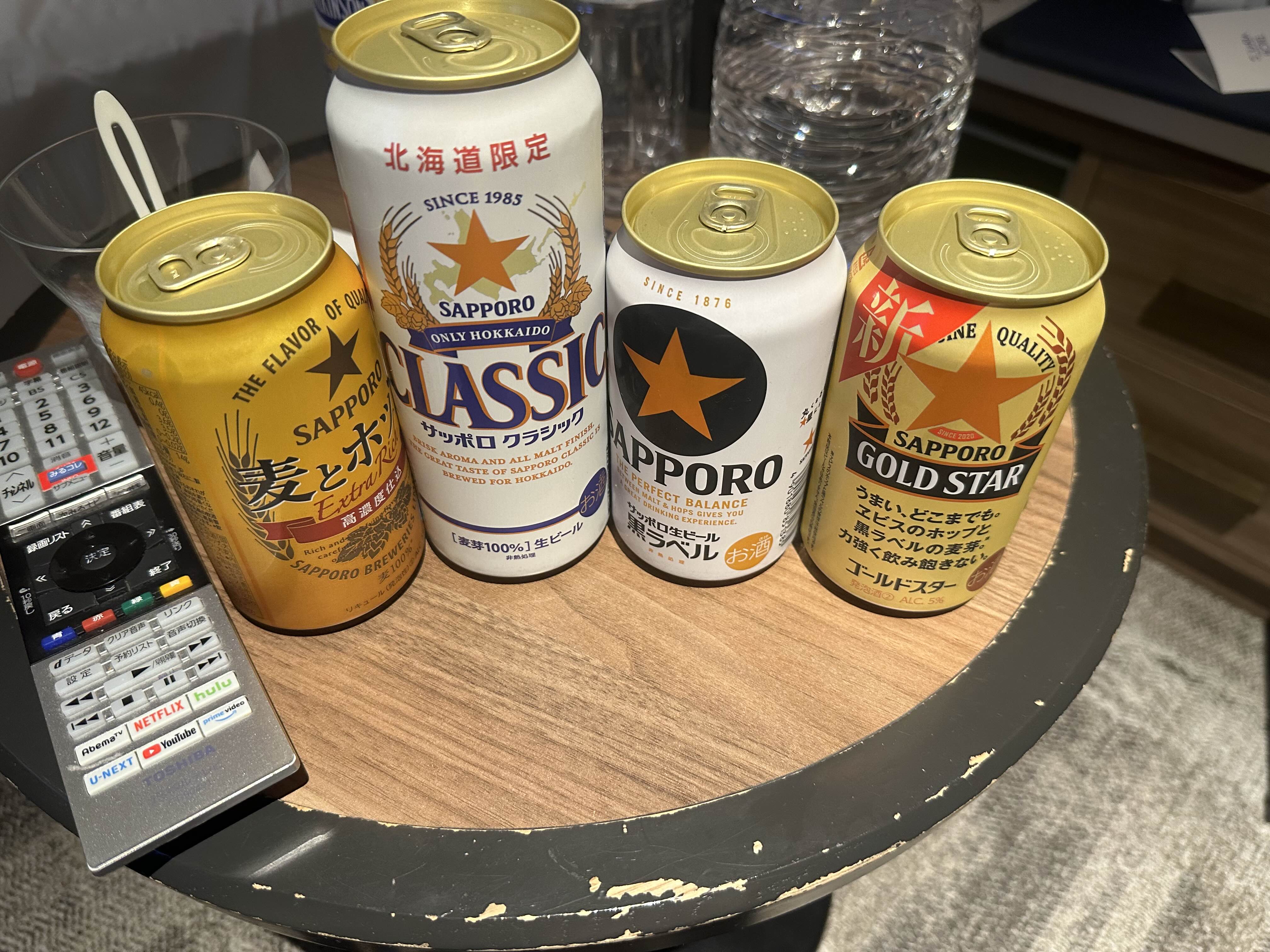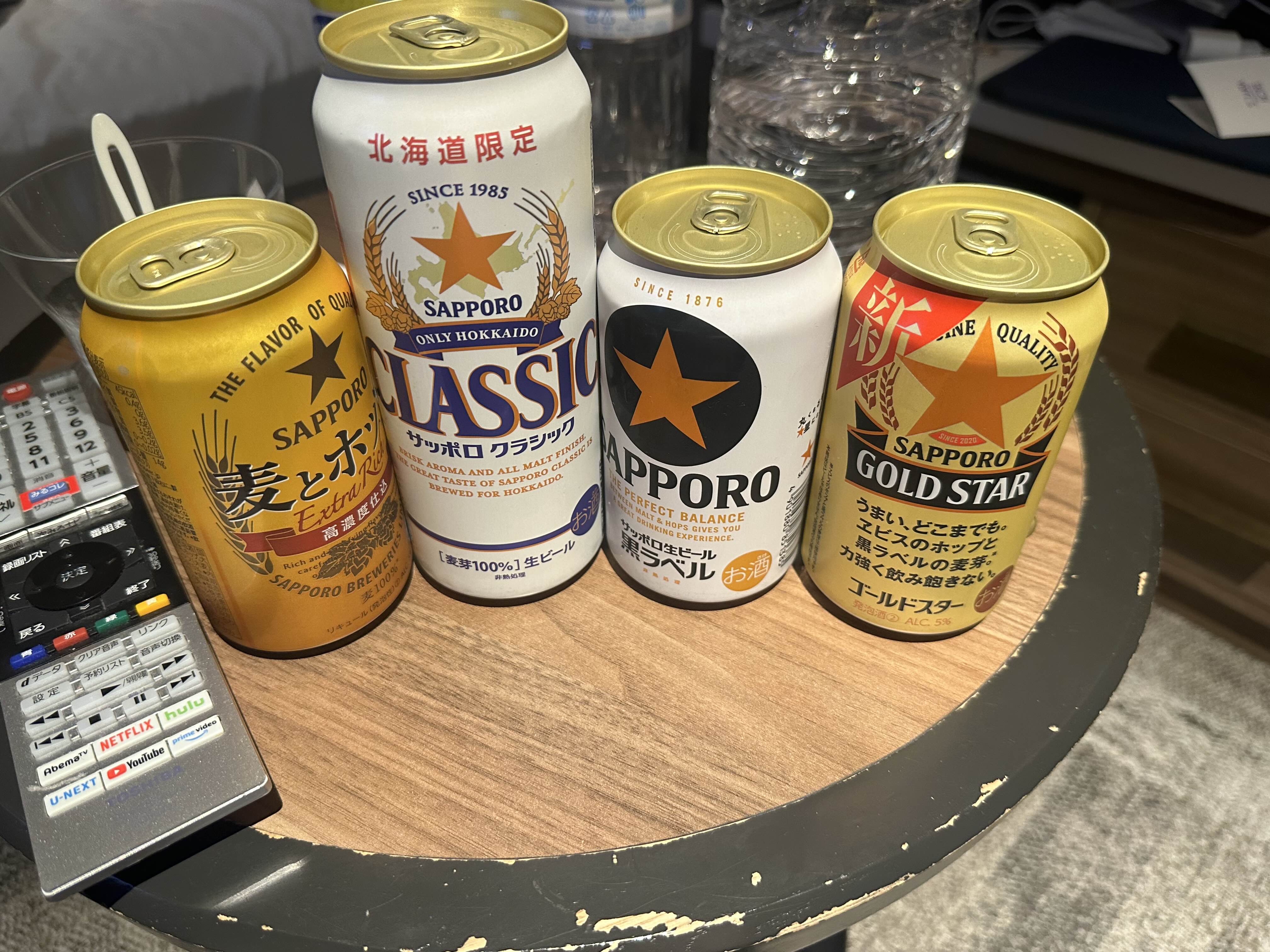 그중 4가지 정도를 사서 비교를 해서 마셔보았는데 클래식, 블랙라벨, 골드 스타, 보리와 호프 엑스트라 리치를 보았다 이것 말고도 드래프트, 라거 보리와 호프 블랙 등 다른 것들이 있었는데 이 정도가 우리가 삿포로 편의점이나 혹은 마트에서 쉽게 볼 수 있는 것들이었다. 거기에 번외로 기린의 붉은 기린 생 발포주가 있어서 한 번 마셔 보았다.