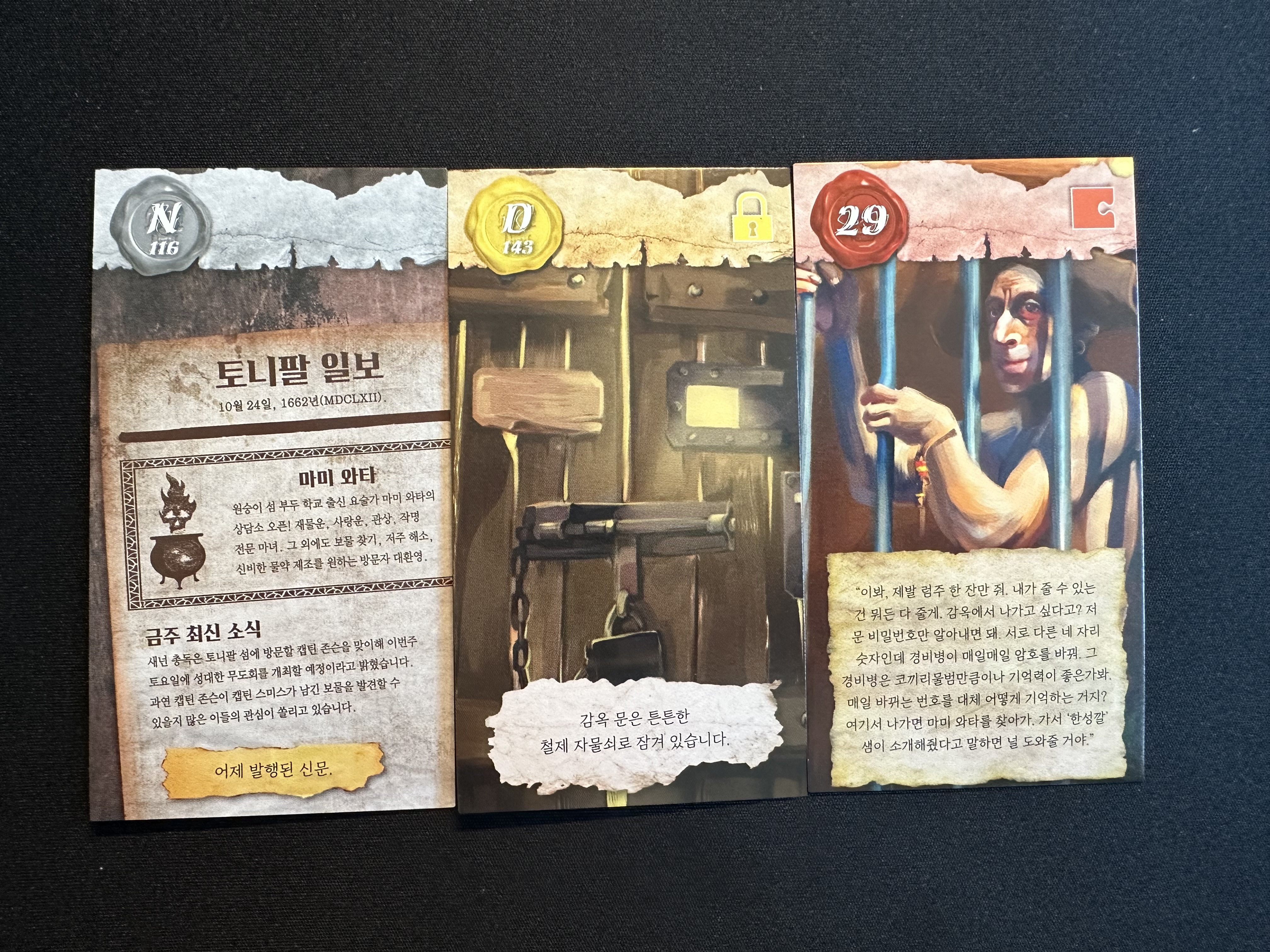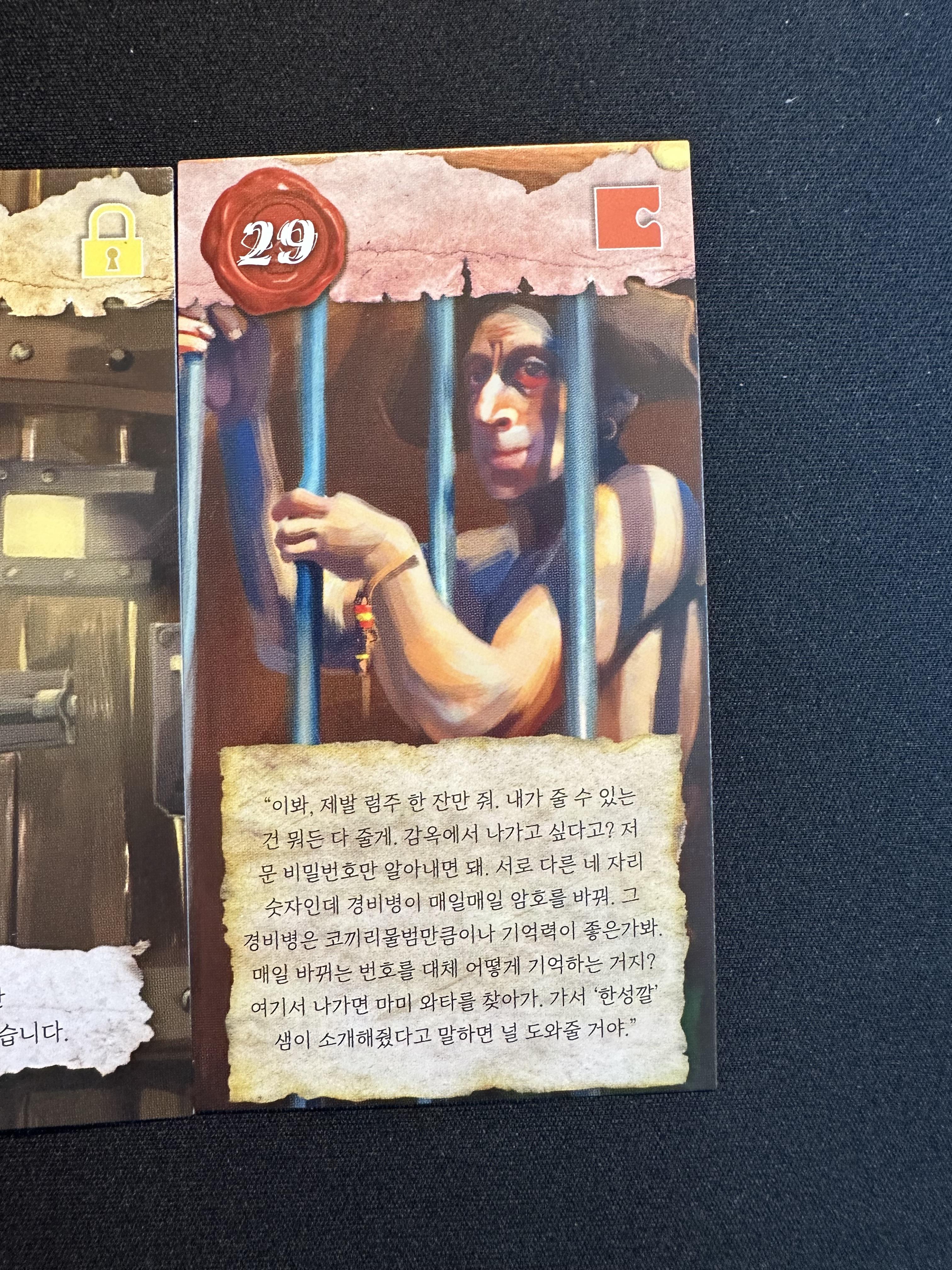 우선 N카드와 29번 카드의 문구들을 눈여겨보는 것이 좋다. 29번의 죄수의 말 중 '4자리 숫자', '경비병이 매일매일 암호를 바꾼다', '기억력이 매우 좋은 것 같다'라는 문구를 봤을 때 그렇게 어렵지 않고 매일 바뀌는 숫자를 유추해 내면 날짜라는 결론이 나온다.