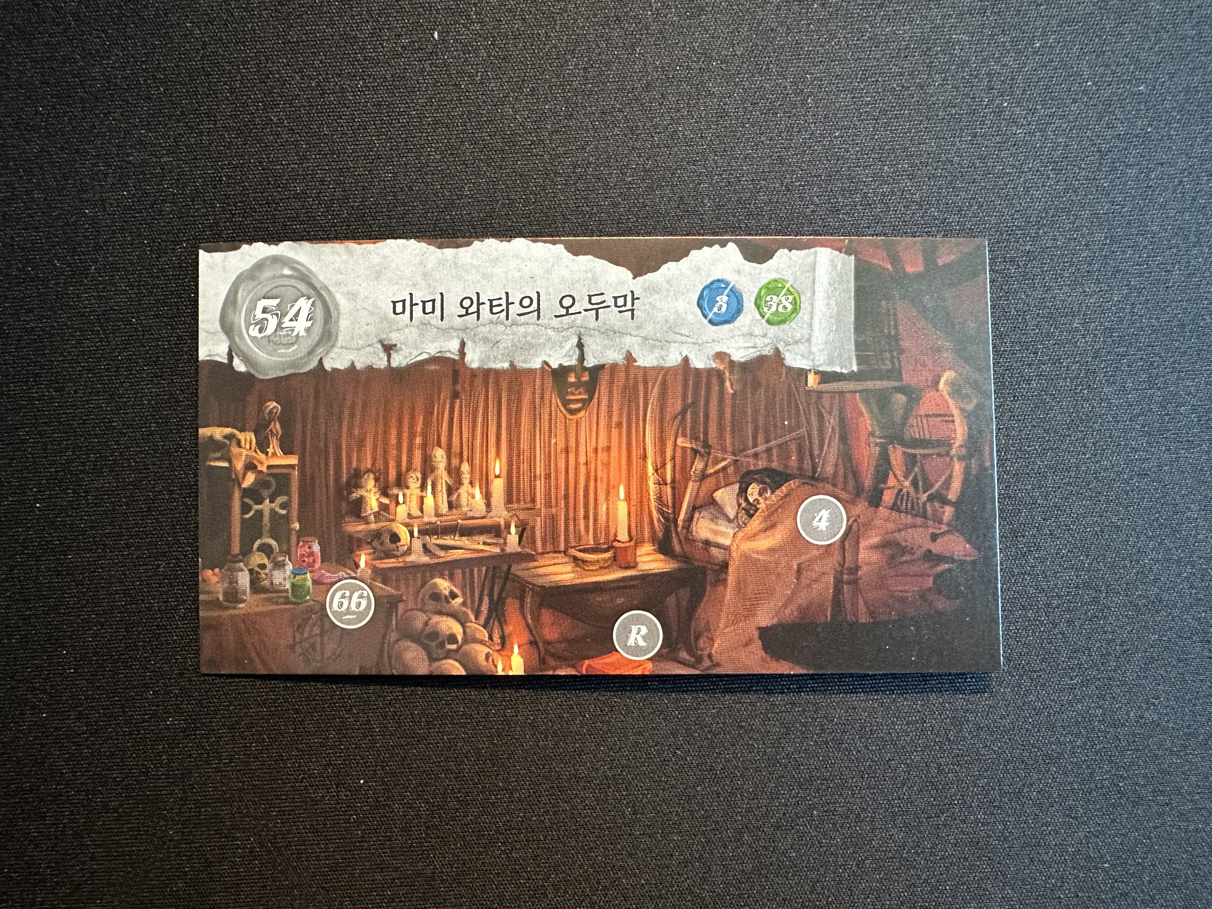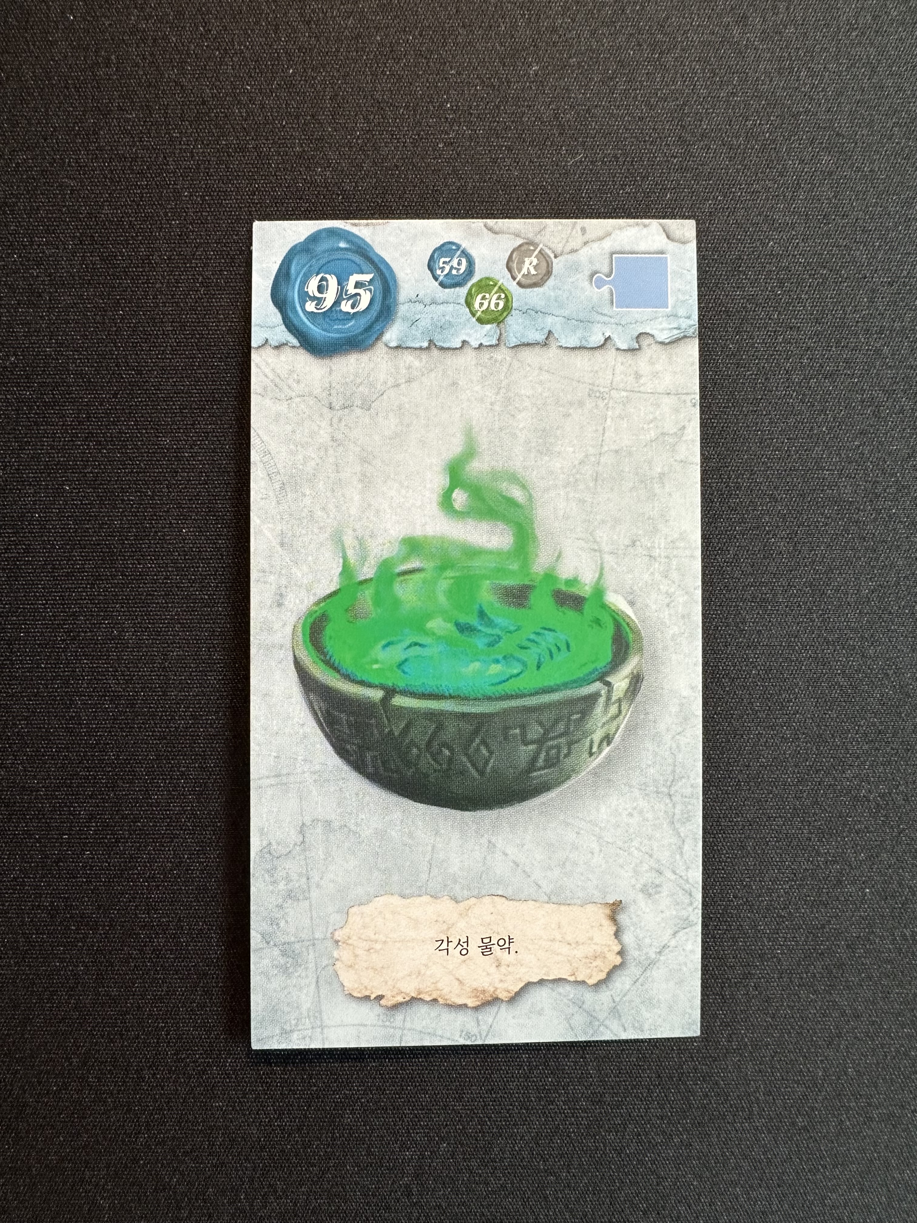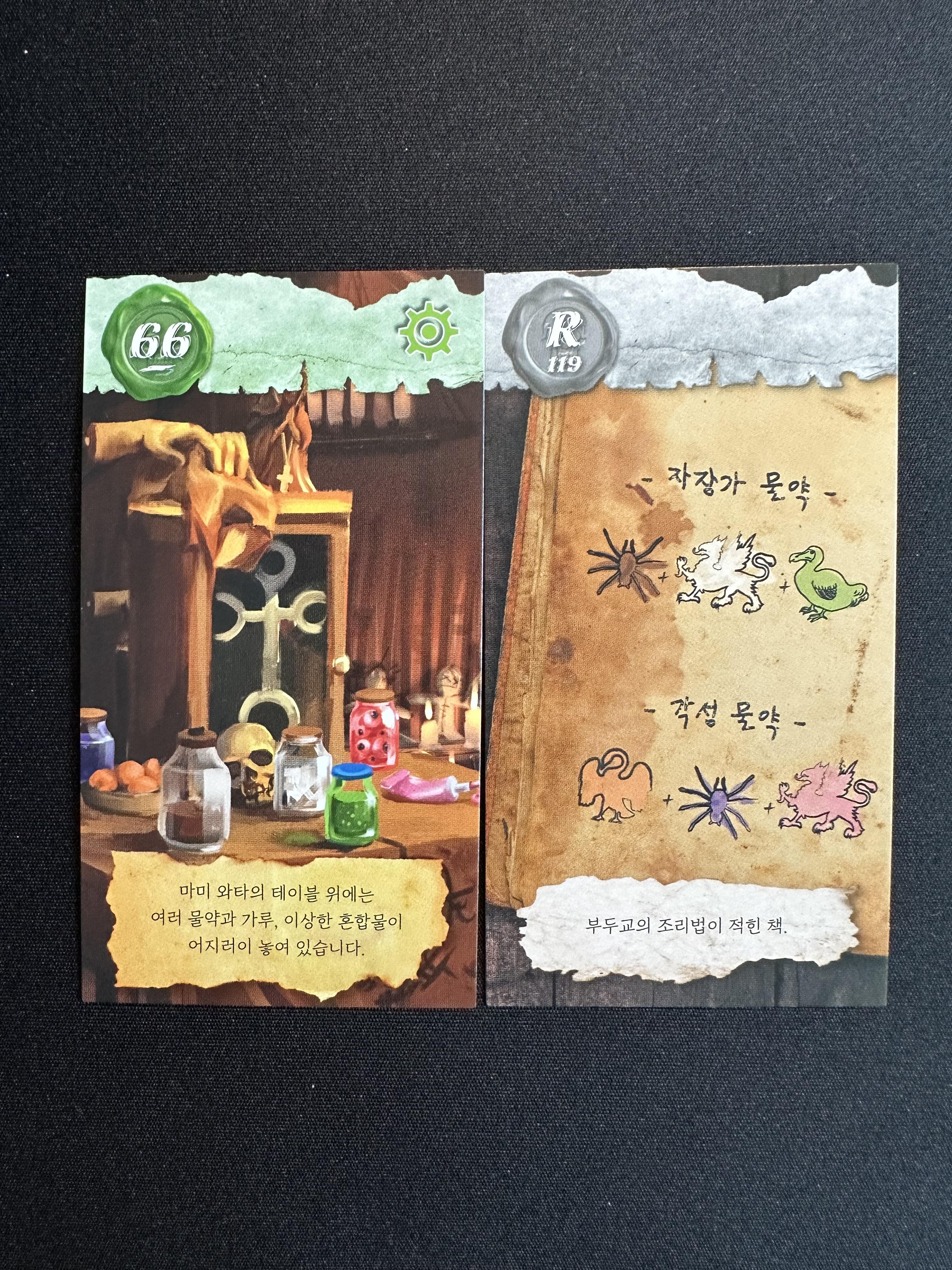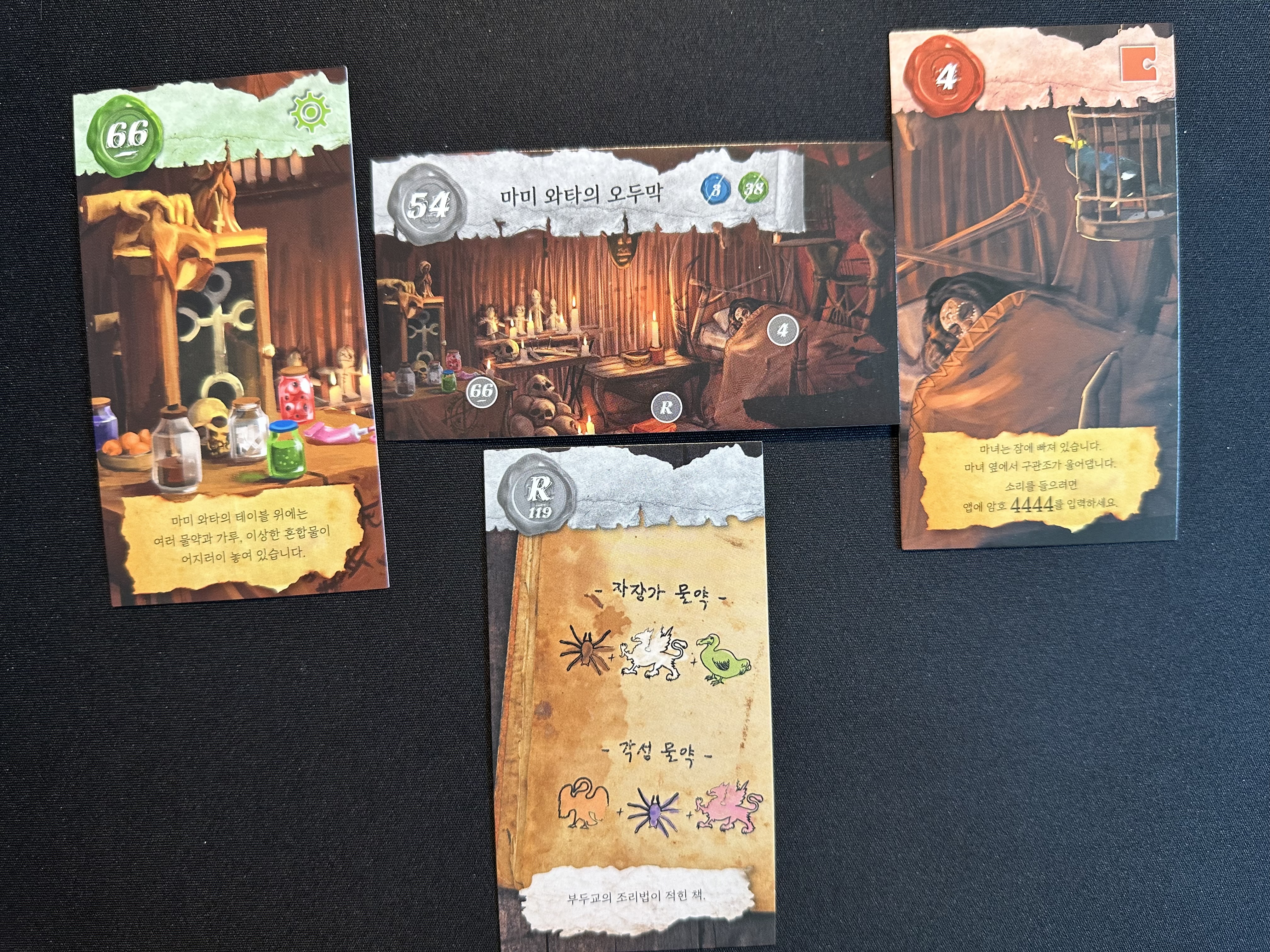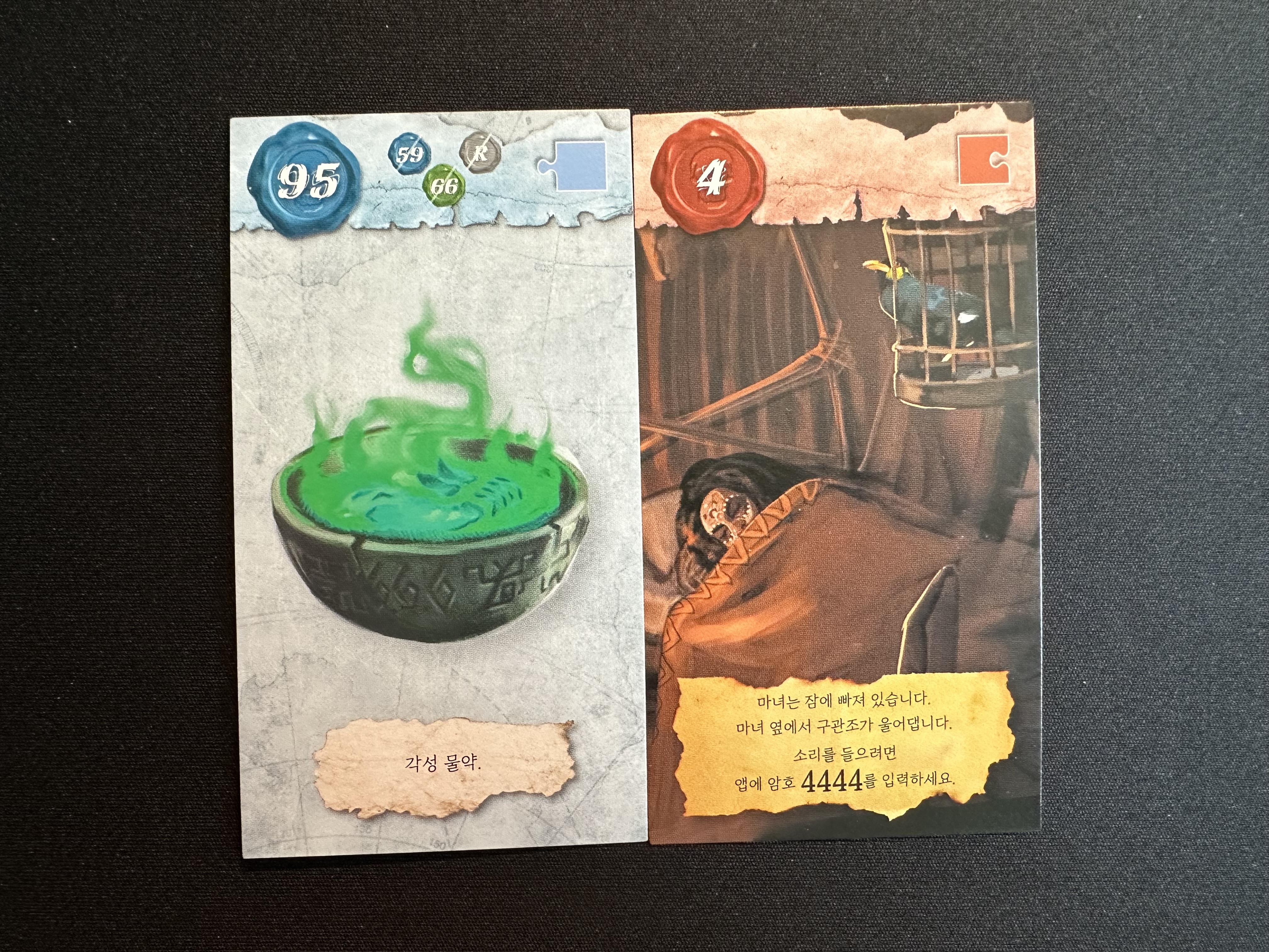앱에 4444를 넣어서 앵무새의 말을 들어보면 '다리 어찌게이래'라고 하는 것을 알 수 있다. 솔직히... 다리를 제외하고는 뭐라고 하는지 전혀 알 수 없기 때문에 혼동이 온다. 하지만 66번과 R의 카드를 잘 살펴보면 각각의 물약과 조합법에 그려져 있는 문양의 색이 어느 정도 일치한다는 것을 알 수 있다.