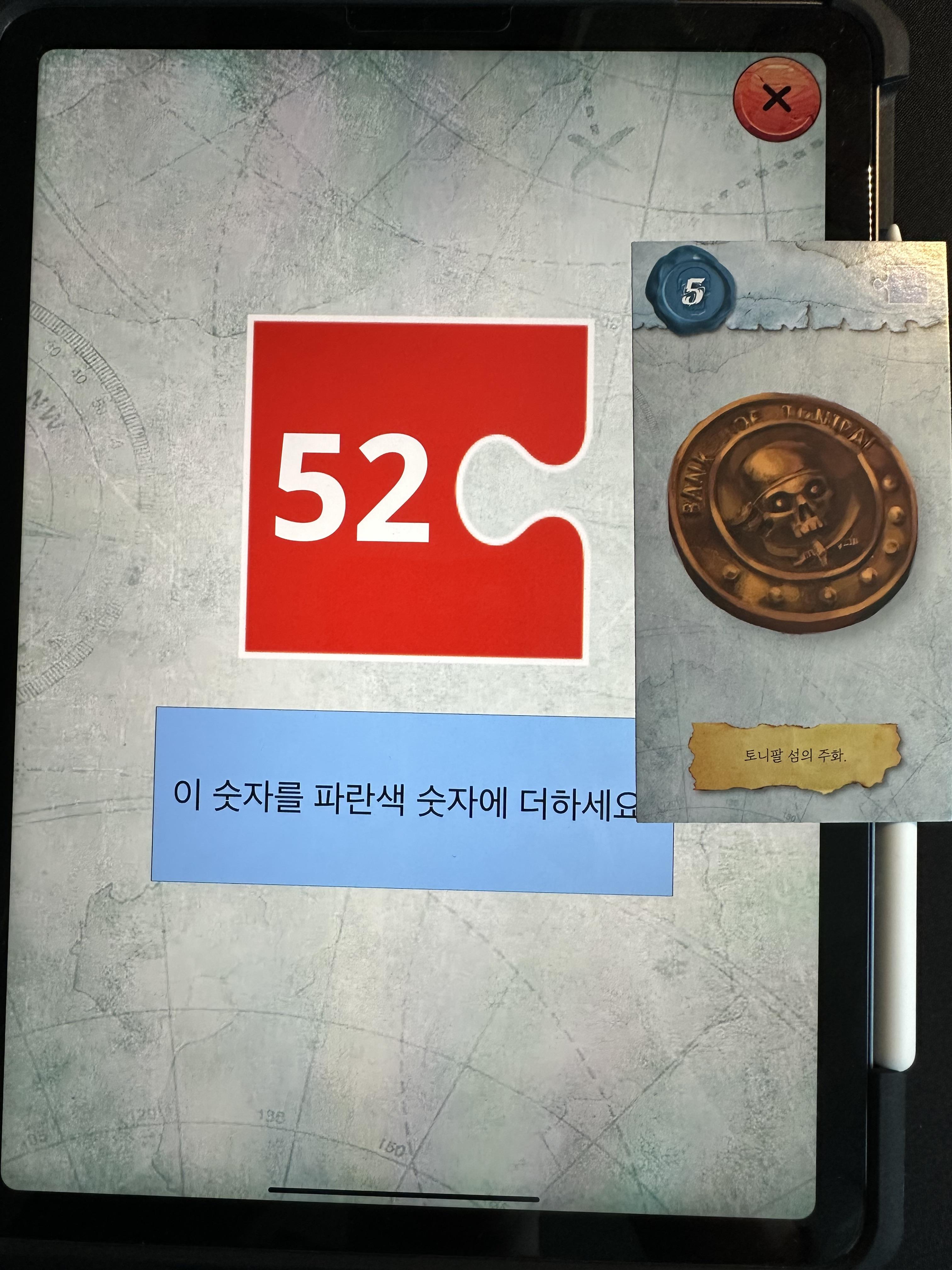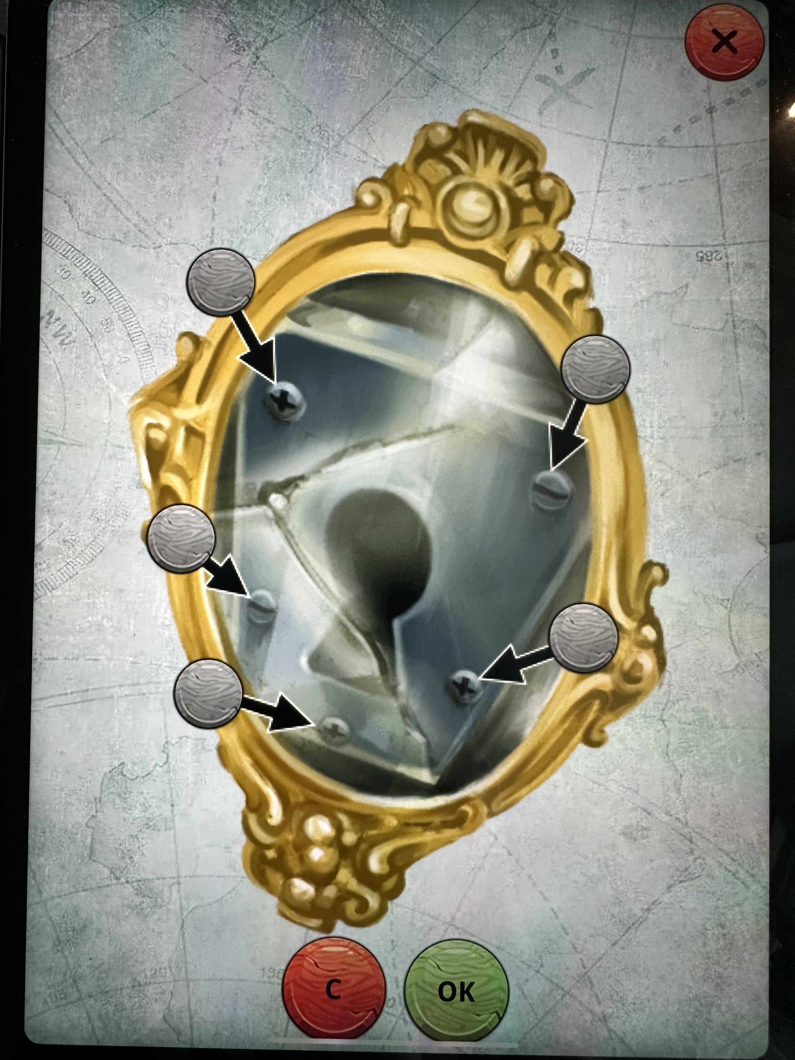98번의 기계장치를 앱에 입력을 하면 십자와 일자 나사가 잠금장치에 있는 것을 볼 수 있는데 우리가 가지고 있는 5번 카드의 동전을 사용하면 일자 드라이버의 역할을 할 수 있다는 것을 유추해야 한다. 그래서 일자 나사만 눌러서 OK를 누르게 되면 빨간색 52번이 나오고 동전 5와 합쳐 57번 카드를 뽑으면 된다.