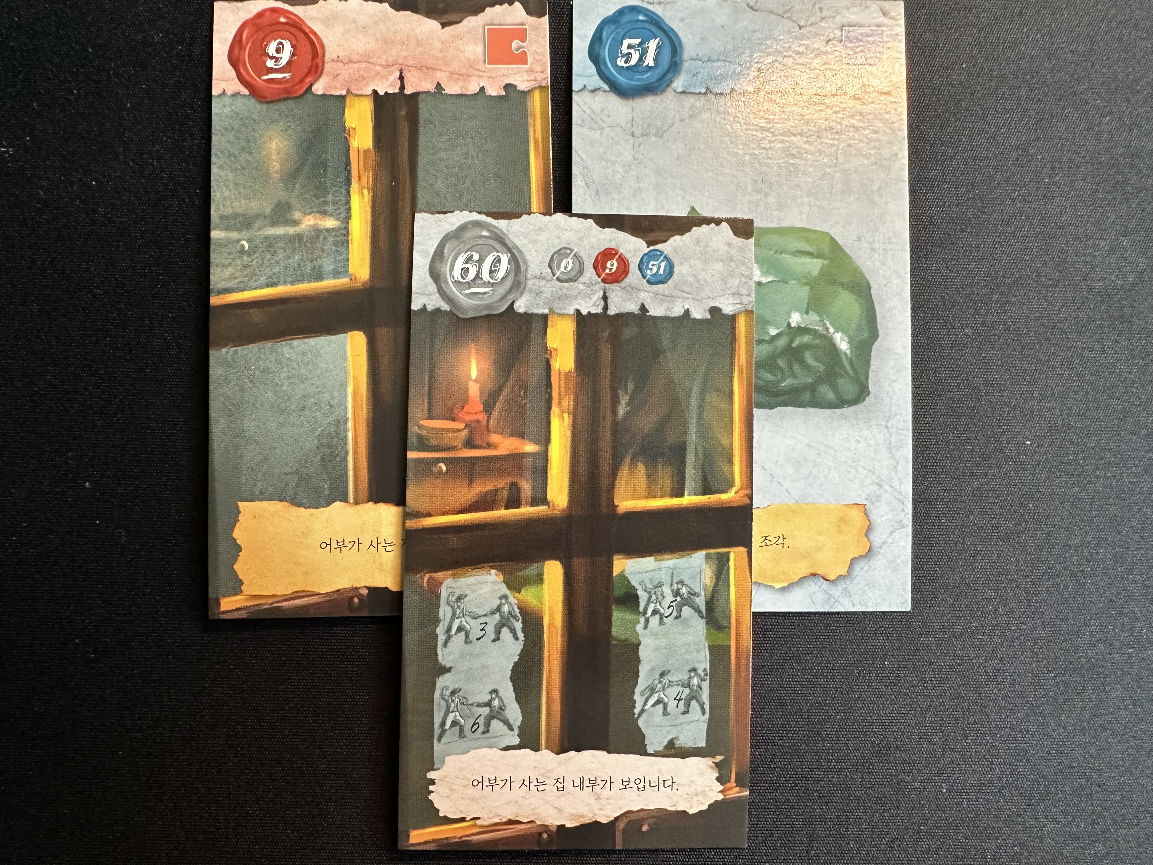 사실 이 어부가 사는 집 창문에서 얻는 정보는 경비병에게 이길 방법이기 때문에 만일 경비병을 말로 이길 자신이 있다면 굳이 조합하지 않아도 된다. 하지만... 한 번이라도 틀리면 바로 경비병과 싸워야 하기 때문에 일단은 보험으로 정보를 얻어놓는 게 좋을 수도 있다. 카드를 잘 보면 창문이 더럽다는 것을 알 수 있는데 이 창문을 닦을 무언가를 얻어야 한다.