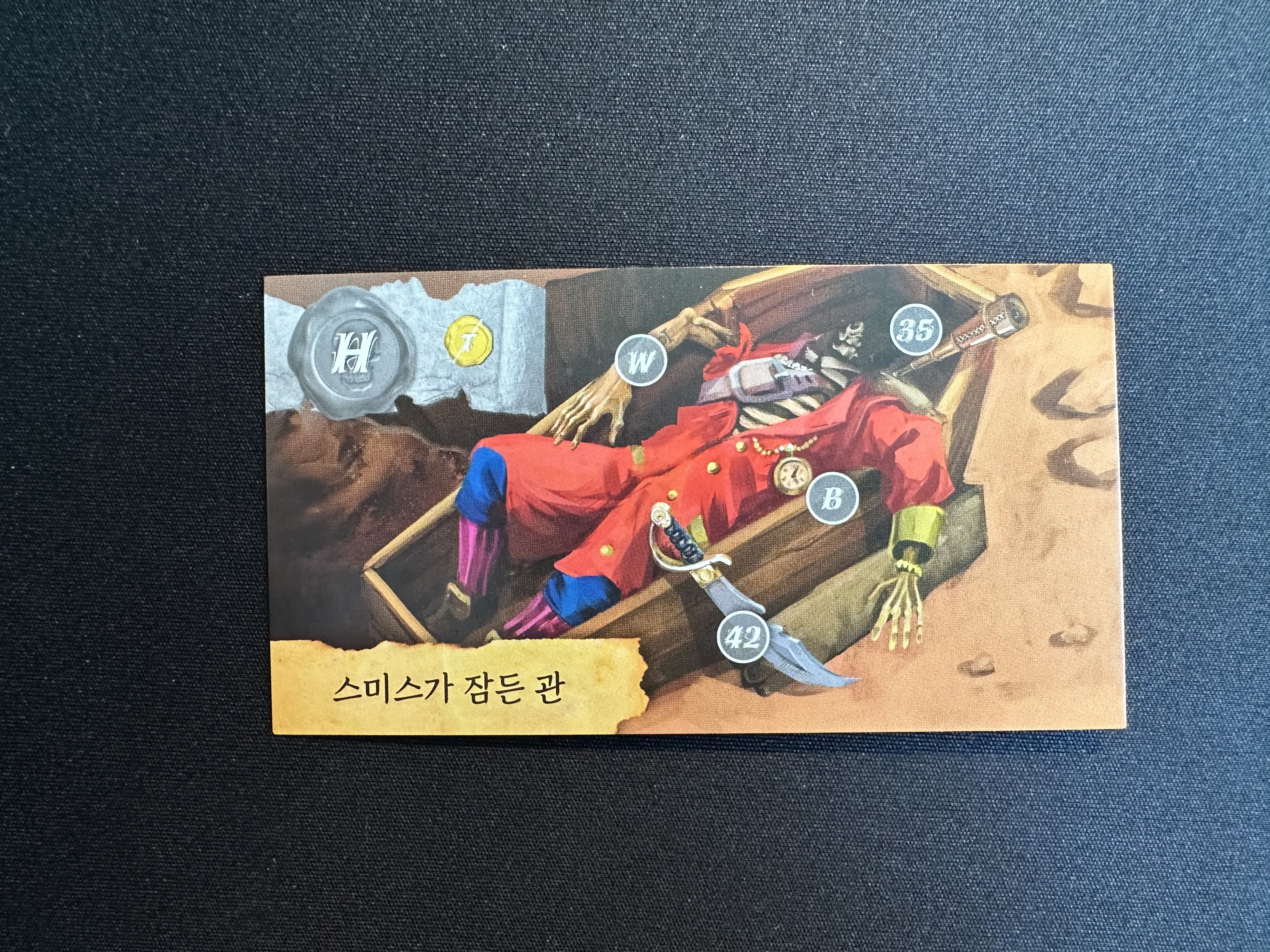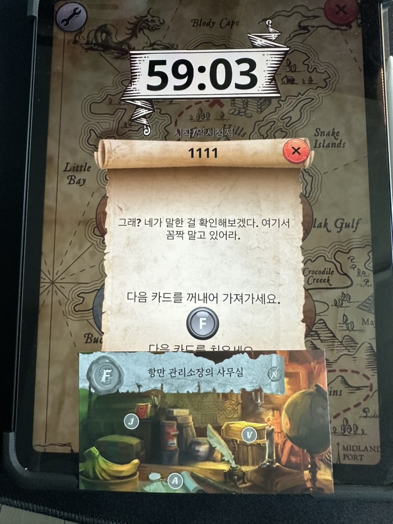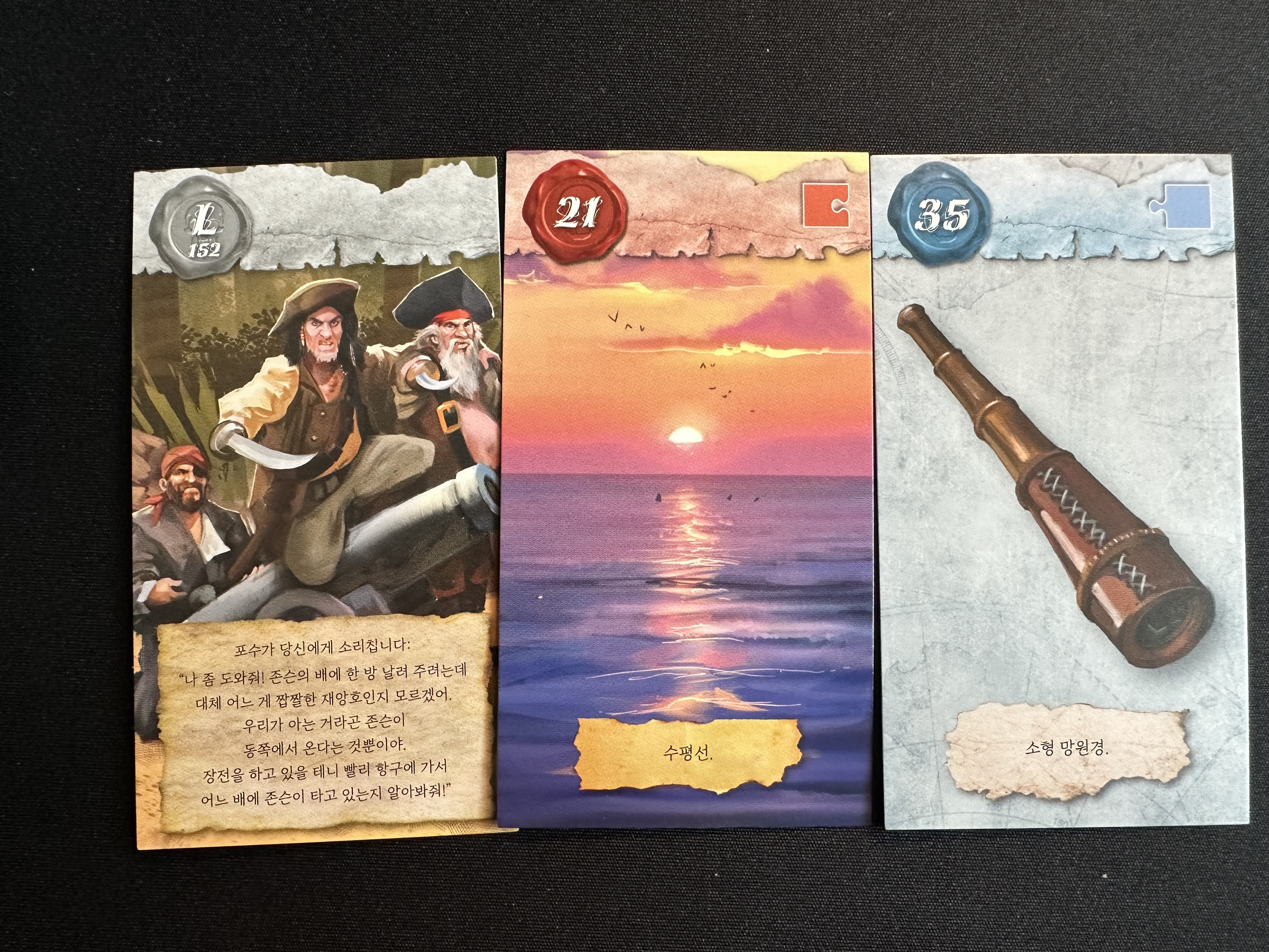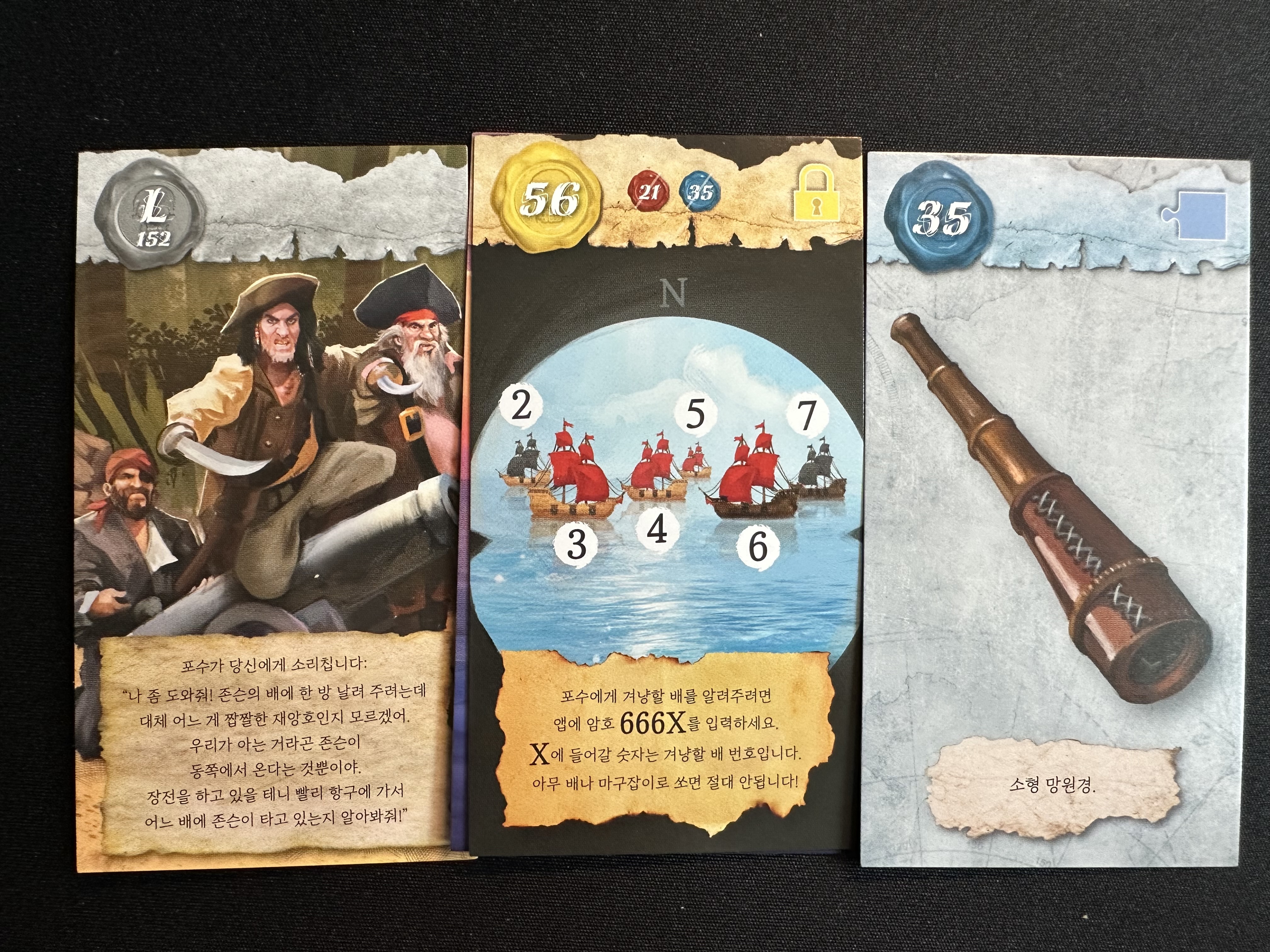 작은 만에서 아마도 이 수평선을 잘 살펴보지 않으면 기껏 조합한 것들을 넣을 곳이 없어서 아마도 헤맬 가능성이 아주 크다고 할 수 있다. L카드를 보면 '짭짤한 재앙호'를 존슨이 타고 오고 있기 때문에 격추를 하기 위해 정보를 얻어오라는 이야기를 포수가 하고 있다. 하지만 일단 수평선에 전혀 배가 보이지 않고 있기 때문에 혼동이 될 수 있지만 앞서 스미스 씨의 관에서 나온 망원경을 통해 수평선을 보면 배들이 보이기 시작한다. 21 + 35 = 56