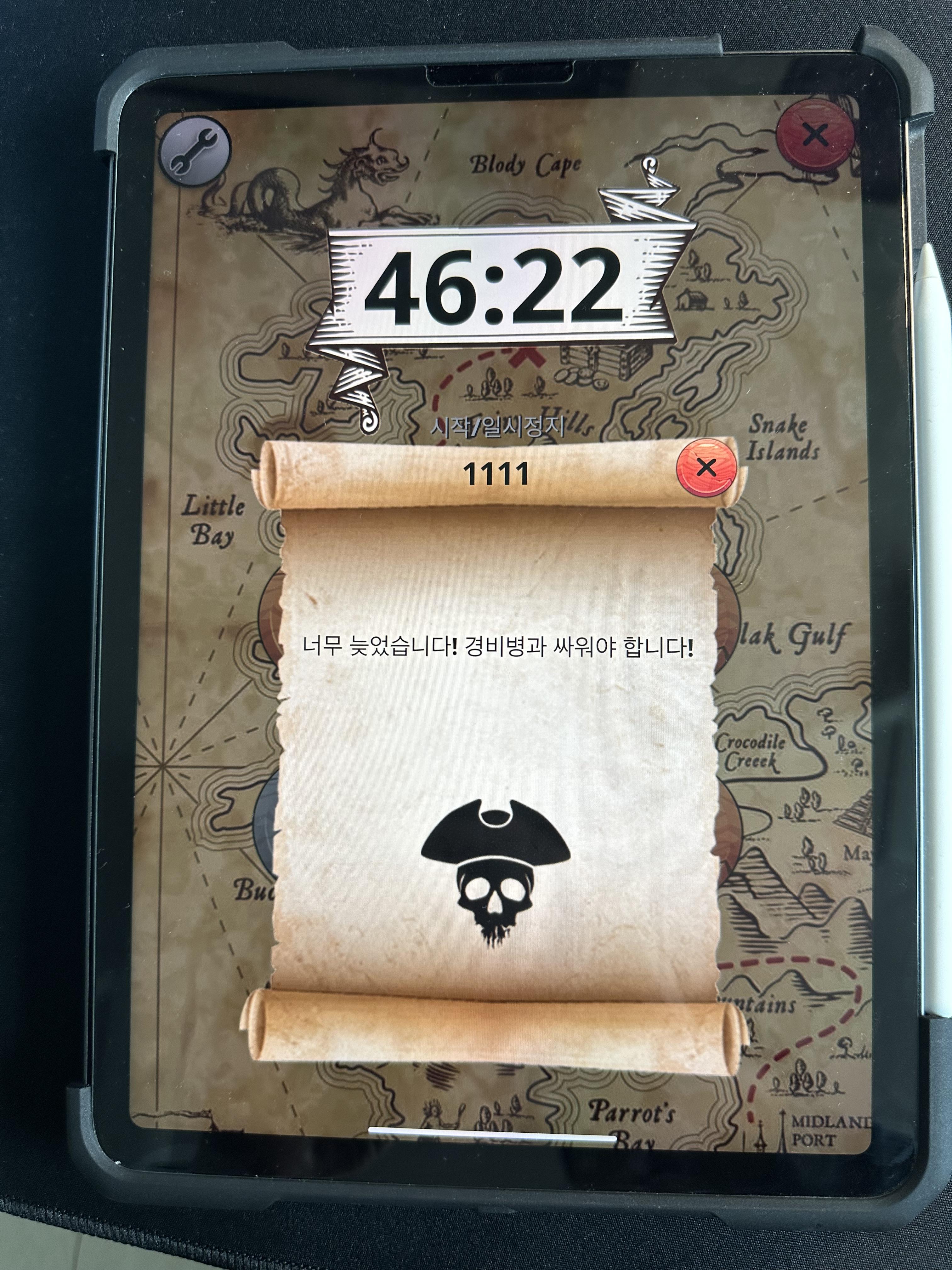 1111을 앱에 넣으면 경비병과 말이 시작된다. (하나라도 틀리면 바로 경비병과 싸워야 한다.)