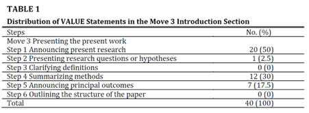 1. 응용언어학 분야의 논문 20편의 서론에서, value기능이 Move 3의 steps에 발견되는가?